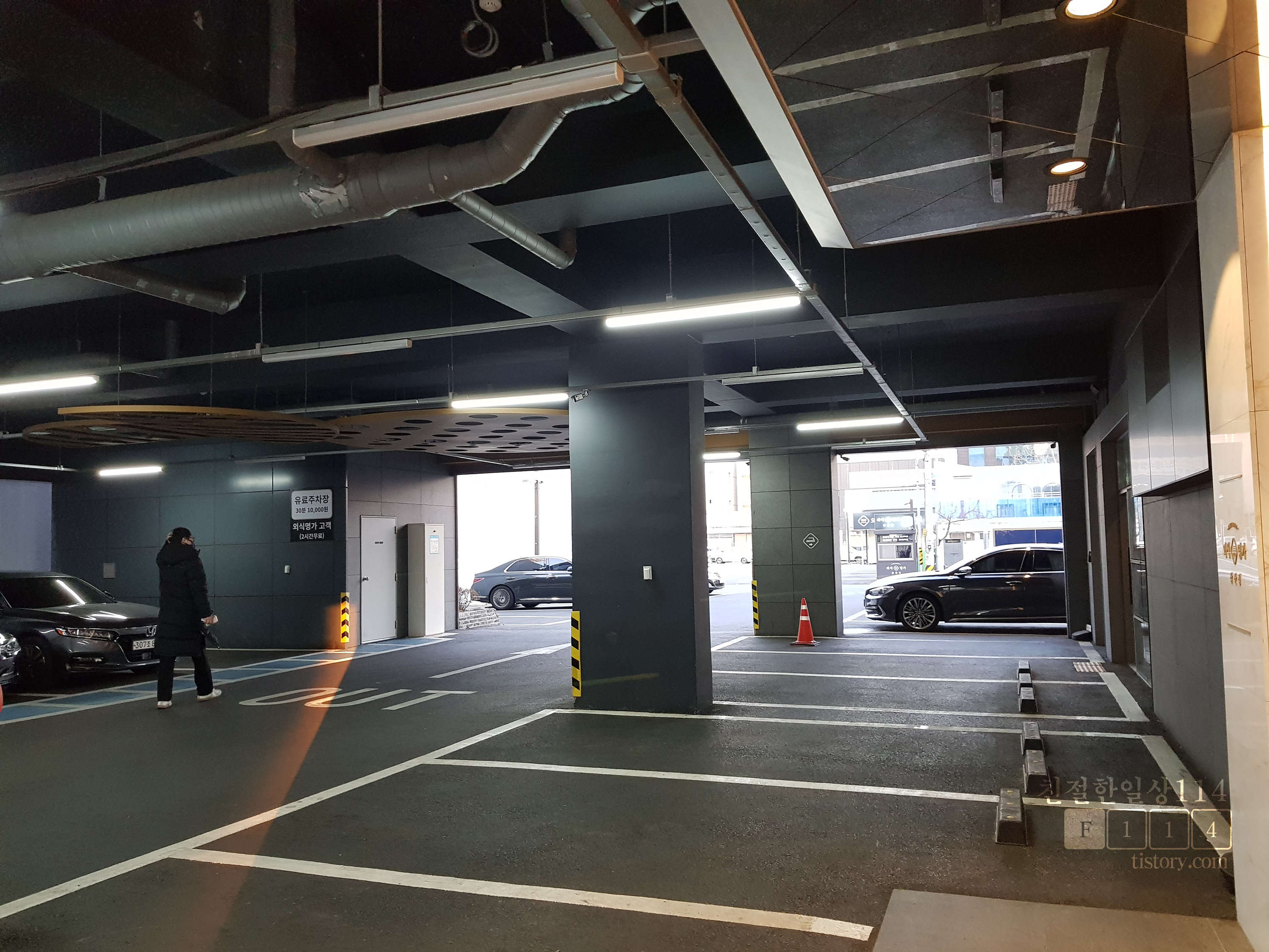 롯데백화점에 주차를 해놓고 걸어간터라 주차장 이용은 하지 않고 건물에 들어가며 보았다. 건물이 필로티 구조로 되어있어 1층에 주차장이 마련되있고 유료주차장도 외식명가 이용자는 2시간 무료주차 가능하고 한다.