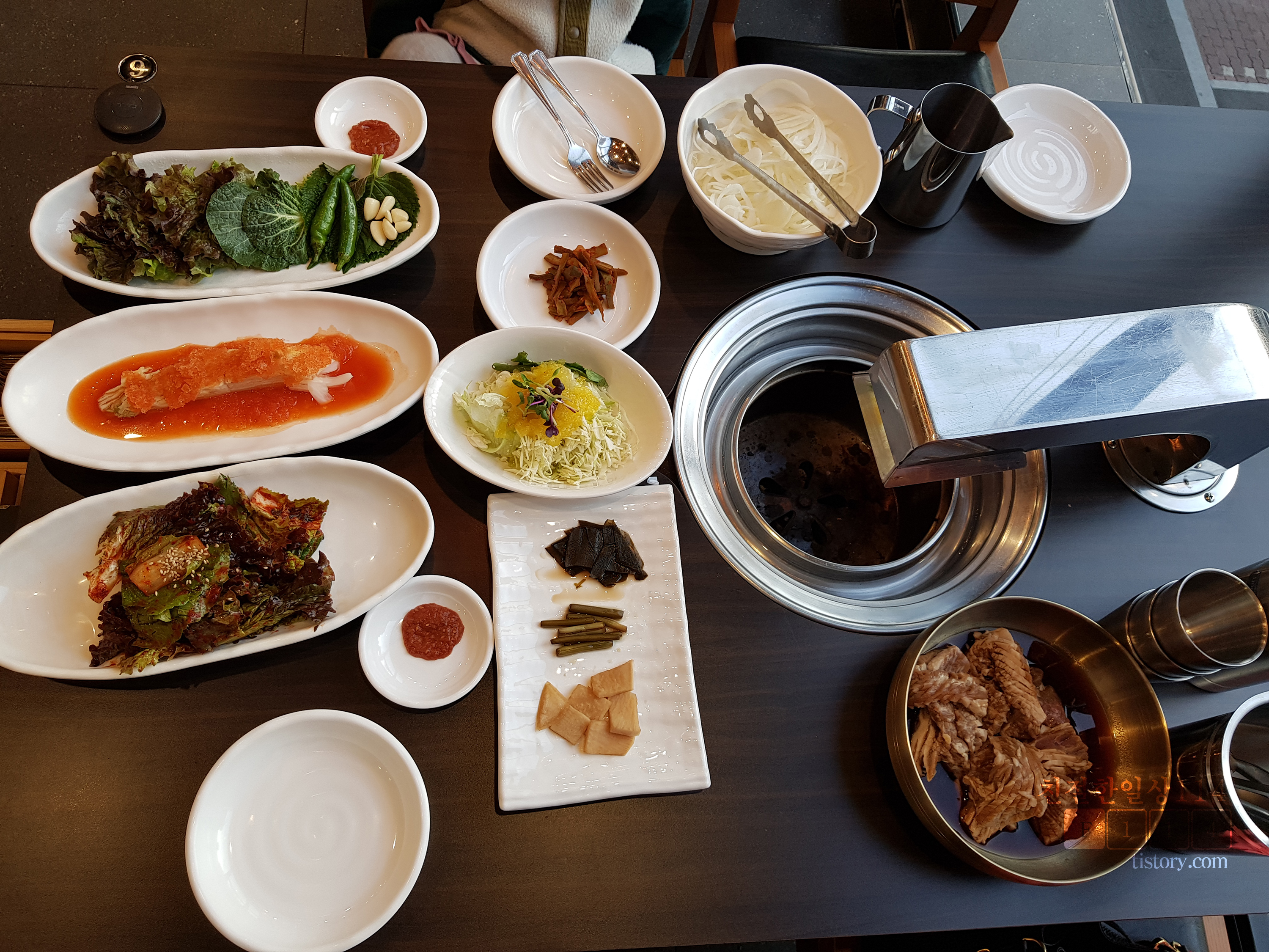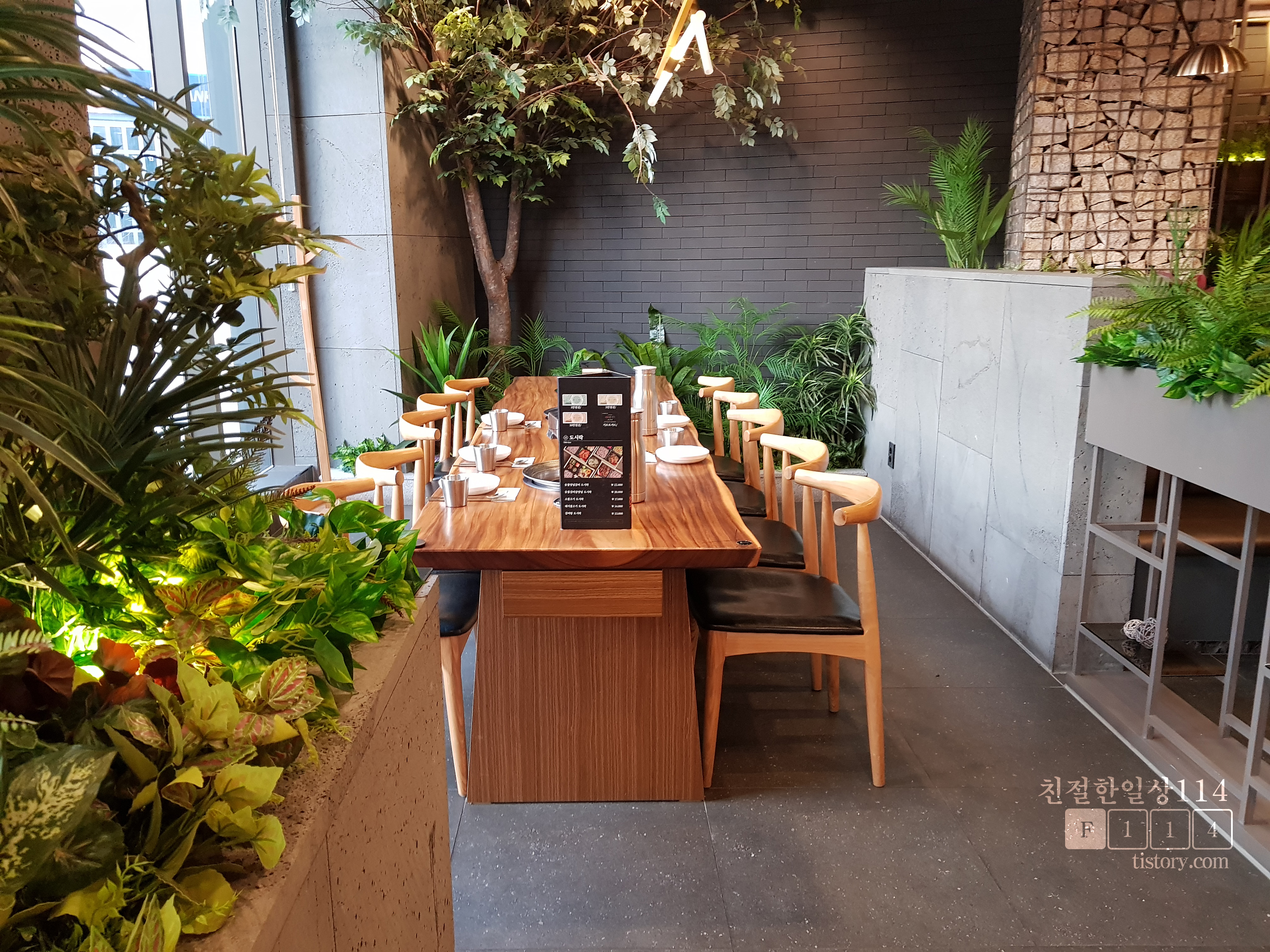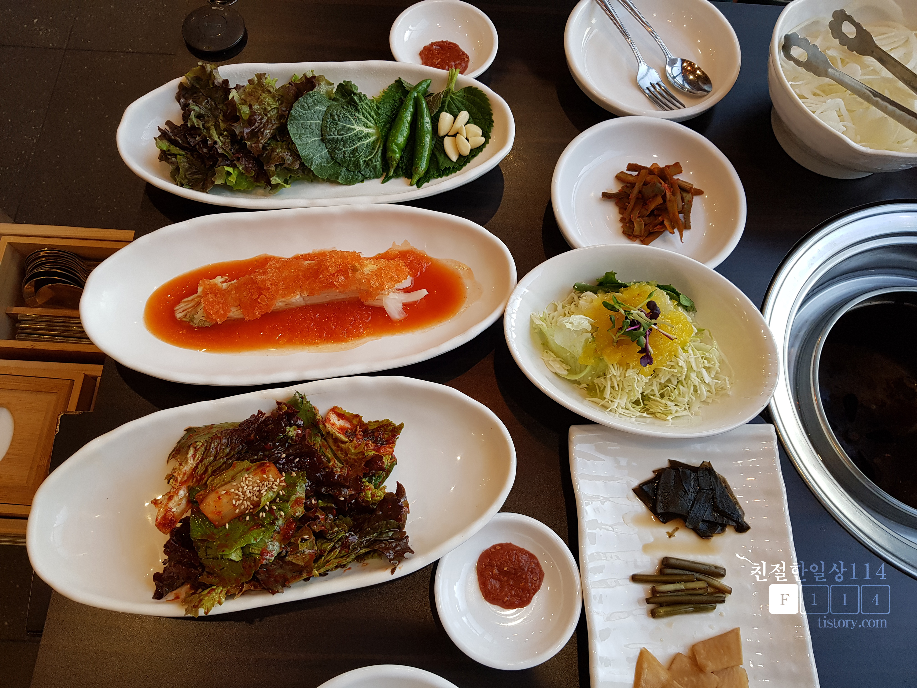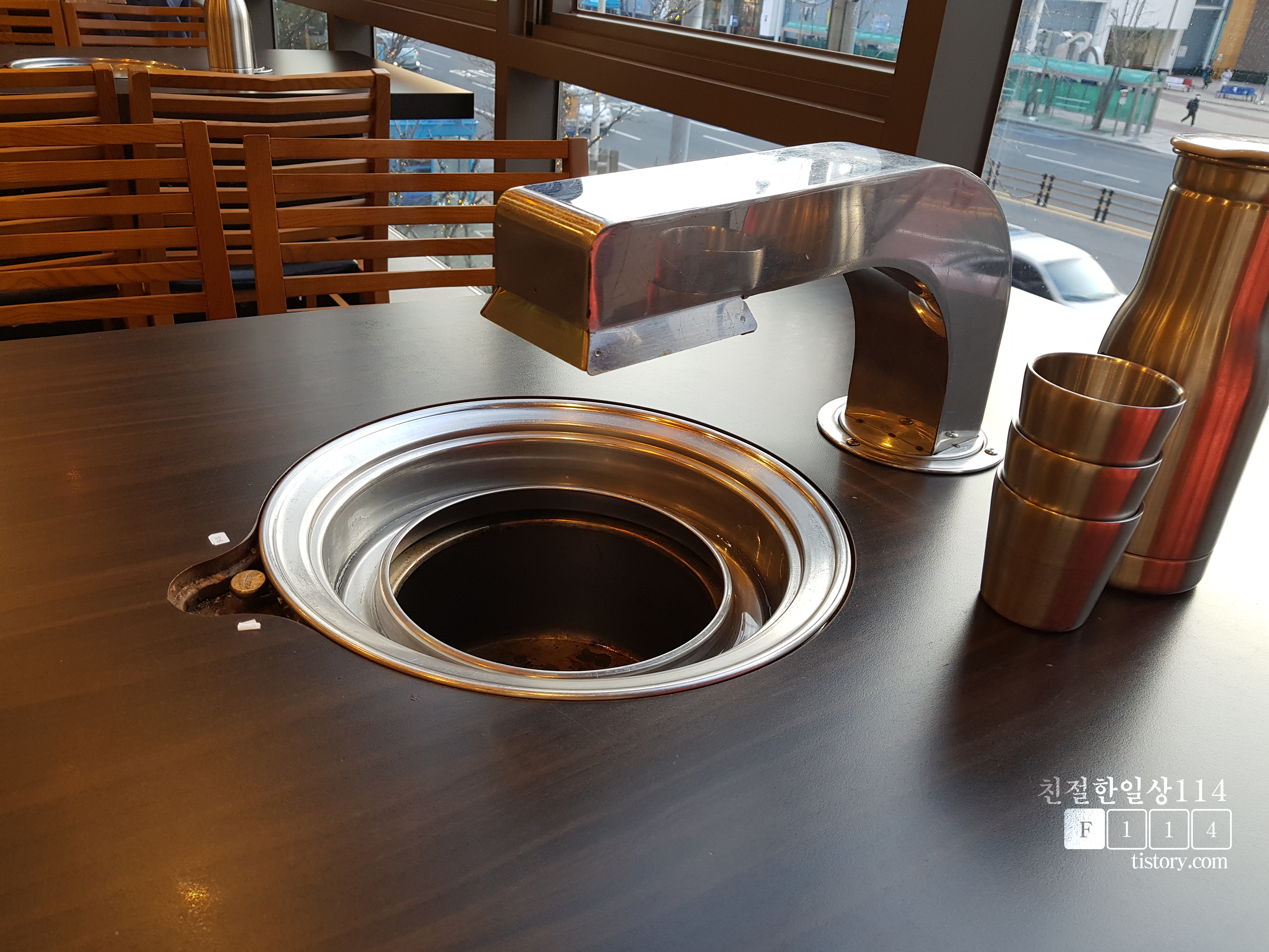 상차림 전 테이블 모습이다. 뭉툭한 수도꼭지 모양을 한 특이하게 생긴 후드인데 성능이 상당히 좋다. 고기 구울때 연기를 아주 잘 빨아들여 실내가 뿌옇게 되지 않는다!