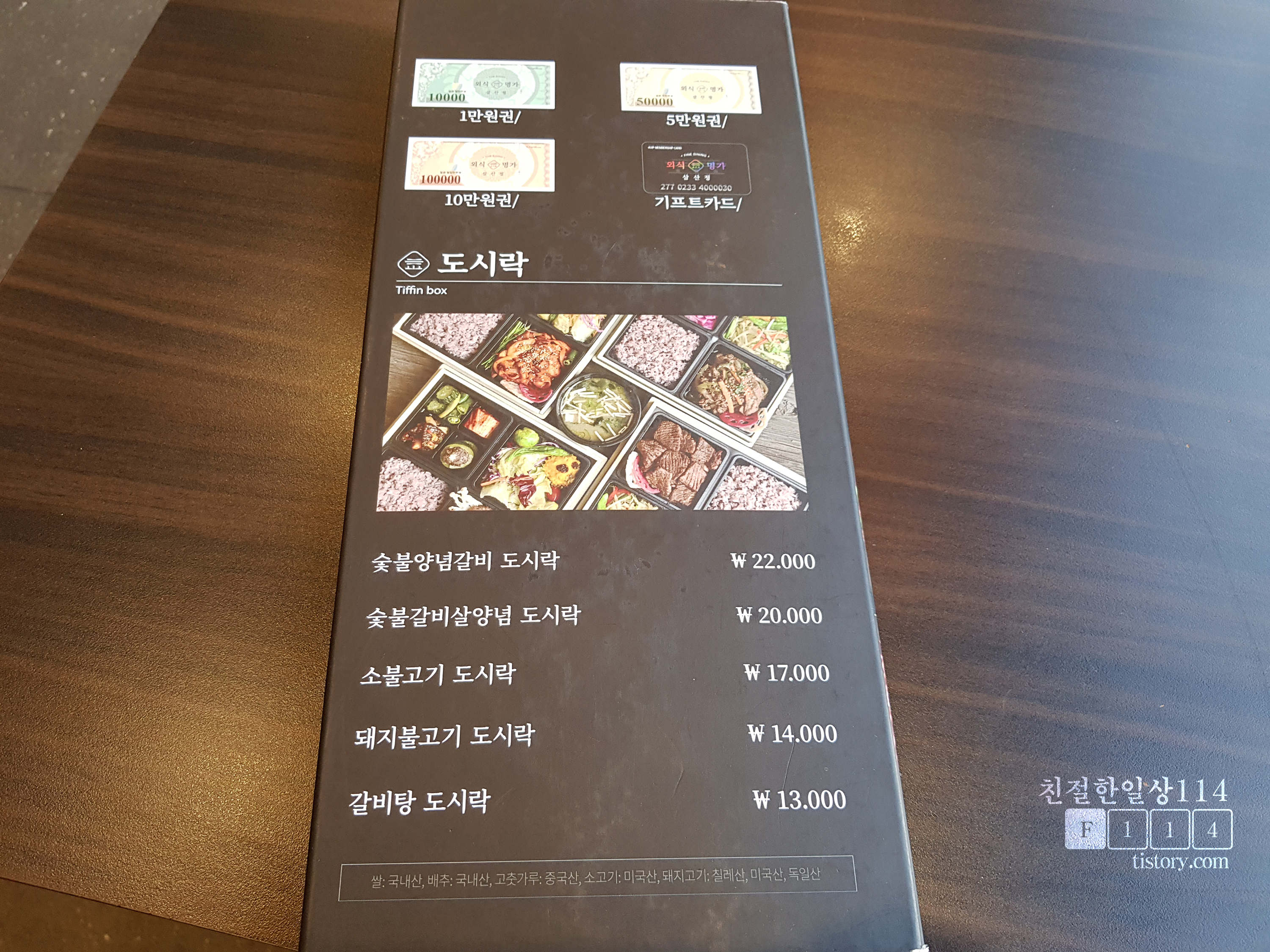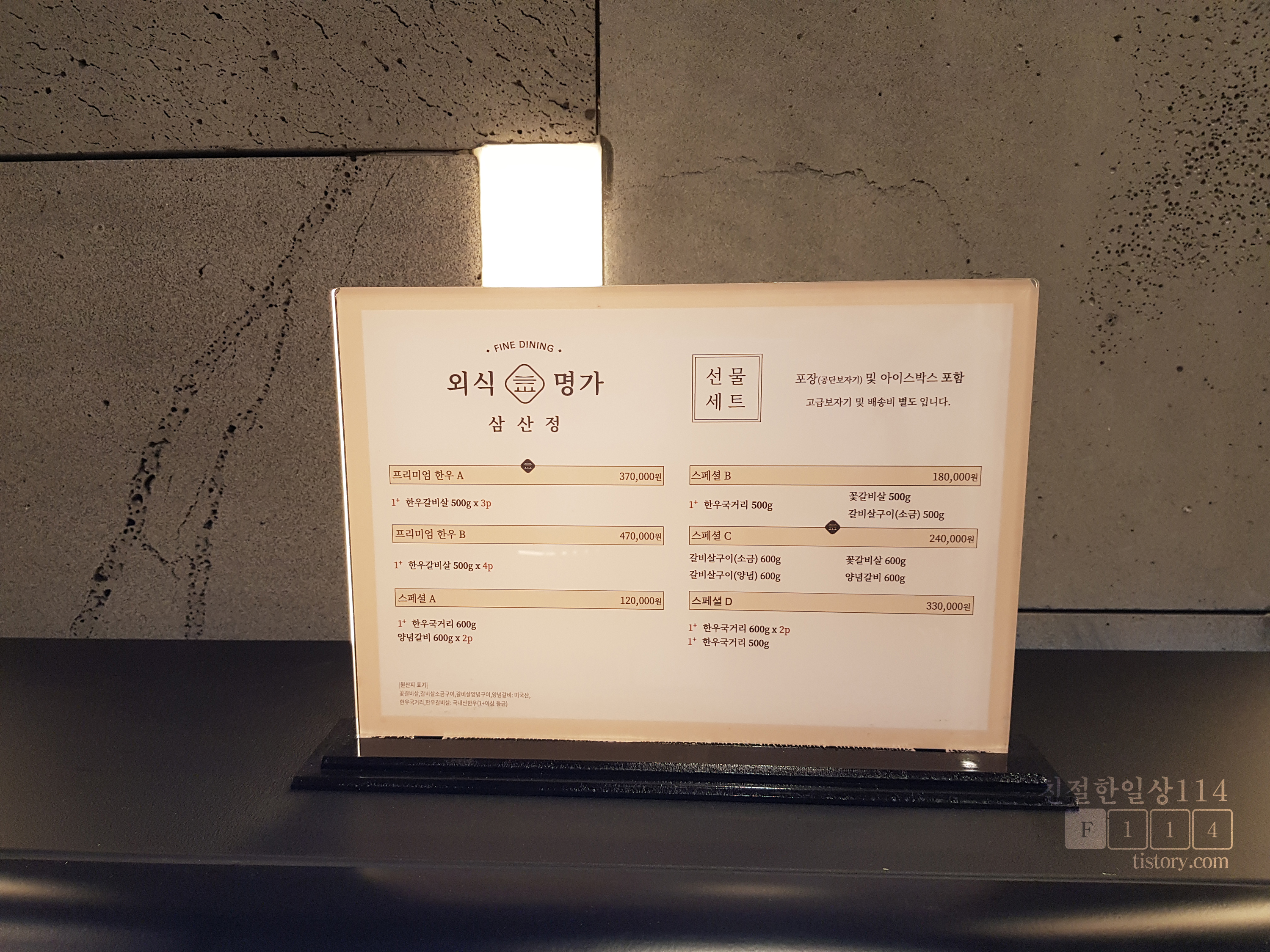 엘베에서 내리니 계단쪽에 선물세트 메뉴표가 있다. 외식명가에서는 선물세트도 판매하는가 보다. 낮은 가격부터 스페셜A 12만원 ~ 프리미엄 한우B 47만원 한우세트라서 가격대가 조금 있는 편이다.