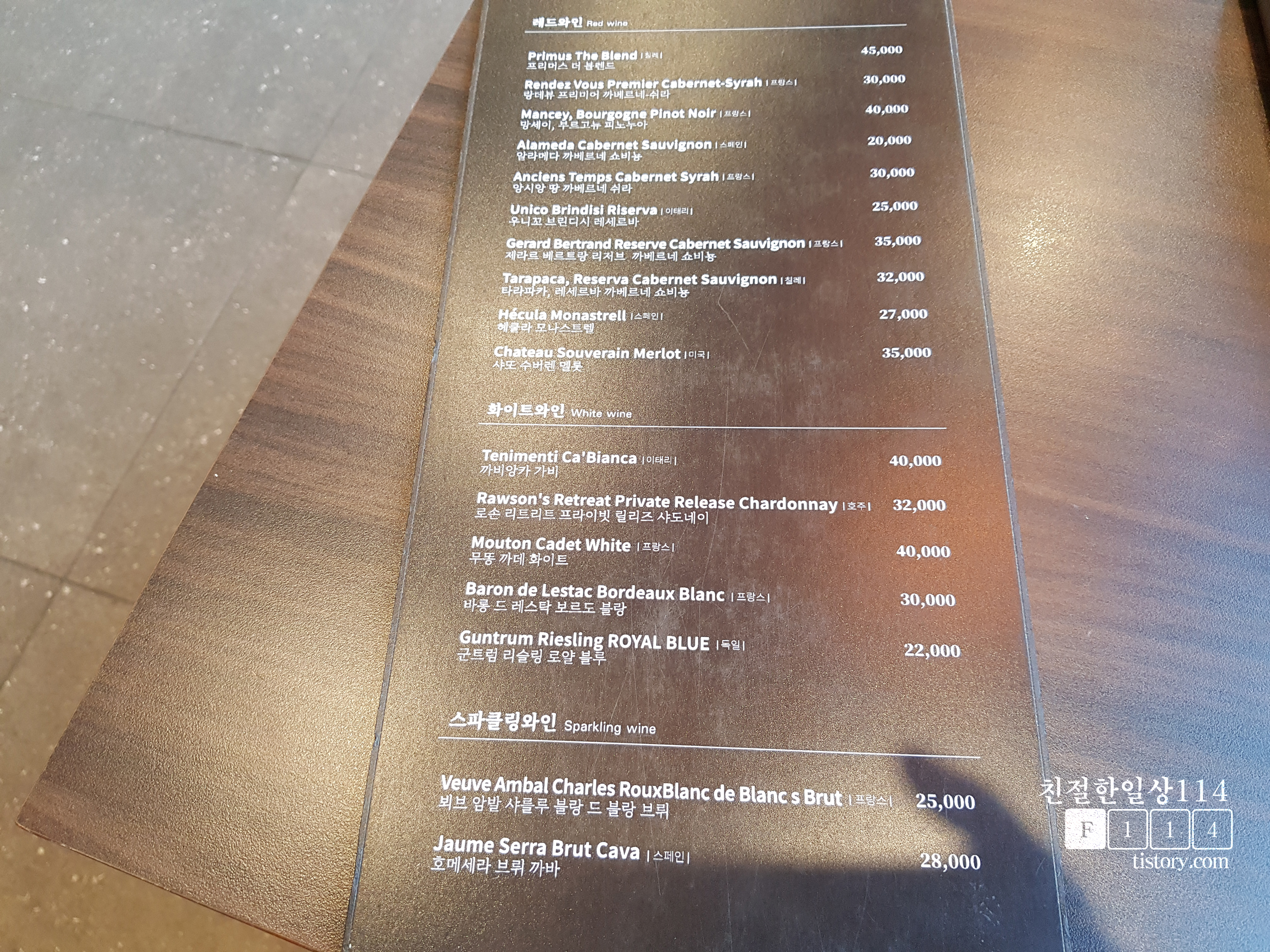 소고기와 레드와인의 조합은 누가뭐래도 최고다. 메뉴판 한페이지는 레드와인과 화이트와인, 스파클링와인이 적혀있다.