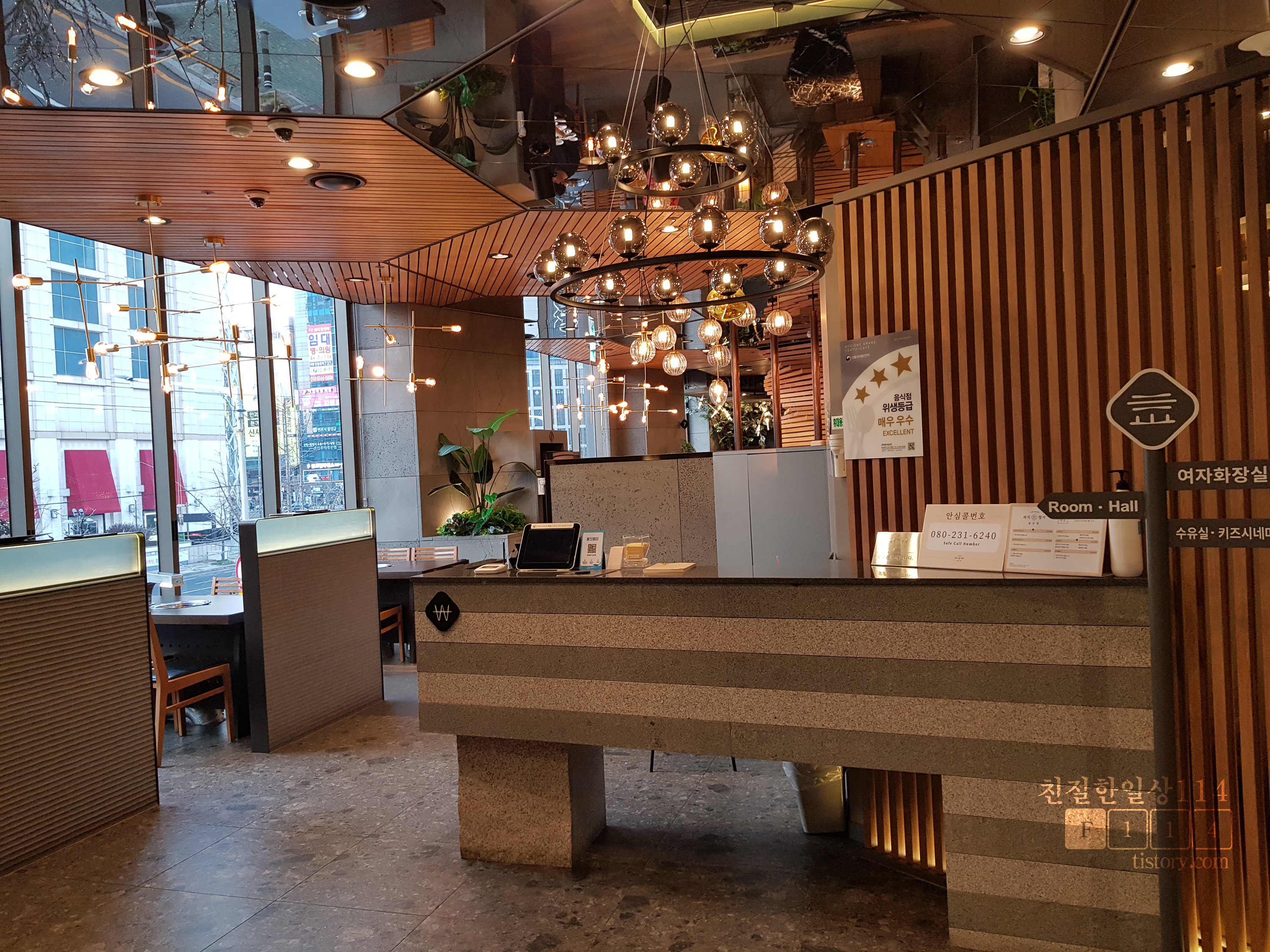 2층 엘리베이터에서 내리면 바로 보이는 카운터. 카운터 뒤 벽면에 붙어 있는 위생등급 매우우수 등급 마크가 붙어있다. 건물 외관도 깔끔하고 내부도 상당히 깔끔하다. 식당에서 이렇게 보여지는 곳이 깨끗하면 내오는 음식도 위생적으로 신경쓸것 같은 인상이 주어진다.