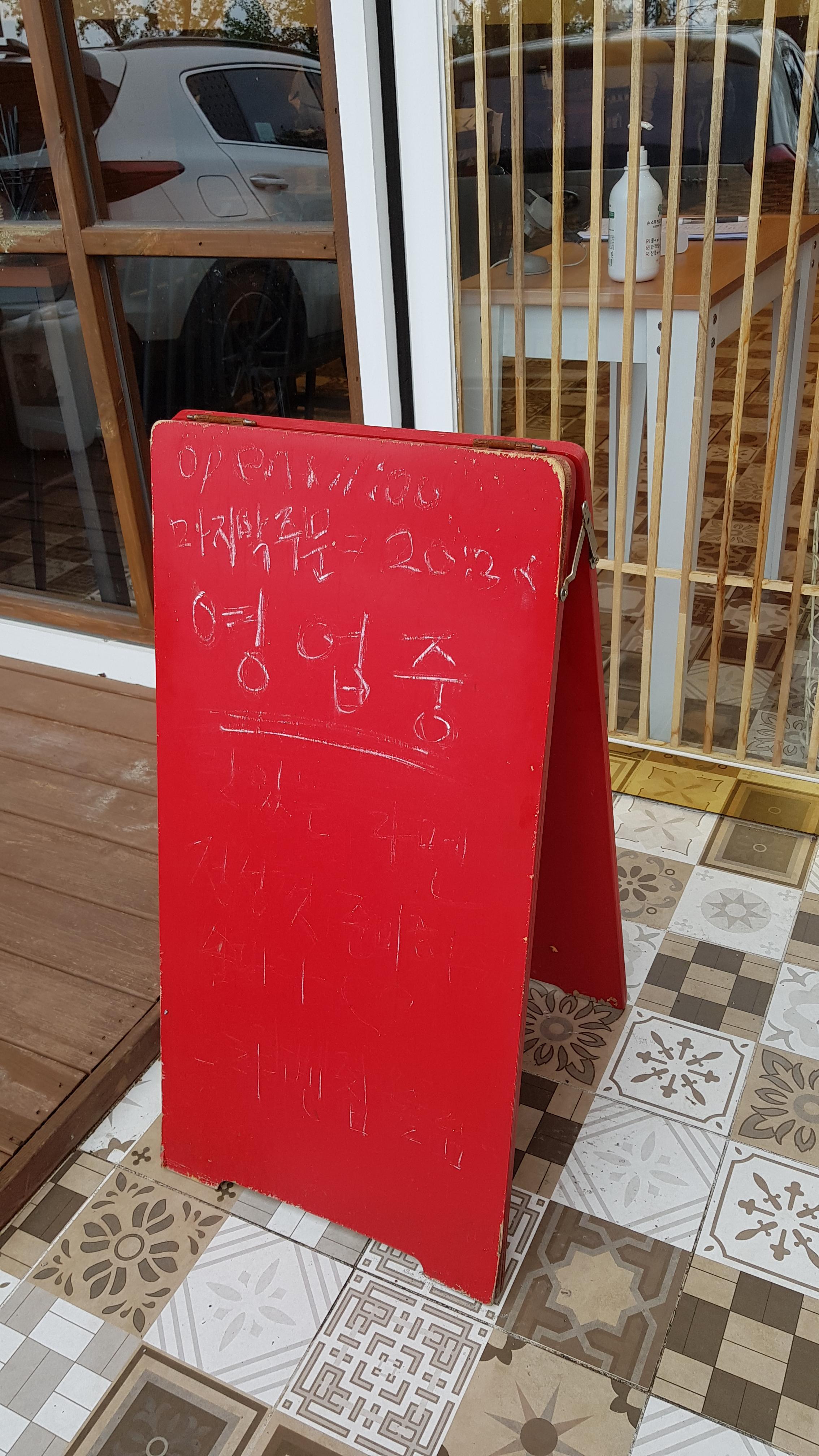 가게 문 앞에 있는 영업시간 안내문. 어제 내린 비에 써놓은 글씨가 지워진듯 흐릿하다. 저녁 9시까지 영업이며 라스트오더는 저녁 8시30분까지 이다.