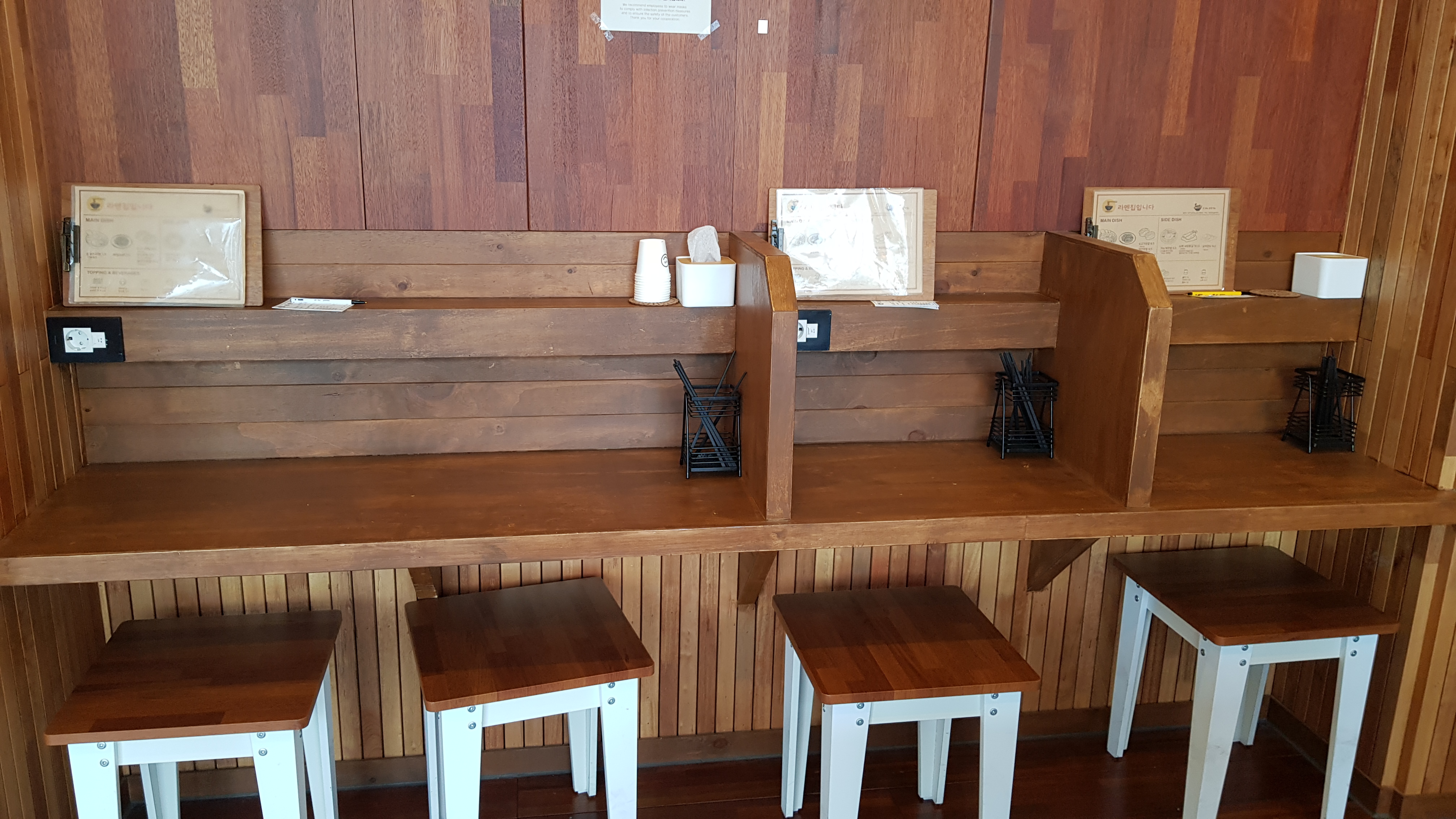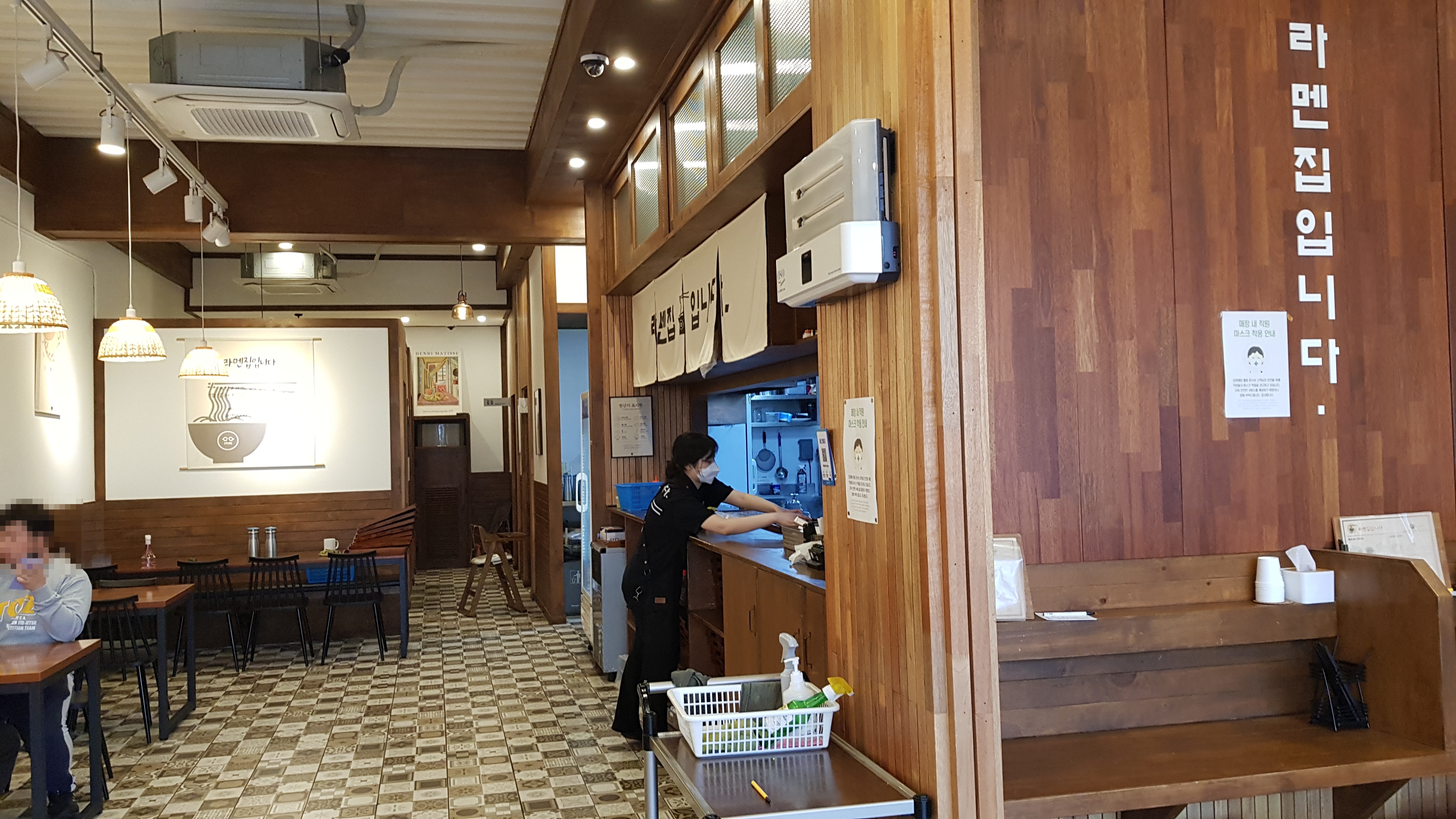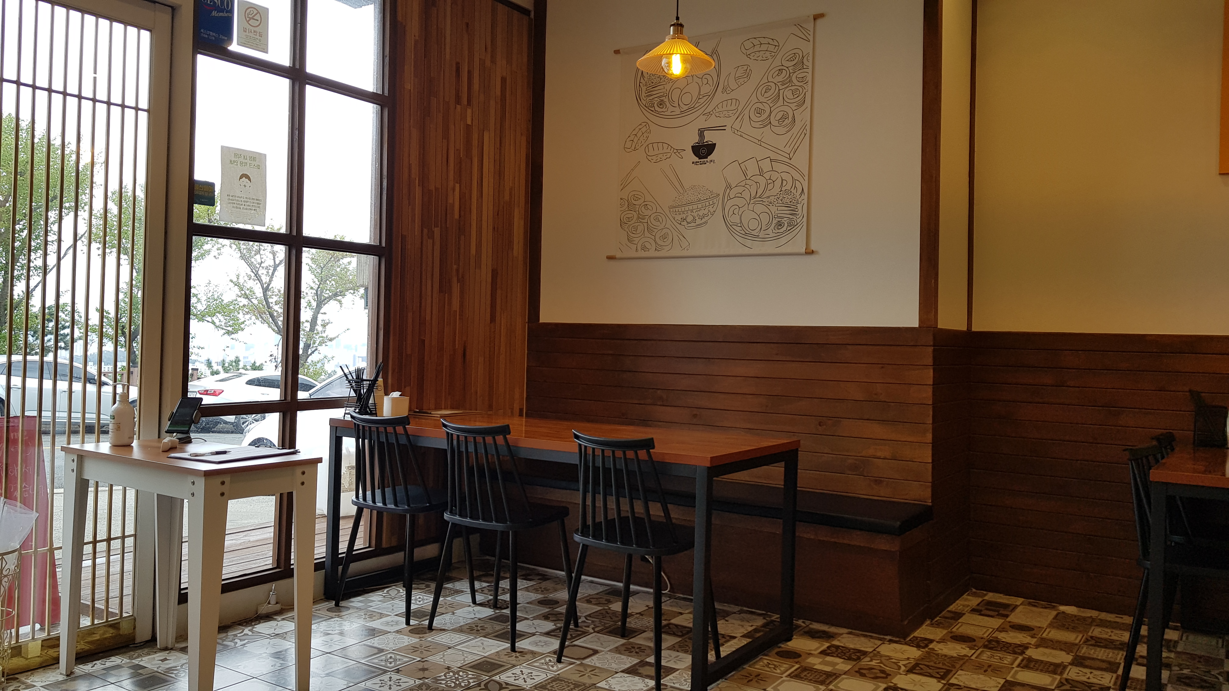 혼자서 와서 부담없이 먹 을 수 있는 1인, 2인 테이블이 마련되어 있다. 코로나로 인한 테이블 사이 방역 칸막이가 따로 필요없는 자리이다.