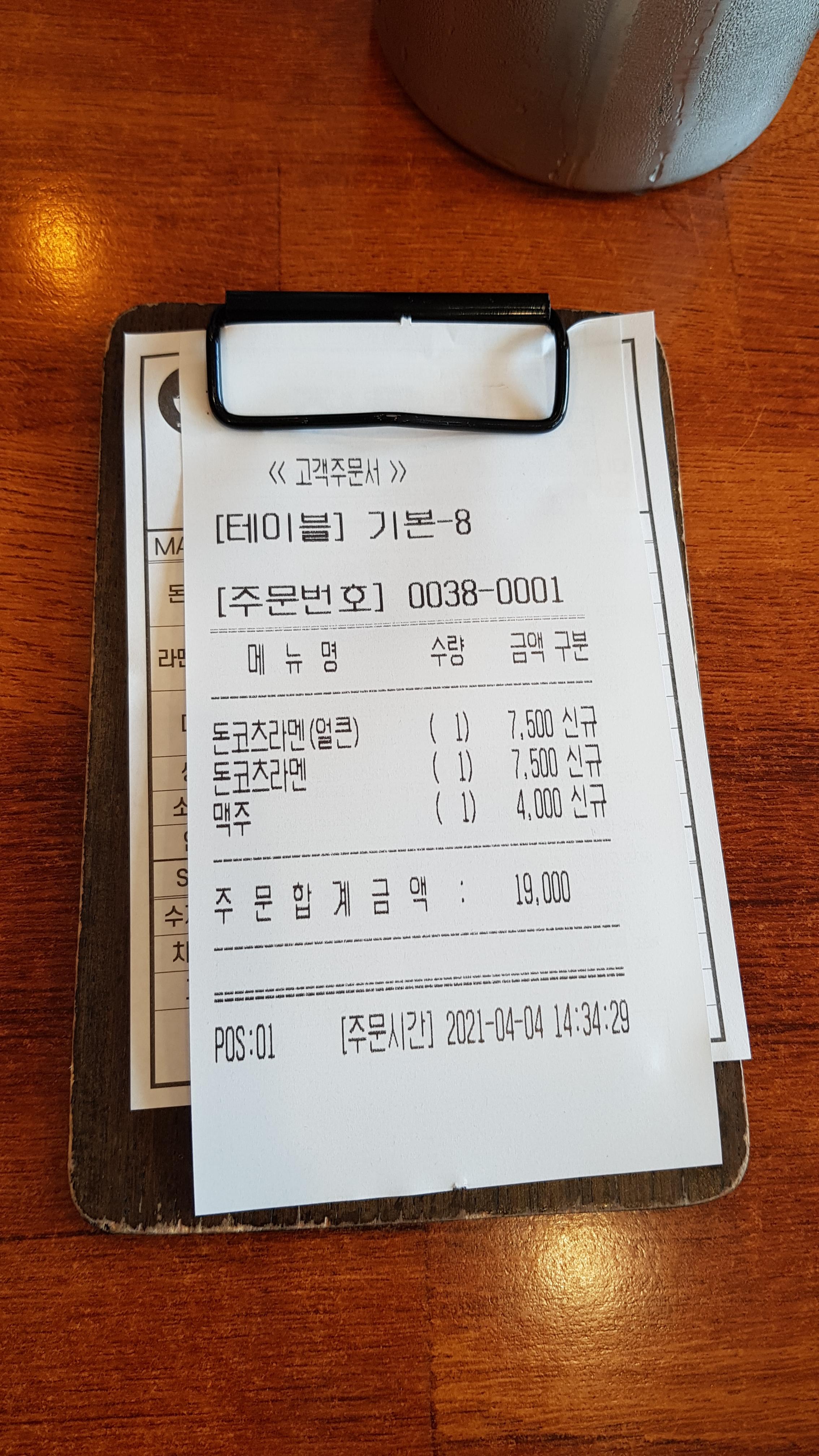 돈코츠라멘 7,500원 2개, 맥주한병 4,000원 합계 19,000원. 맛있게 먹었으니 시원하게 계산하고 나온다.