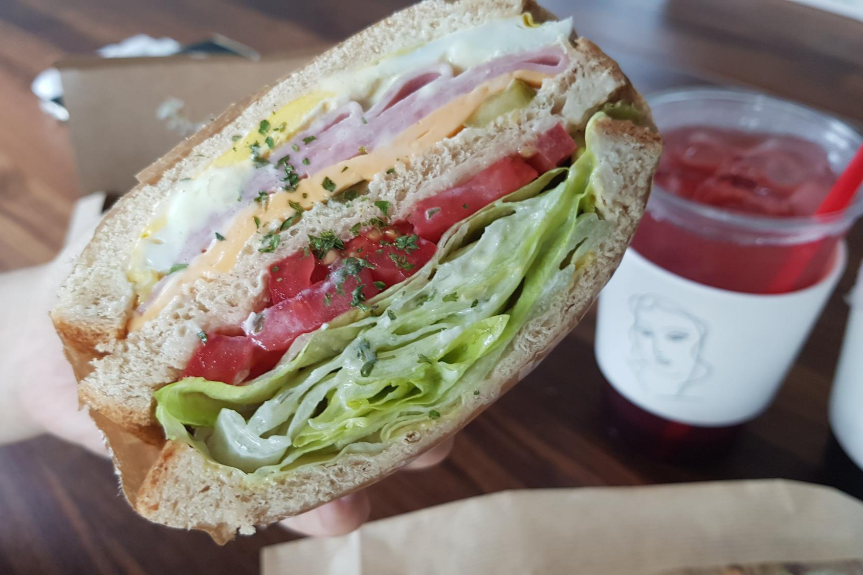 햄치즈에그뚱센을 최선을 다해 한입 먹었다. 두께가 두꺼워서 입을 한껏 벌리고 베어먹어야 이렇게 고스란히 이쁘게 먹을 수 있다. 만약 친해지는 중이거나 편하지 않은 사람과 함께라면 다른 메뉴를 먹는 것이 좋을 듯 하다.