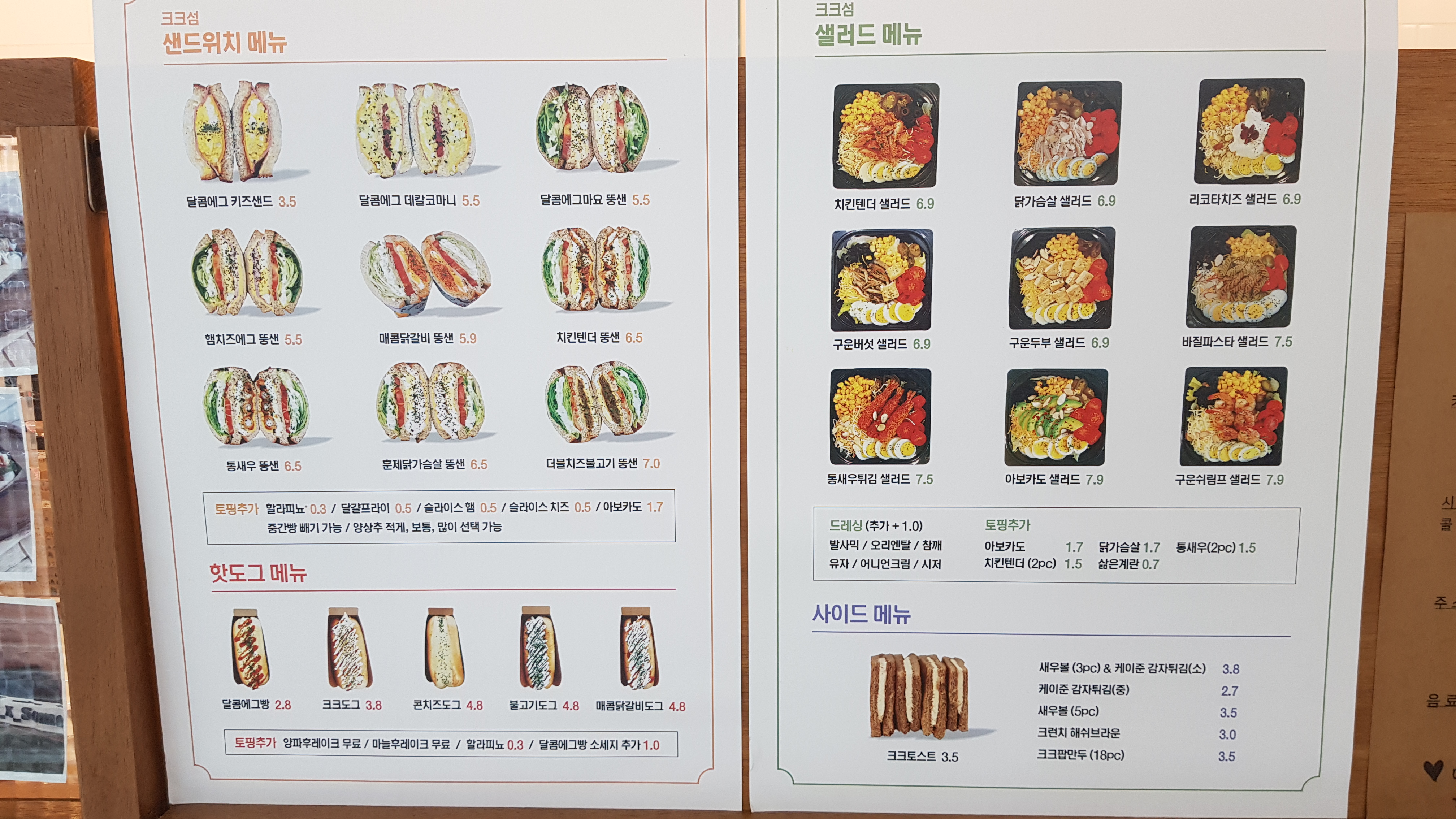크크섬에서 일주일동안 세번을 주문해서 먹어보며 우리 부부 입맛에 맞는 메뉴와 토핑을 찾아냈다. 크크섬의 메뉴들에 들어가는 재료는 신선하고 몸에 좋은 것들이 들어가 맵지 않은 메뉴는 아이와 함께 먹어도 좋을 듯 하다. 요즘 집 밖에서 밥한끼 사먹으려면 1인분에 7~8천원 하기에 밥한끼를 먹는 것 치고는 비싸지 않지만 핫도그와 샌드위치 치고는 약간 비싼편이다. 하지만 들어가는 재료와 양을 따지자면 한끼 건강하고 맛있게 먹는것 치고는 썩 괜찮은 가격이라고 본다. 음료는 브랜드 카페에 비해 저렴한 편이다. 일주일간 세번을 먹었지만 물리지 않고 좋은 재료들로 기본기가 되어있는 식당이기에 앞으로도 계속해서 다른 메뉴도 시도해보며 먹어볼 생각이다.