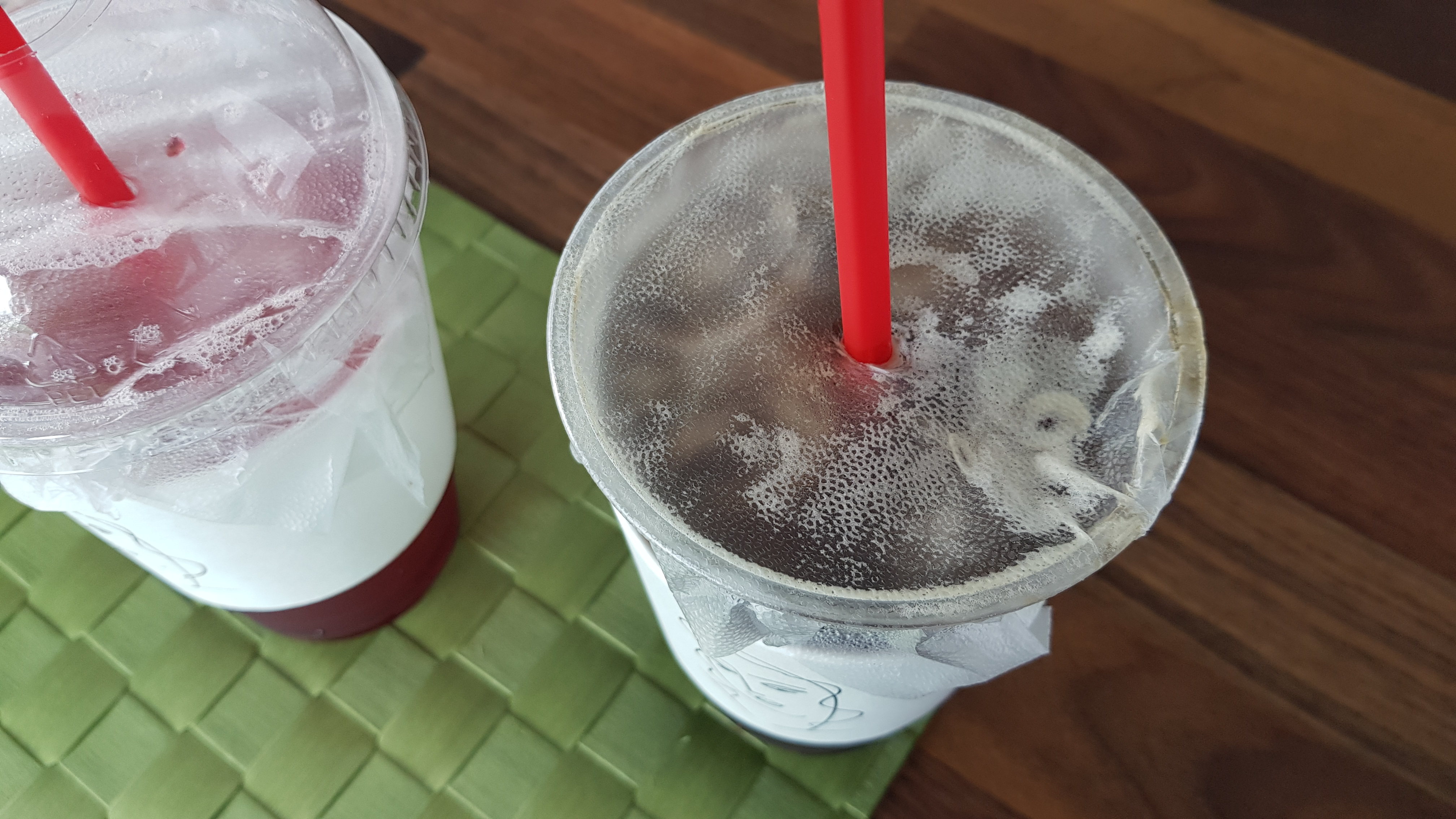 음료를 포장하면 이렇게 비닐로 한번 덮어준다. 차로 이동해서 가지고 올때 흔들려도 커피나 음료가 넘쳐 흐르지 않아 좋다.