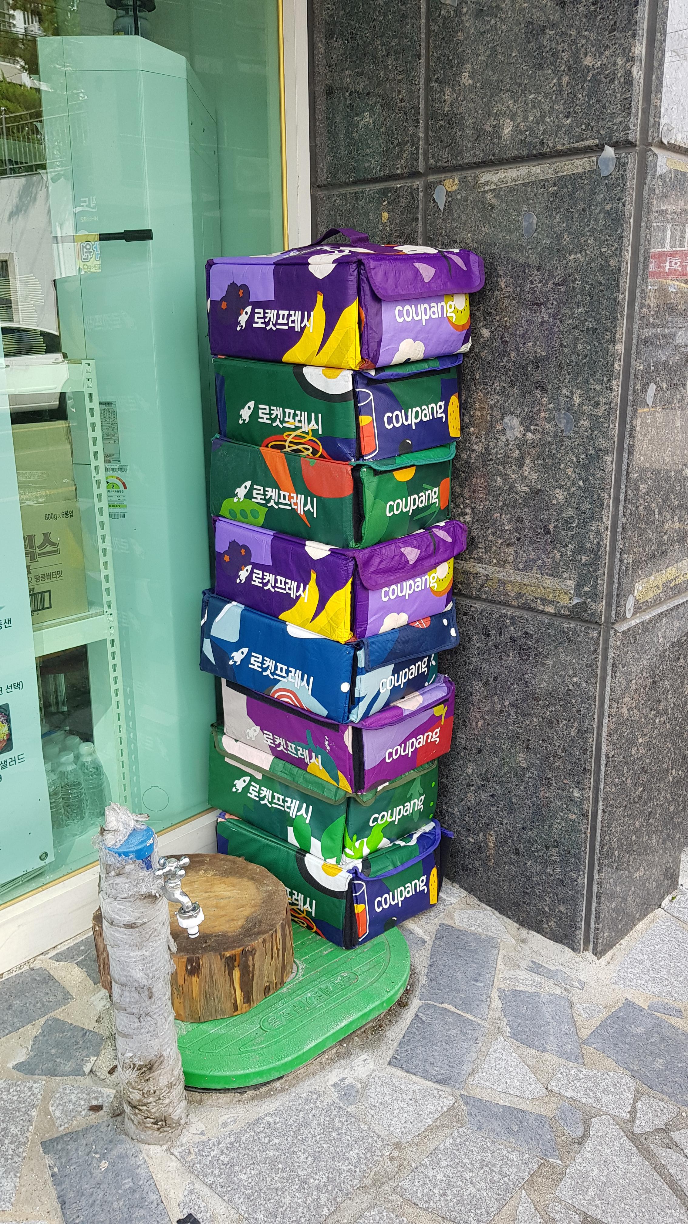 크크섬은 부부가 운영하는 가게로 매일 쿠팡 로켓프레쉬로 재료를 받아서 조리를 하는것 같다. 오픈시간인 10시 조금 전에 가게에 방문해보니 가게문 옆쪽으로 로켓프레쉬 박스가 8개 쌓여있다.