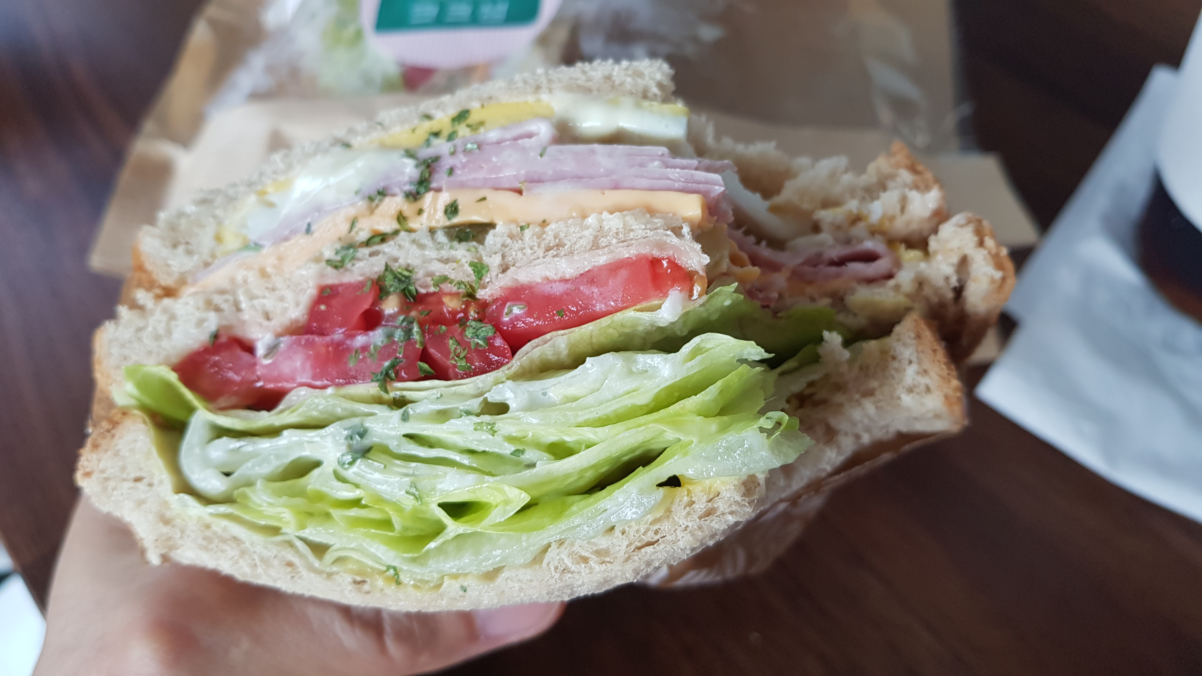 햄치즈에그뚱센을 최선을 다해 한입 먹었다. 두께가 두꺼워서 입을 한껏 벌리고 베어먹어야 이렇게 고스란히 이쁘게 먹을 수 있다. 만약 친해지는 중이거나 편하지 않은 사람과 함께라면 다른 메뉴를 먹는 것이 좋을 듯 하다.