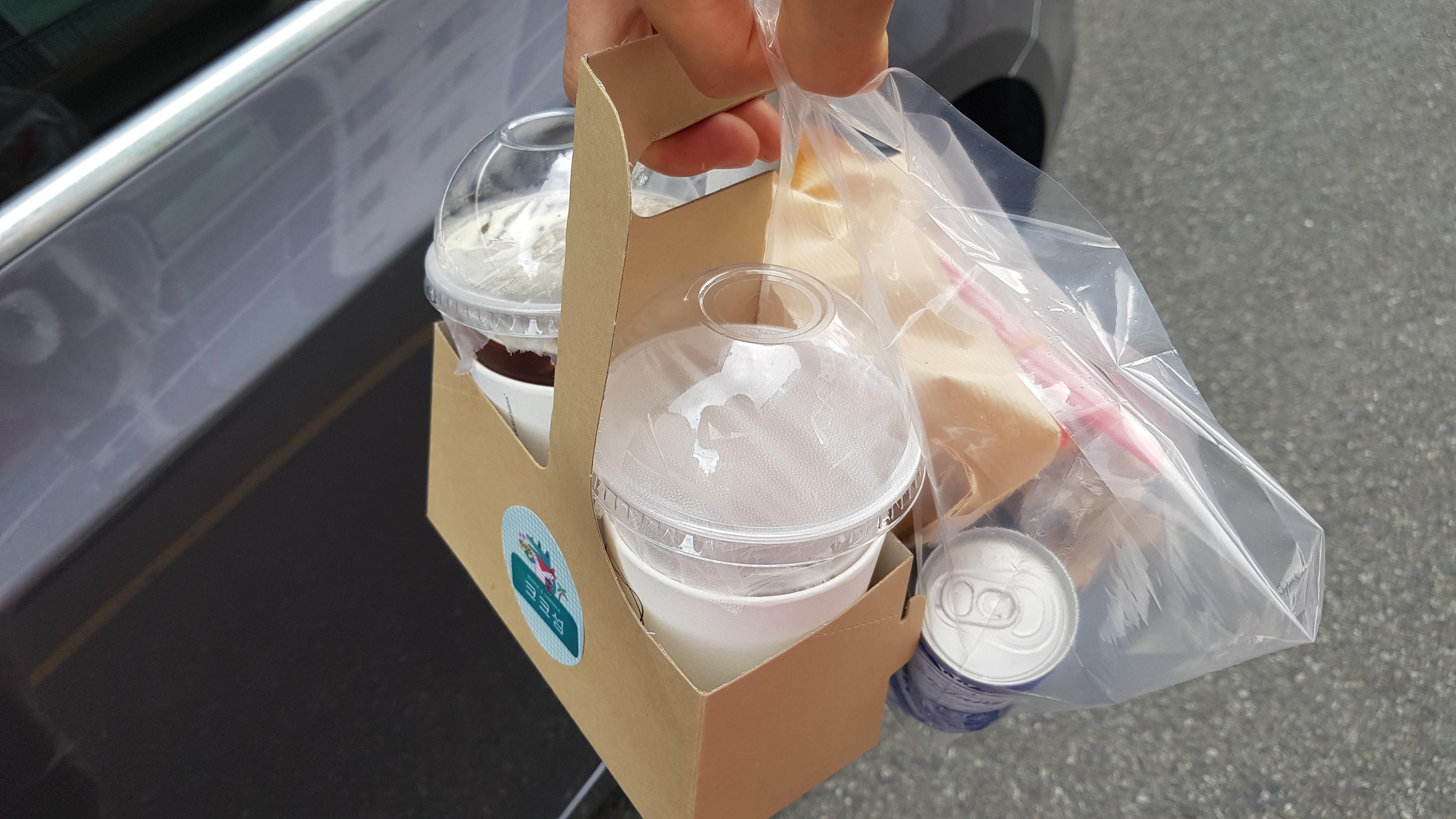 음료를 포장하면 이렇게 비닐로 한번 덮어준다. 차로 이동해서 가지고 올때 흔들려도 커피나 음료가 넘쳐 흐르지 않아 좋다.