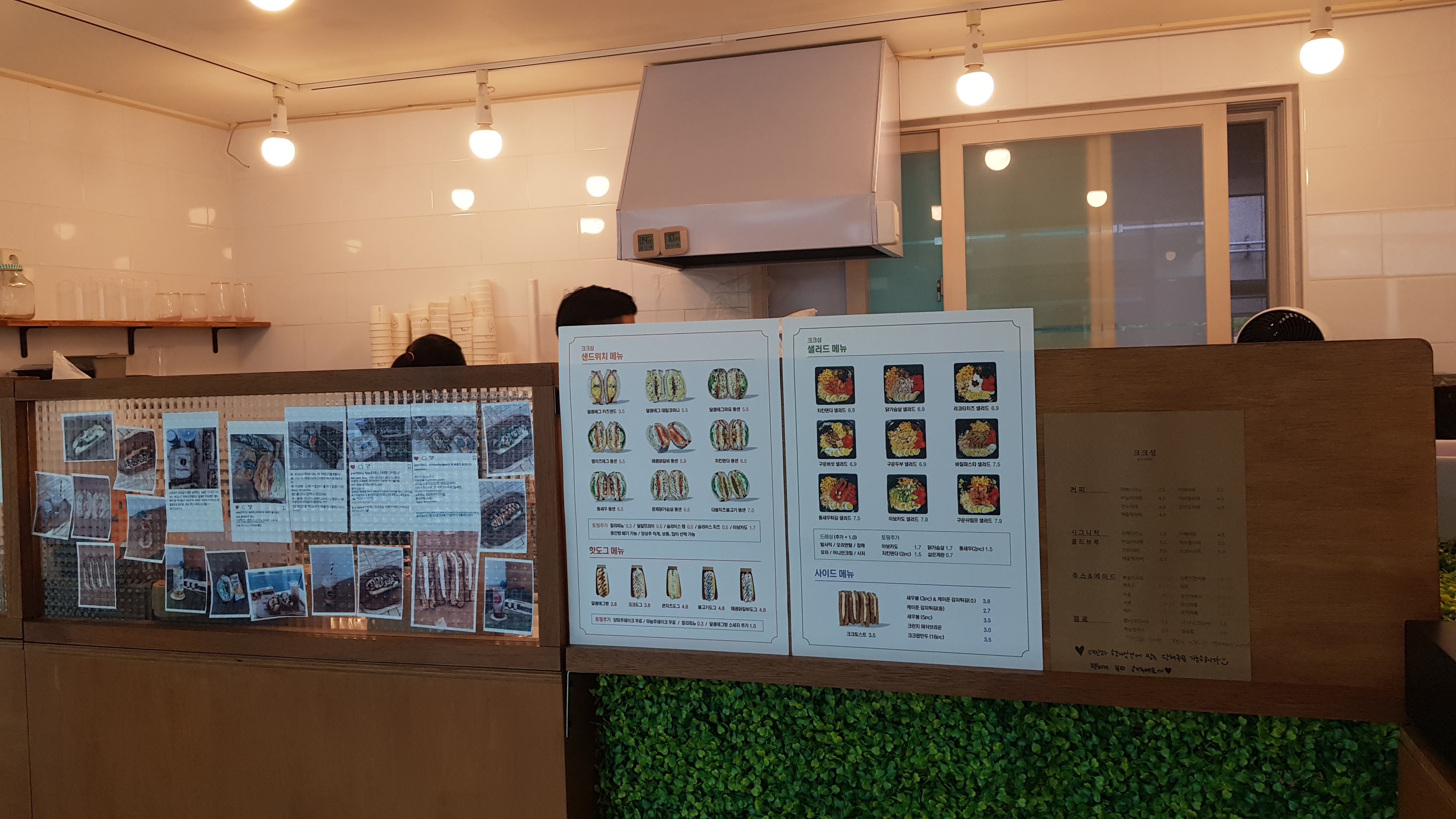 메뉴: 샌드위치, 핫도그, 샐러드 및 각종 음료