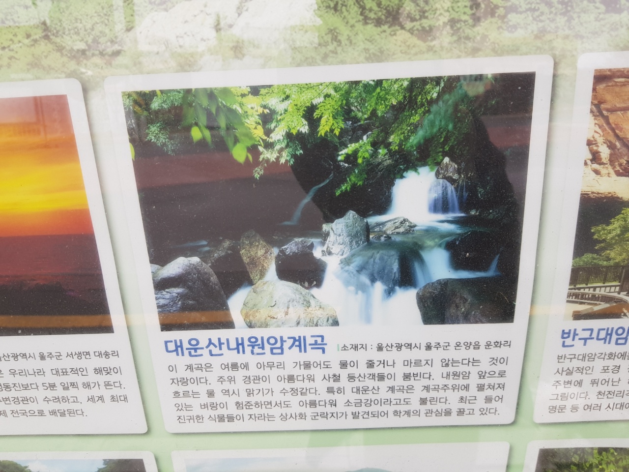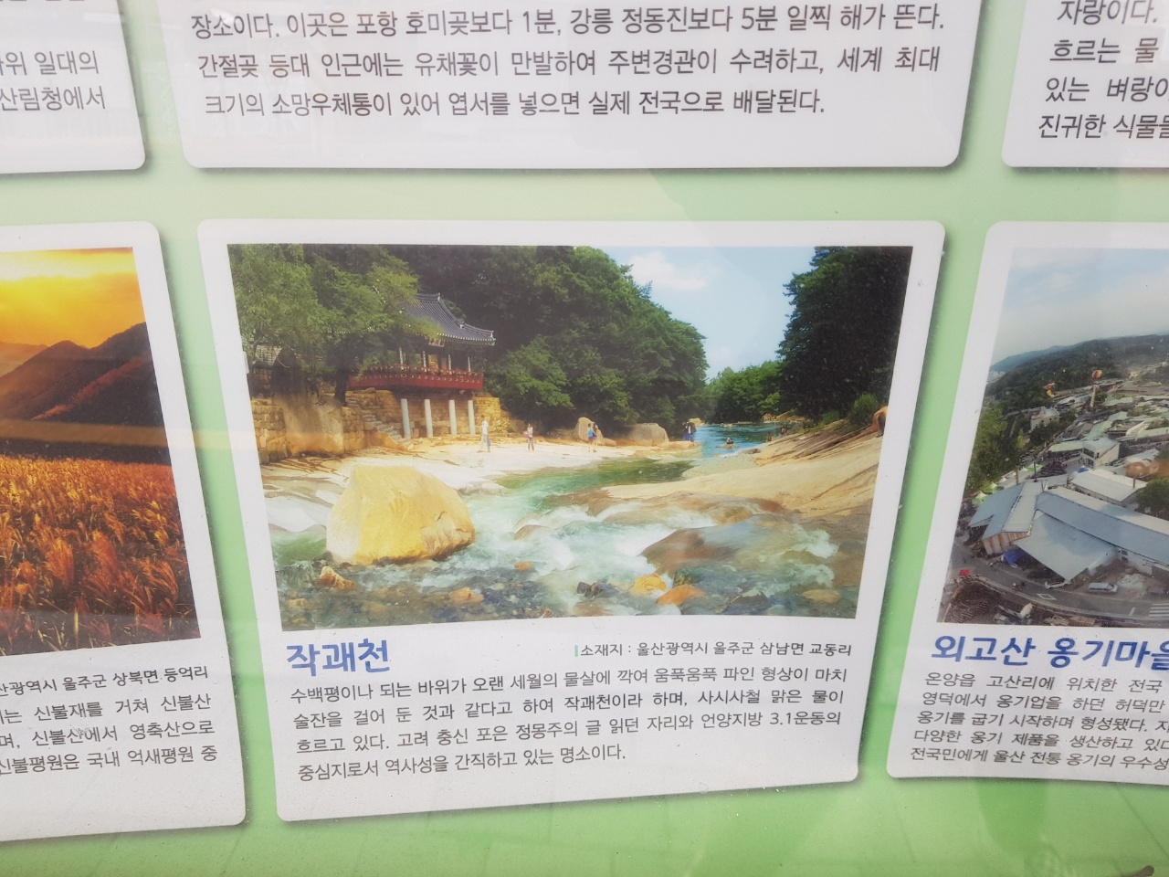 설명: 수백평이나 되는 바위가 오랜 세월의 물살에 깎여 움푹움푹 파인 형상이 마치 술잔을 걸어 둔 것과 같다고 하여 작괘천이라 하며, 사시사철 맑은 물이 흐른다. 고려 충신 포은 정몽주의 글 읽던 자리와 언양 지방 3.1운동의 중심지로서 역사성을 간직하고 있는 명소이다.