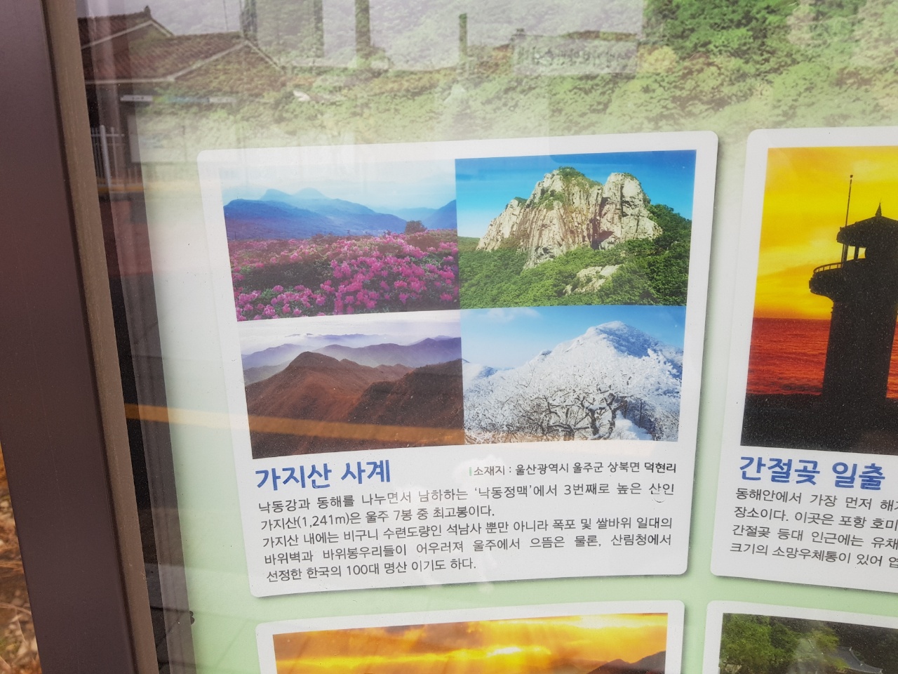 설명: 울산광역시 울주군 상북면에 위치하며, 낙동강과 동해를 나누면서 남하하는 '낙동정맥'에서 3번째로 높은 산인 가지산(1,241m)은 울주 7봉 중 최고봉이다.