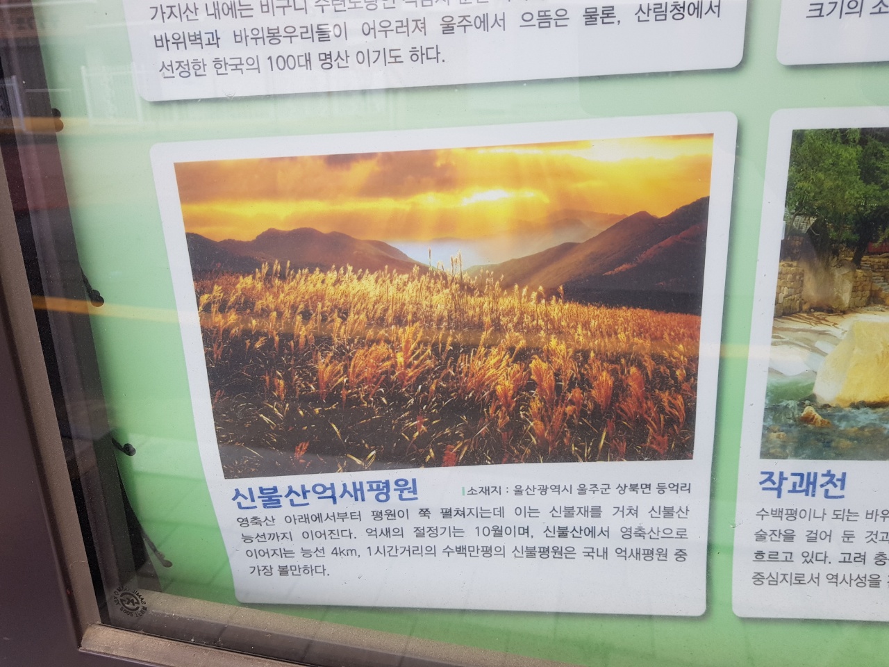 설명: 영축산 아래에서부터 평원이 쭉 펼쳐지는데 이는 신불재를 거쳐 신불산 능선까지 이어진다. 억새의 절정기는 10월이며 가장 잘 어우러진 곳은 신불재에서 신불평원으로 이어지는 능선이다.