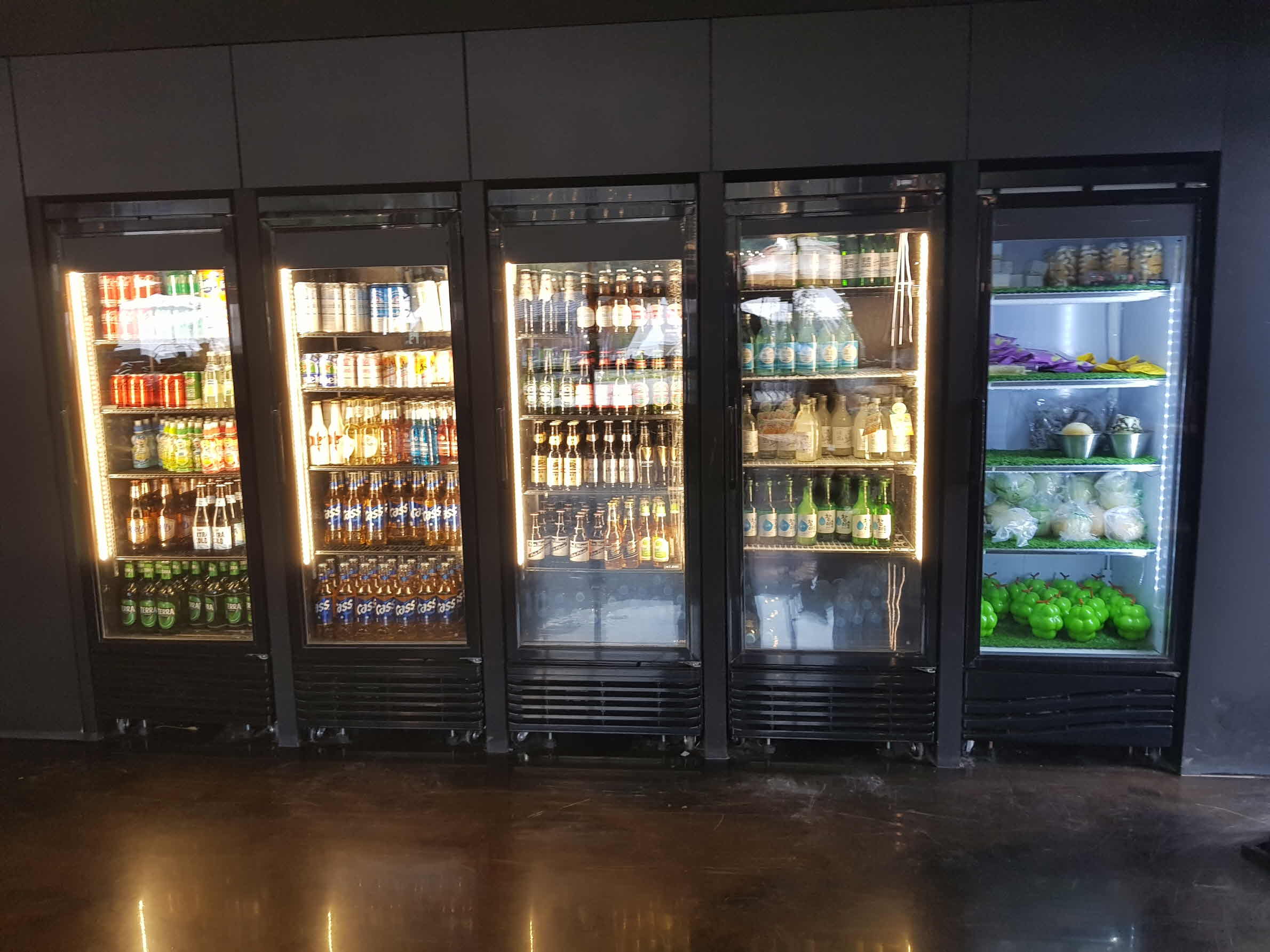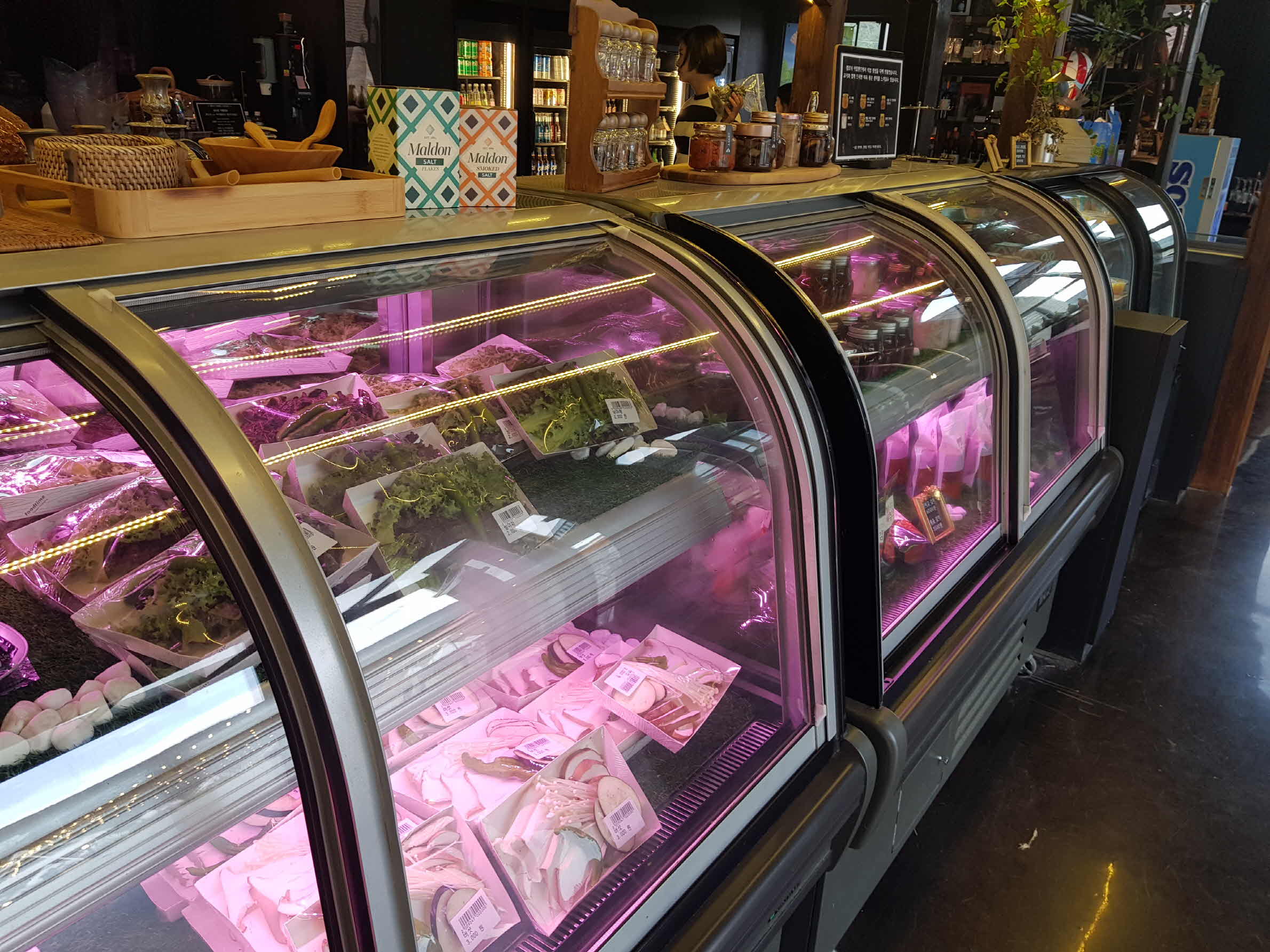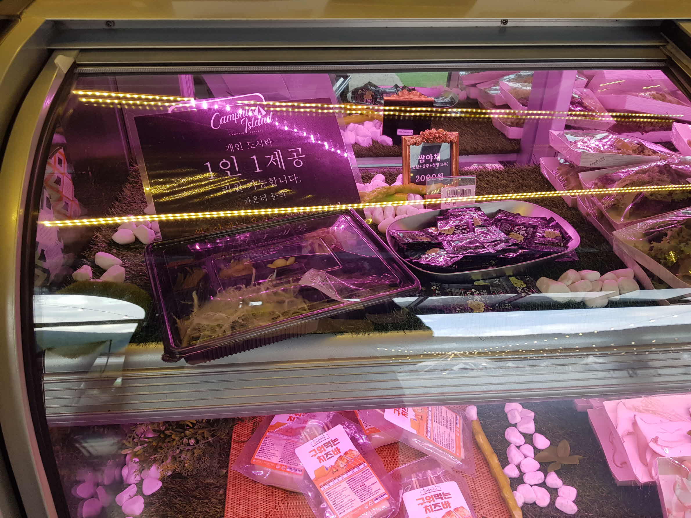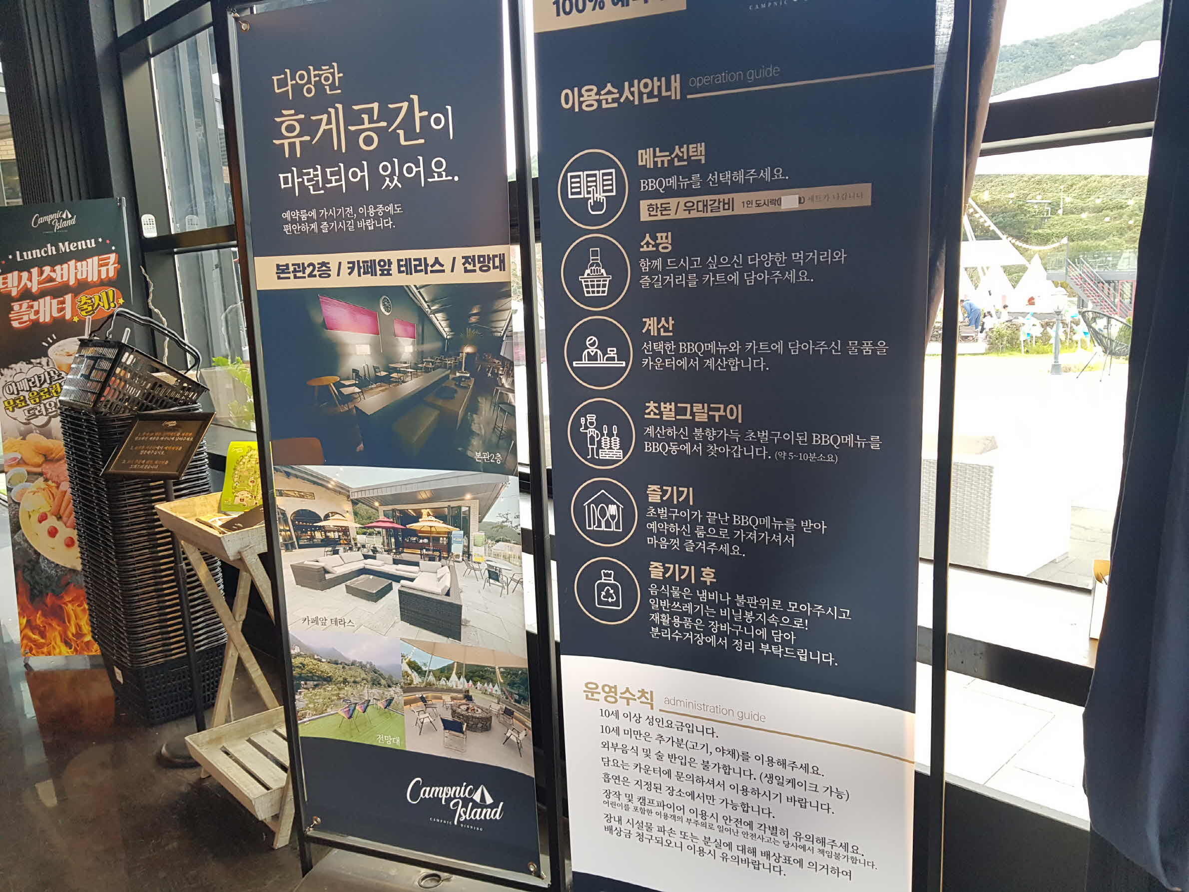 중앙에 있는 쇼케이스 안에는 바베큐해서 먹을 수 있는 식재료들이 있다. 고기와 야채, 버섯, 쌈장, 치즈, 마시멜로 등등 여러 식재료가 있다.