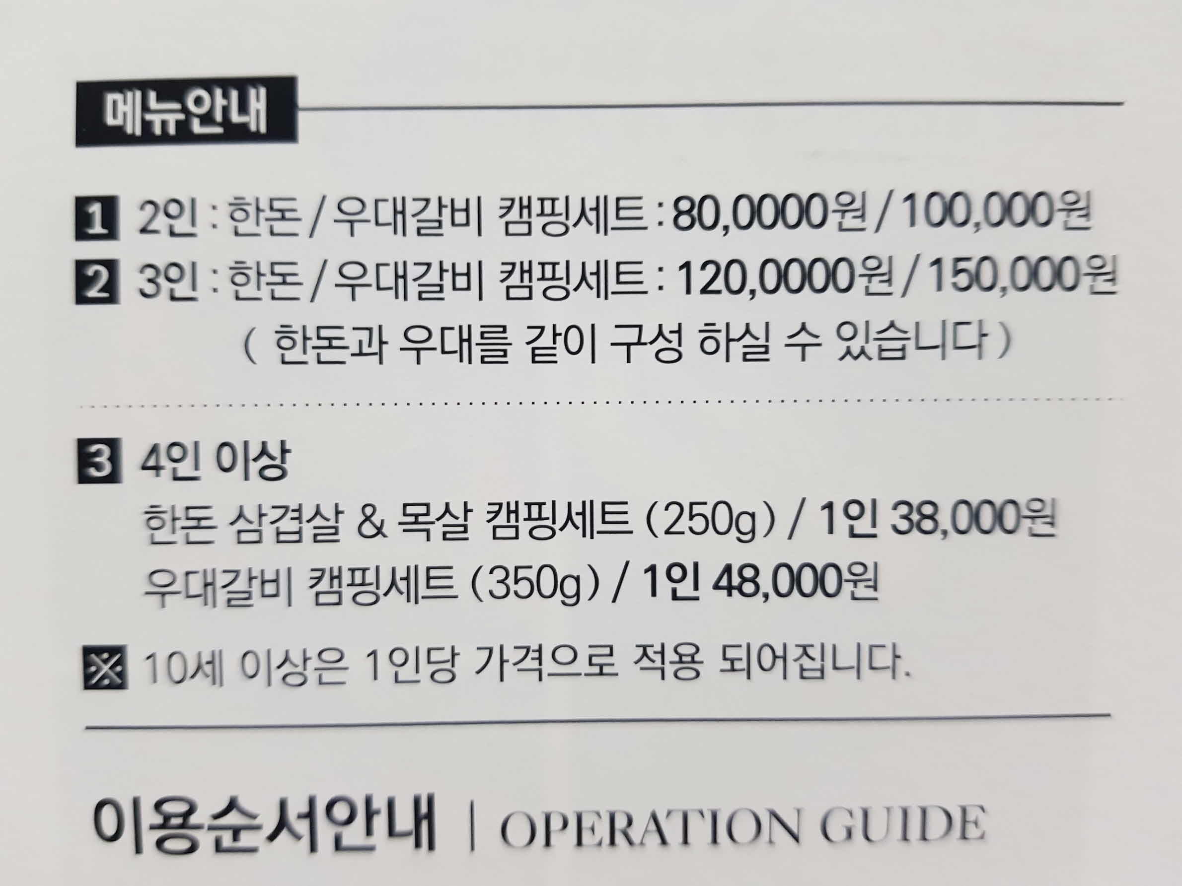한돈(돼지고기)과 우대갈비(미국산) 세트 두 종류가 있다. 인원에 맞춰서 선택하면 되며 세트에는 고기, 해산물, 야채, 소시지, 식기류, 마시멜로, 물 등이 포함되어 있다. 이외 음료는 별도 구매해 먹으면 되겠다.