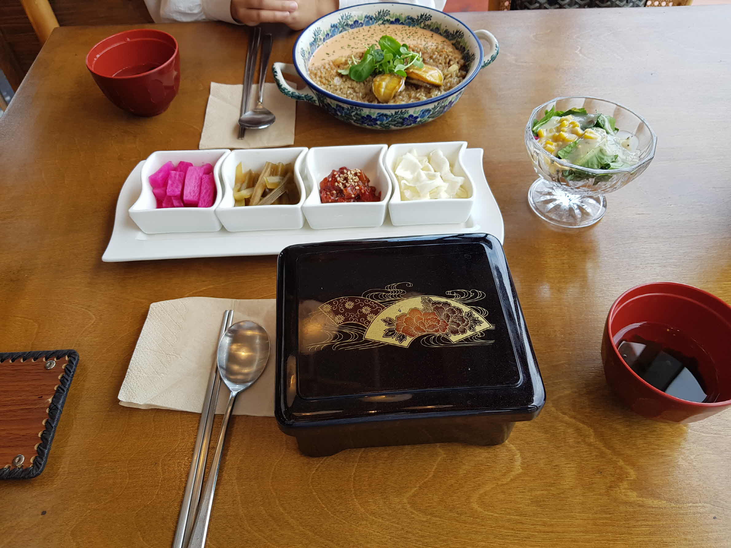 젓갈과 피클이 정갈하게 담겨 밑반찬으로 나온다. 그리고 샐러드와 미역국이 작은 접시에 담아 나온다.