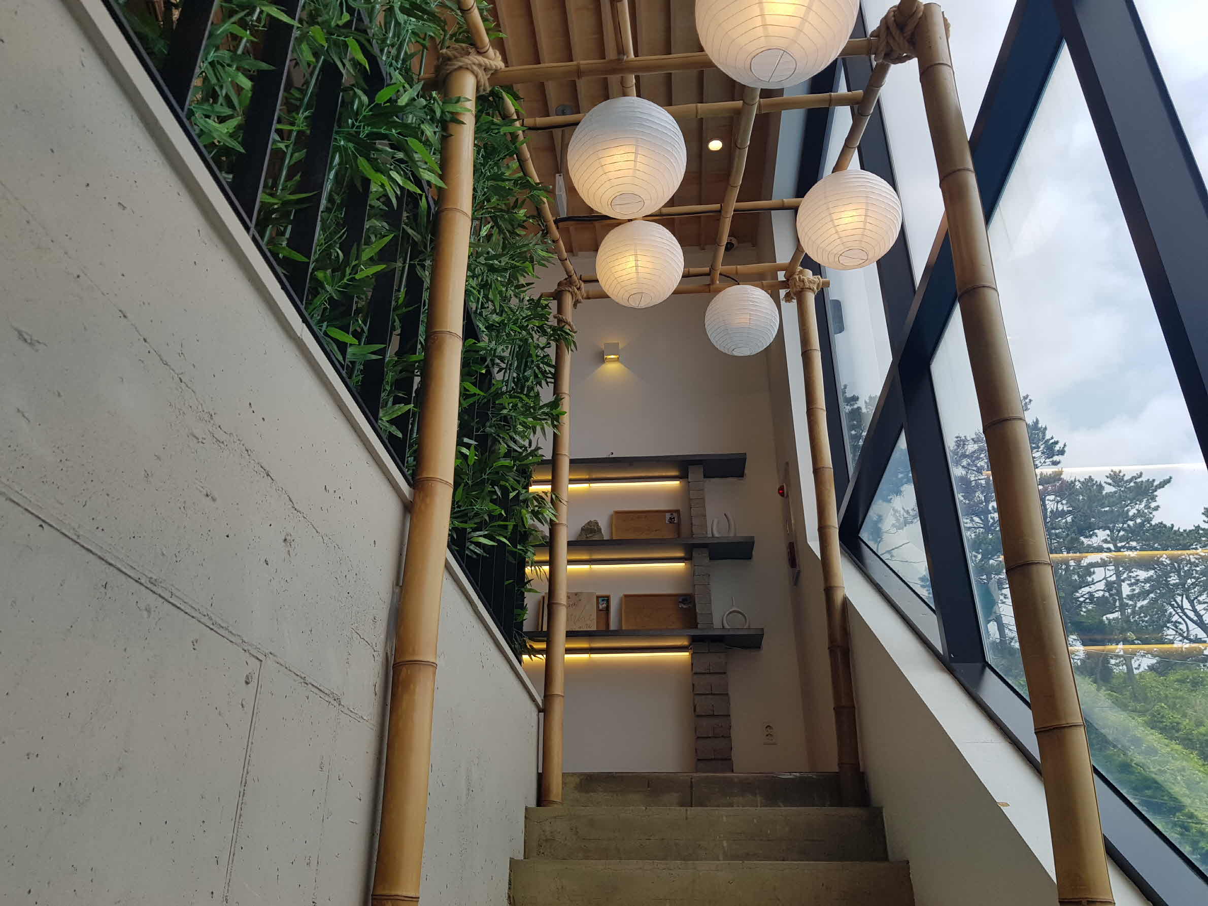2층으로 올라가는 계단은 시멘트와 나무로 되어있고 천장에는 풍등처럼 생긴 둥근 조명이 분위기 있게 걸려 있다. 식당 내부는 어떨지 사뭇 궁금해진다.