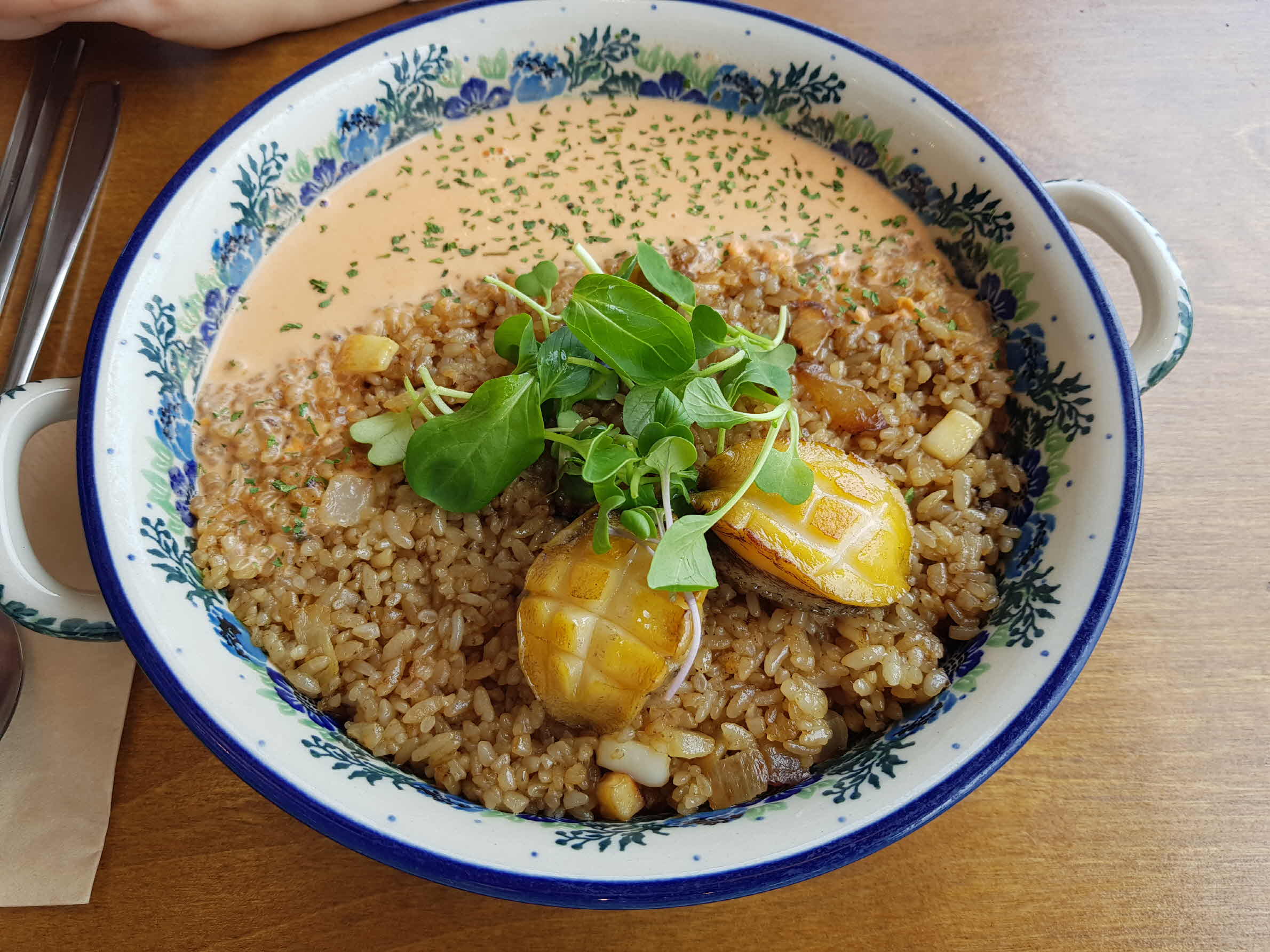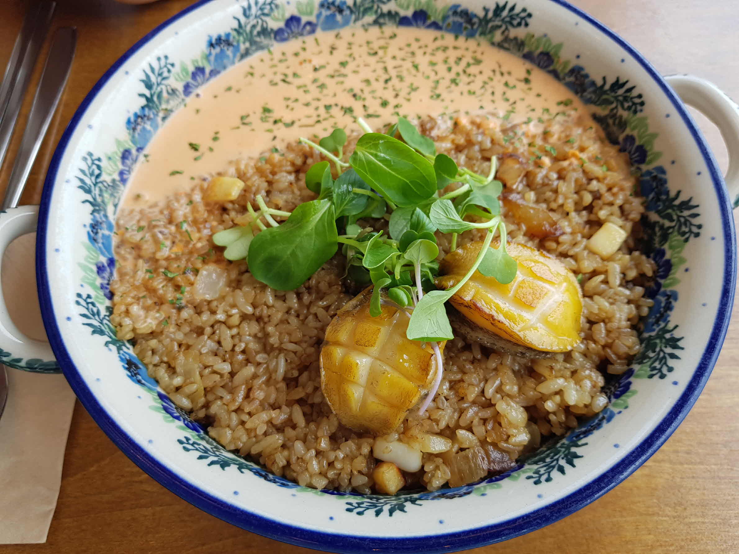 식당 베스트 추천메뉴인 전복밥. 버터구이 전복 통으로 구워져 밥 위에 새싹과 함께 올려져 있다. 보기에도 먹음직스럽고 고소하고 담백한 냄새가 코를 자극하며 입맛을 돋운다.