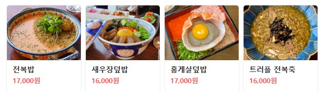 전복밥 / 새우장덮밥 / 홍게살덮밥 / 트러플 전복죽 / 버터전복구이 / 간장새우장