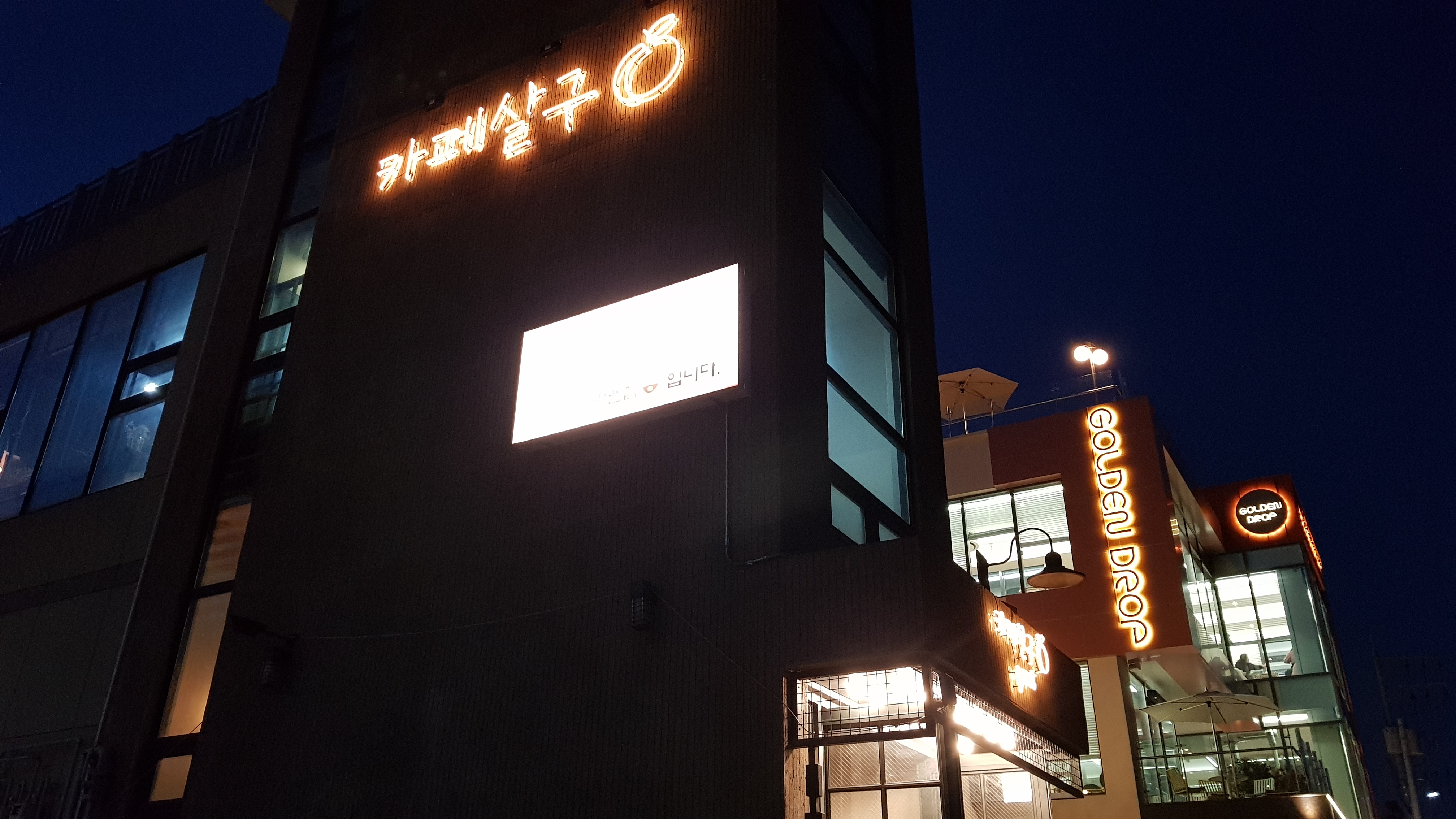밤에 외부 간판 조명에 불이 켜져 분위기 있게 카페 위치를 알려준다.