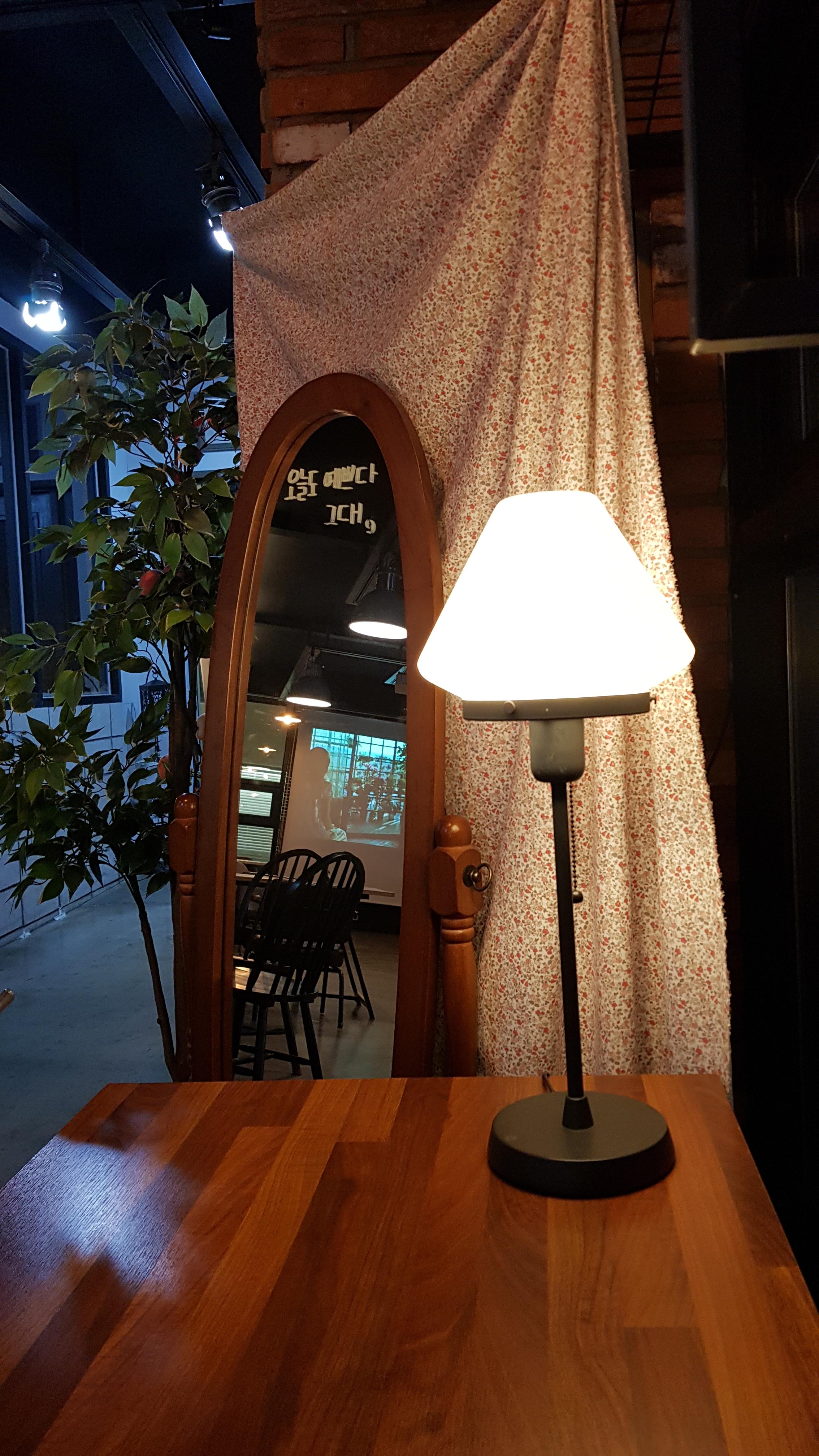 필자가 앉은 테이블의 조명과 그옆에 거울에 쓰여진 이쁜 문구 '오늘도 예쁘다 그대'
