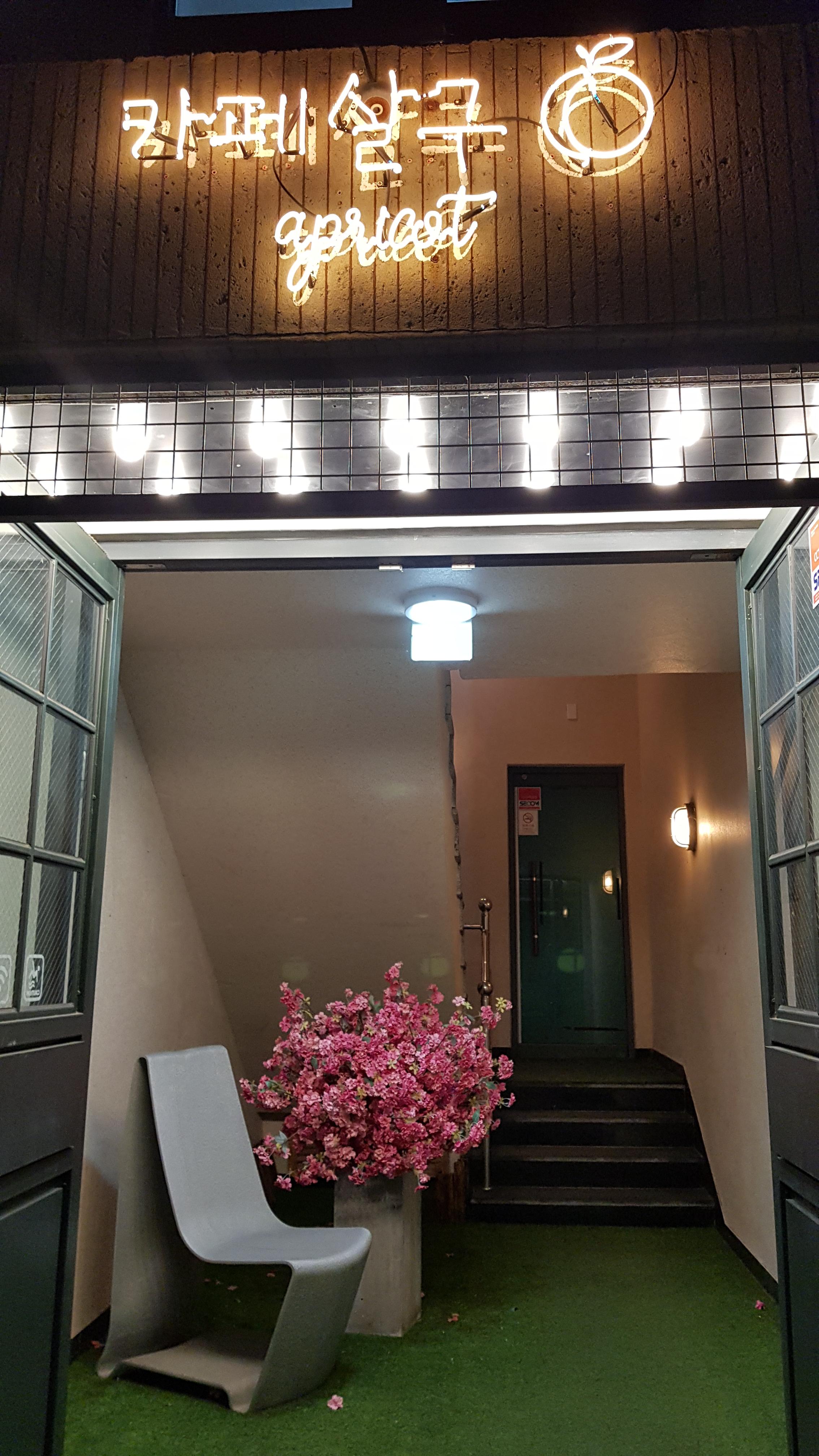 들어가는 입구에도 간판 조명이 켜져있다. 안쪽으로 조화가 놓여있어 반겨준다. 카페는 2층으로 계단을 따라 2층으로 올라간다.
