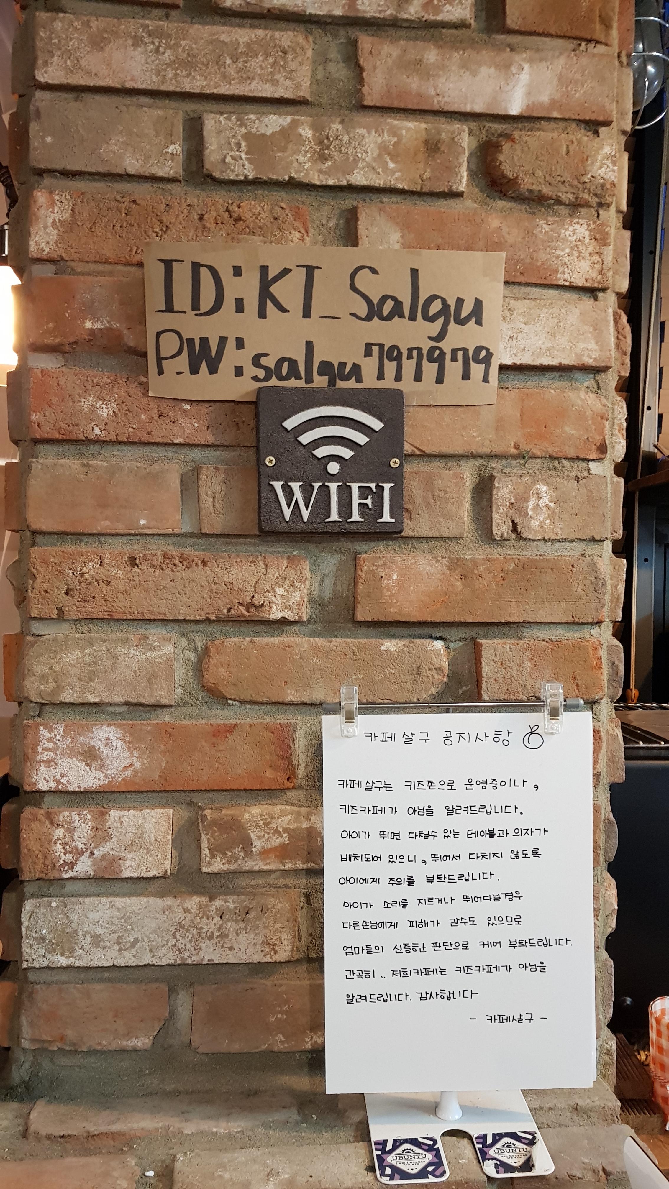 카카운터 옆에 붙어있는 공지사항과 와이파이 비밀번호. 카페 살구는 와이파이 사용 가능하고 키즈존으로 운영중이다.