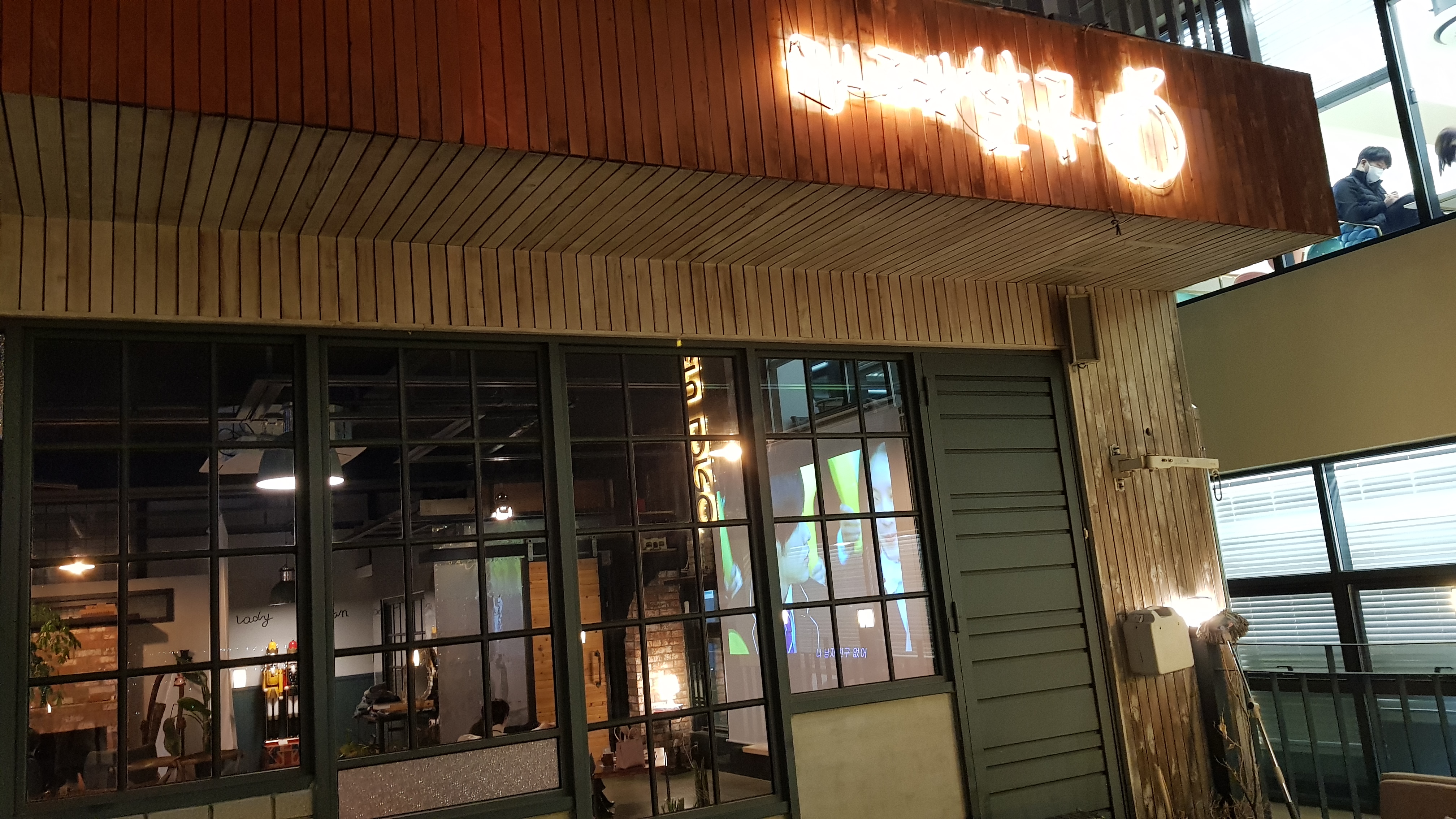 밤에 외부 간판 조명에 불이 켜져 분위기 있게 카페 위치를 알려준다.