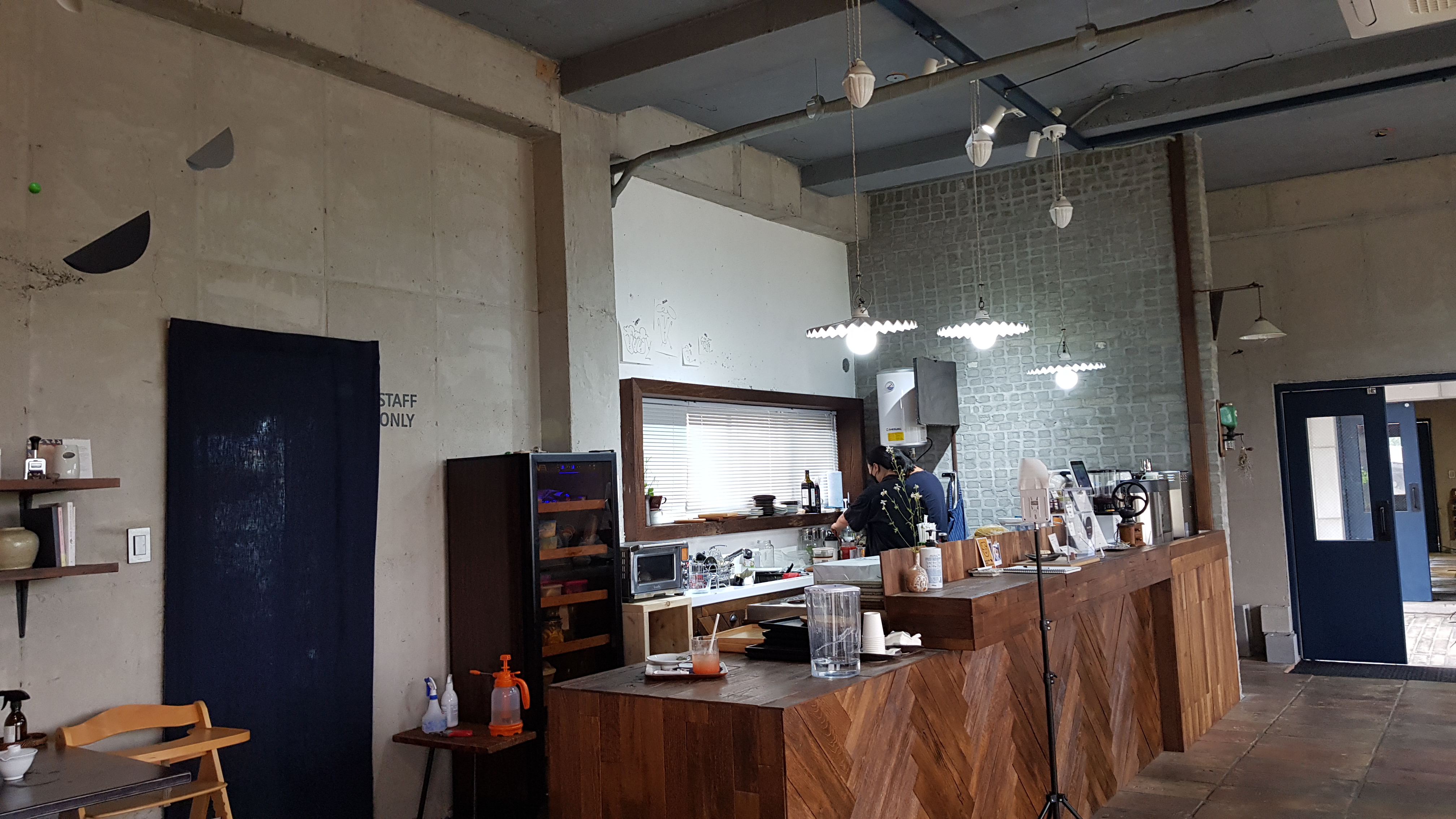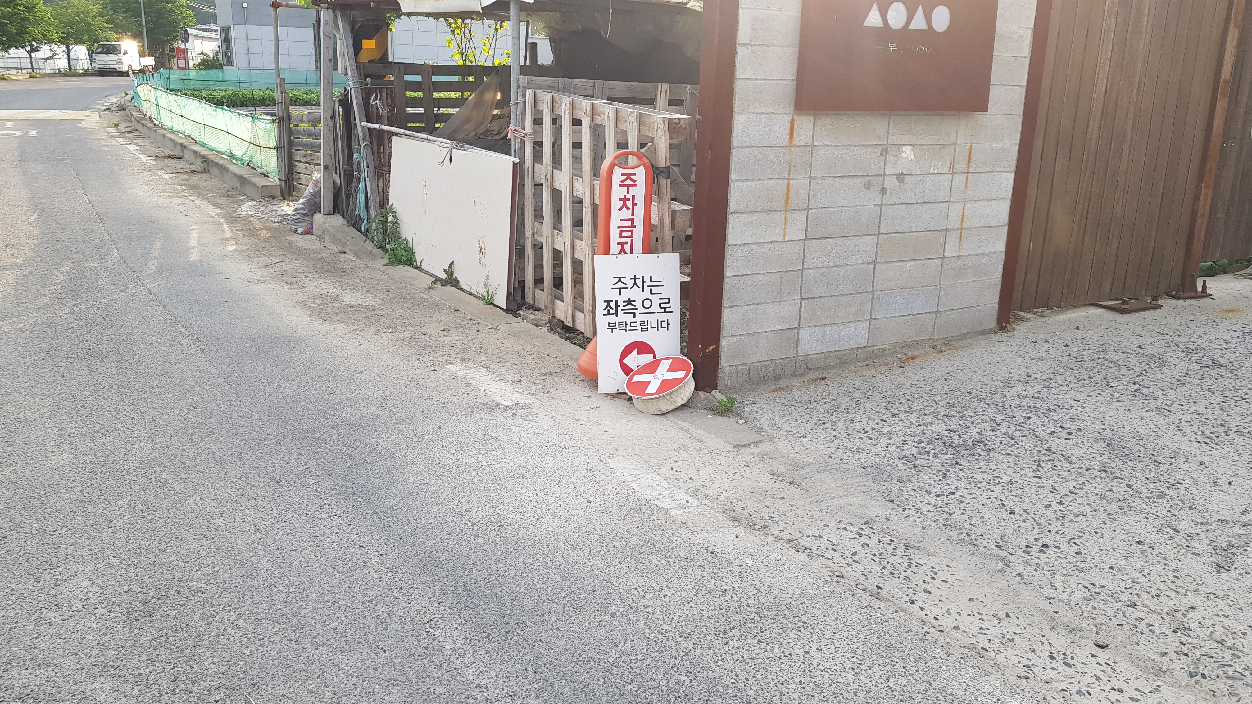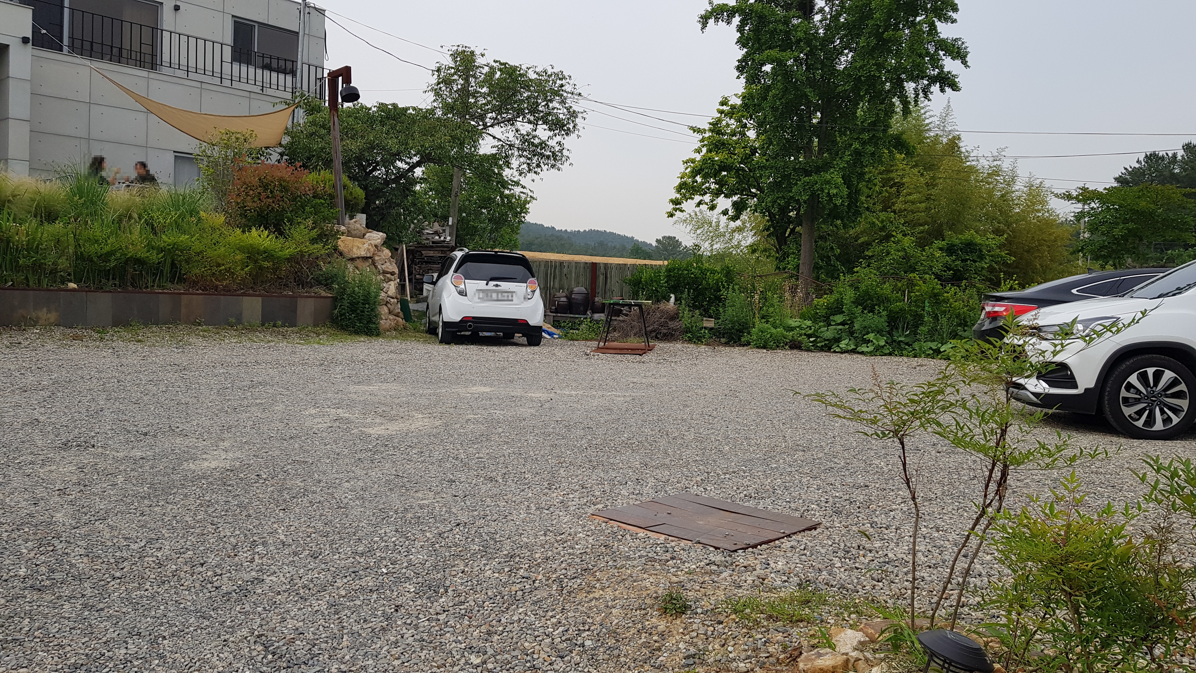 우리가 카페에 도착했을때는 저녁 6시 무렵이었다. 마을은 한적했고 카페에 다다르니 도로변에 차가 두세대정도 주차되어있었다. 카페 입구에 '주차는 좌측으로 부탁드립니다'라는 안내를 보고선 도로좌측에 주차를 했다. 안내 말을 듣지 않고 안으로 들어가면 10대 정도 주차할 수 있는 주차장이 나온다. 찾는이가 많아 붐비더라도 주차할 곳을 찾는건 어렵지 않을 듯 하다. 도로에서 안쪽 카페까지 걸어서 1분정도이니 도로가에 주차해도 불편함은 없다.