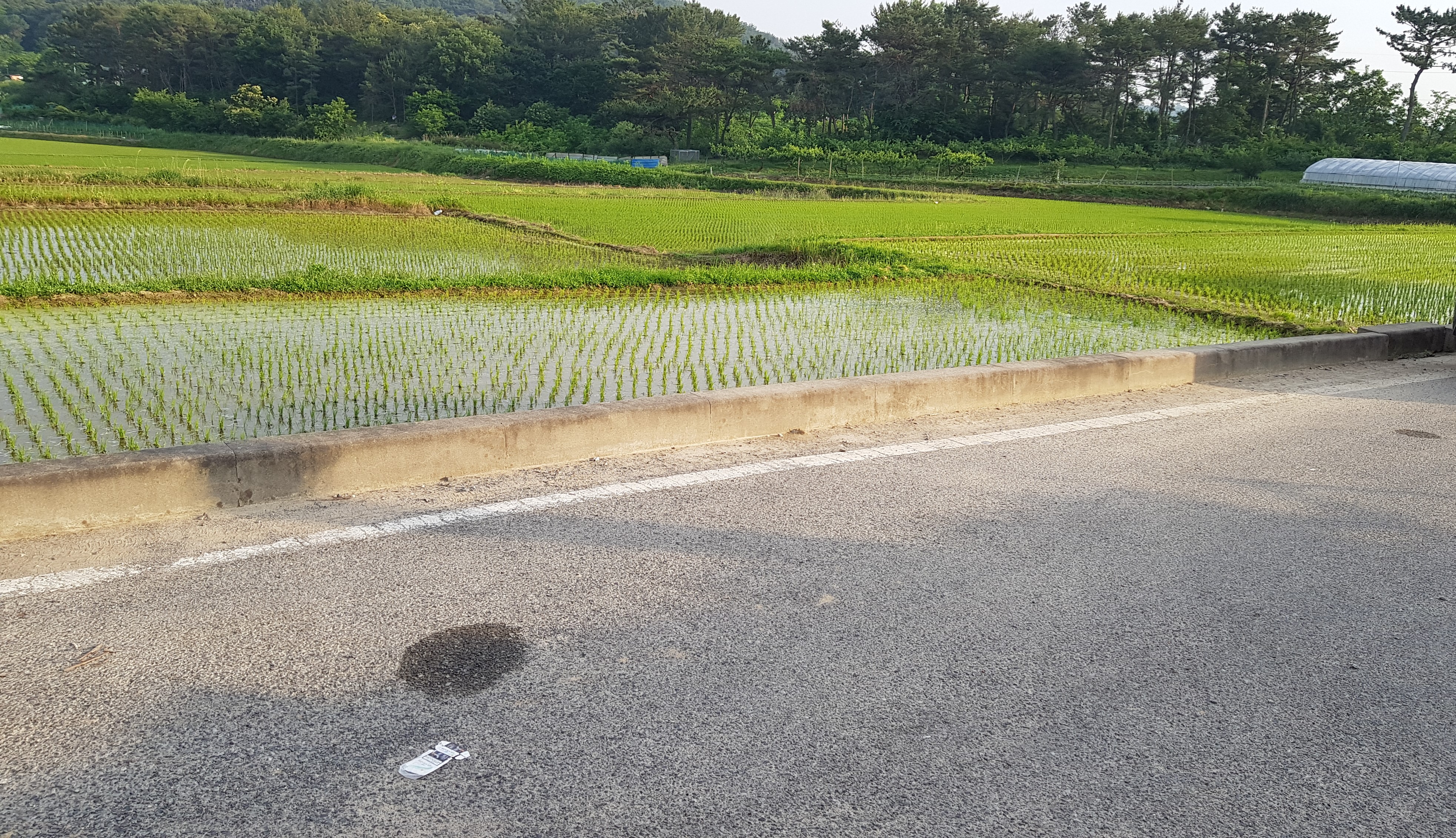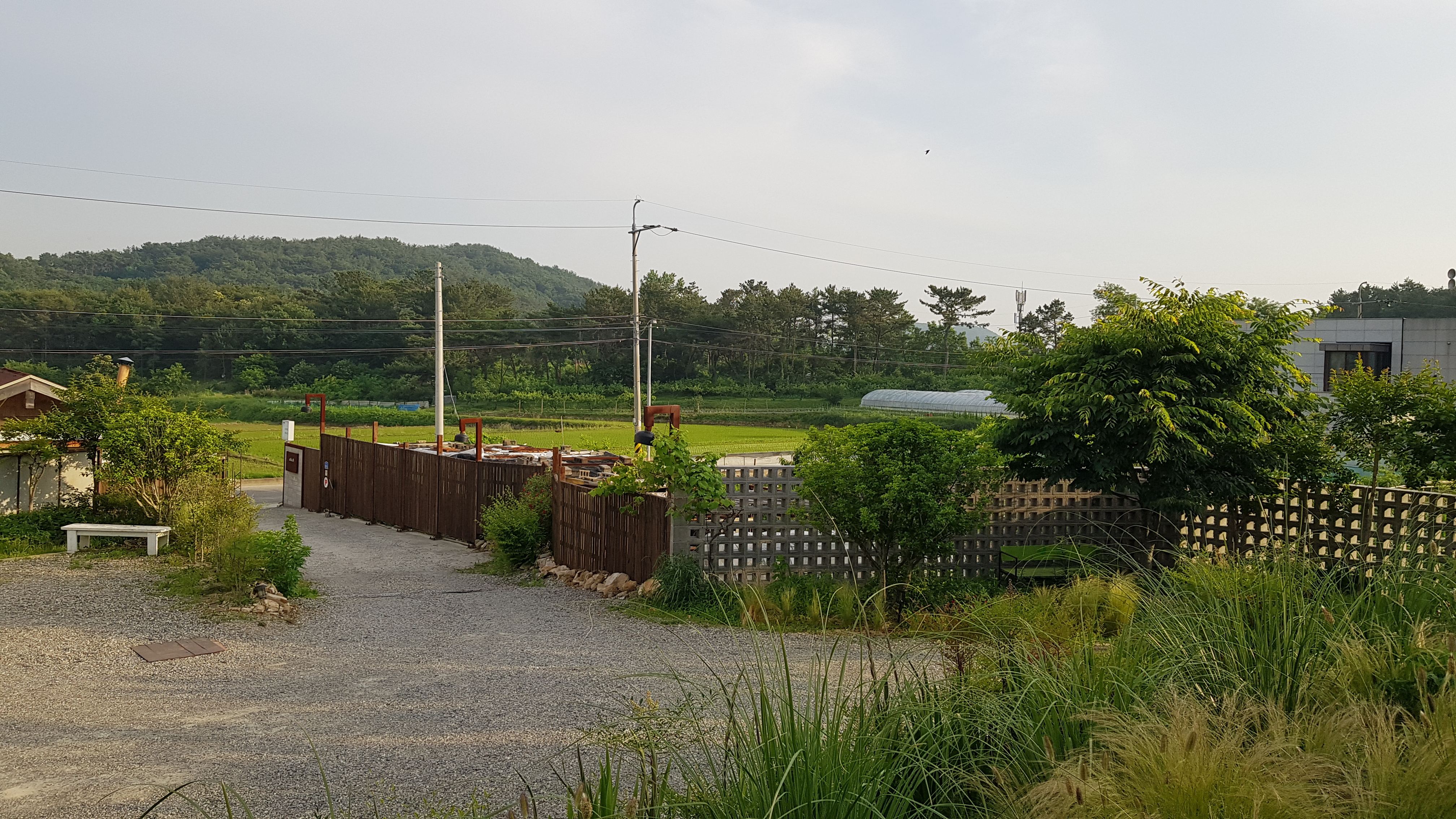사진에 보이는 이쪽 흰라인에 주차하면 된다. 차에서 내리자마자 탁트인 논과 시골내음에 기분이 상쾌하고 푸근해 진다.