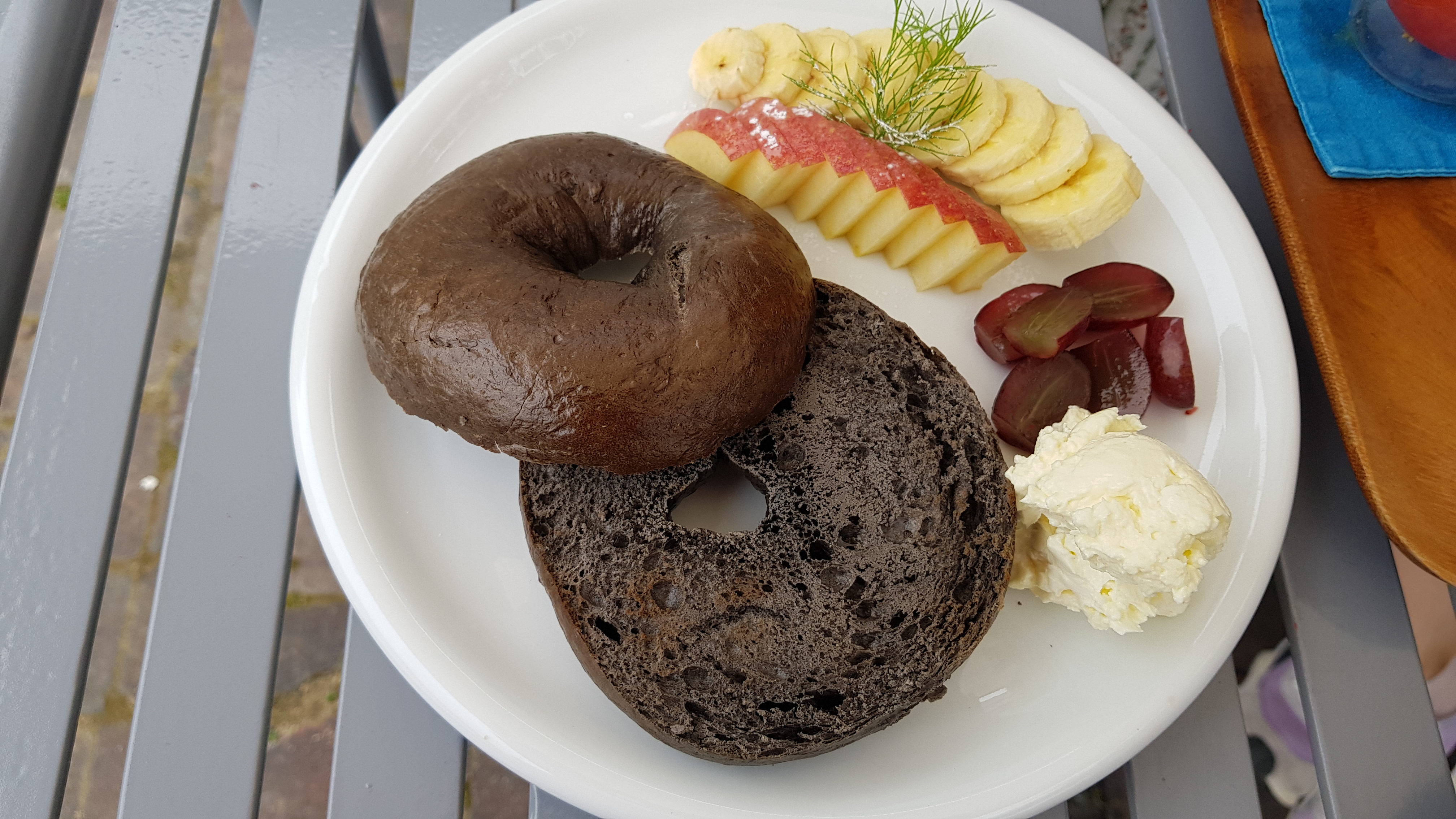 먹물색이라 얼핏 보면 탄것처럼 보인다. 베이글의 겉은 약간 바삭거리며 속은 부드럽다.