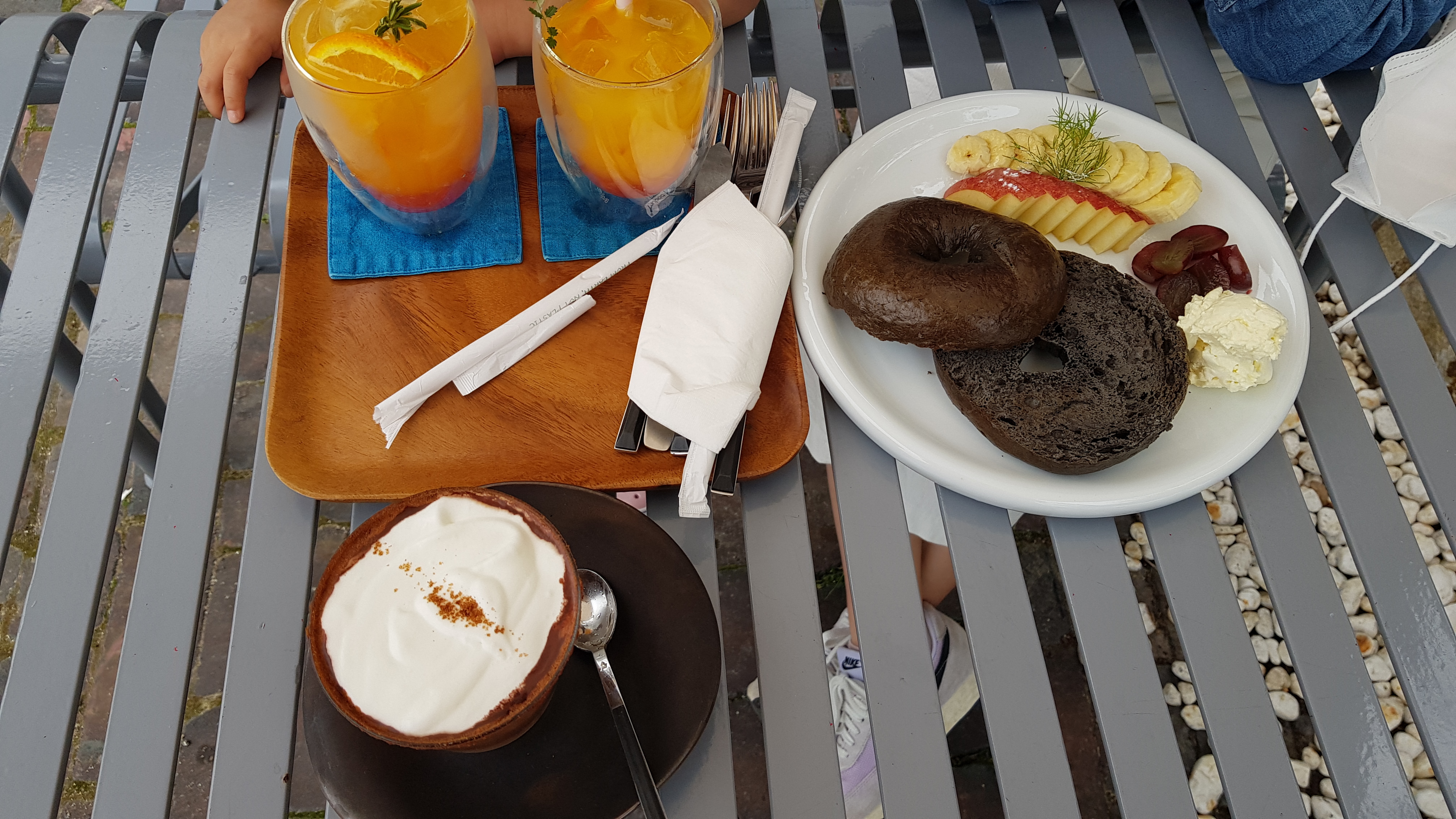 야외 테이블을 잡고 자리에 앉으니 브런치 메뉴, 수제 먹물 베이글 플레이트를 가져다 주신다.