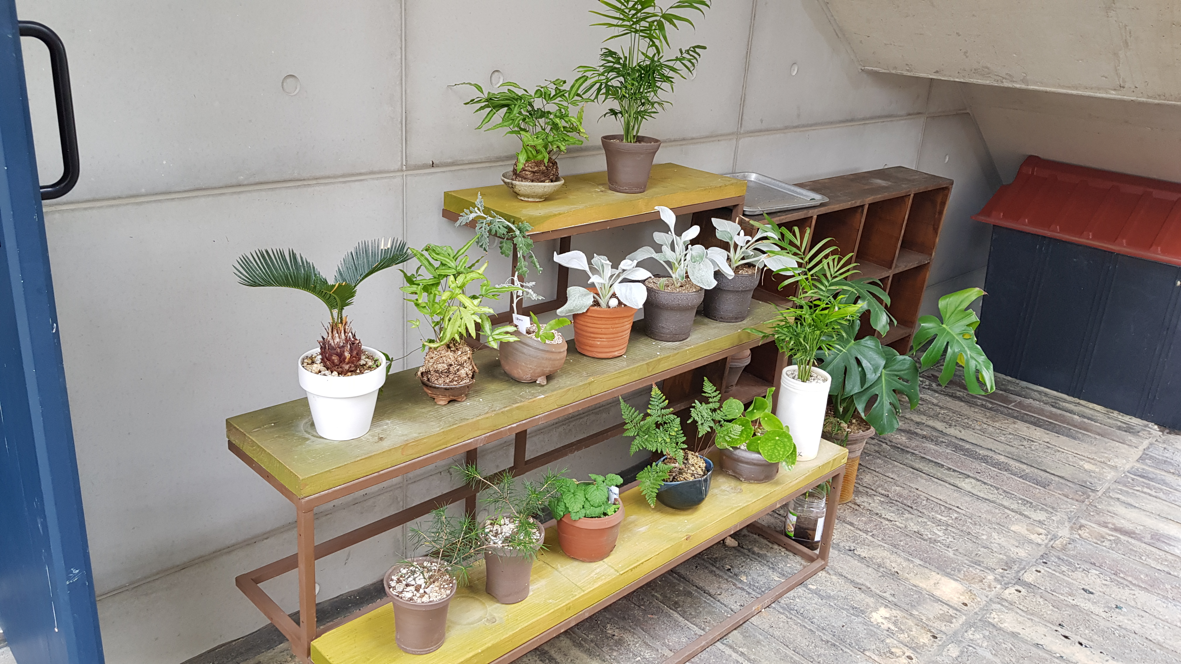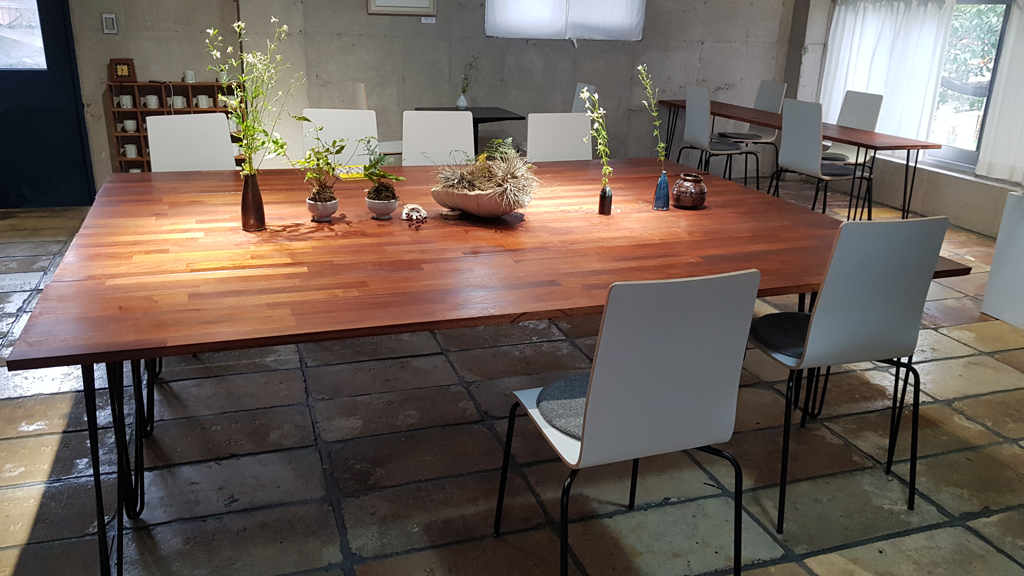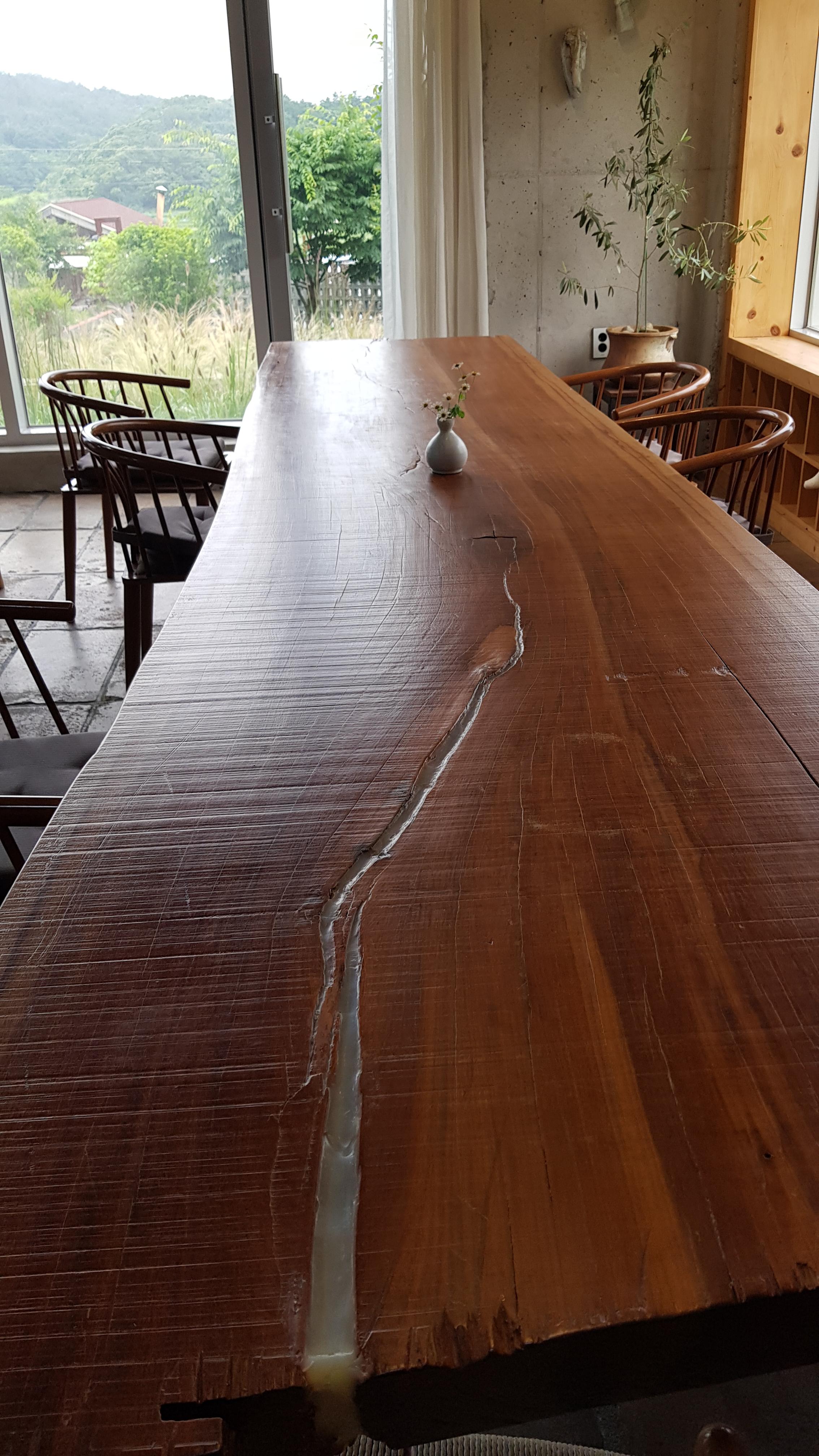 윈도우 시트 앞에 이렇게 기다란 우드테이블이 놓여있다. 큰 테이블 가운데 놓인 작은 꽃병이 앙증맞아 보인다.