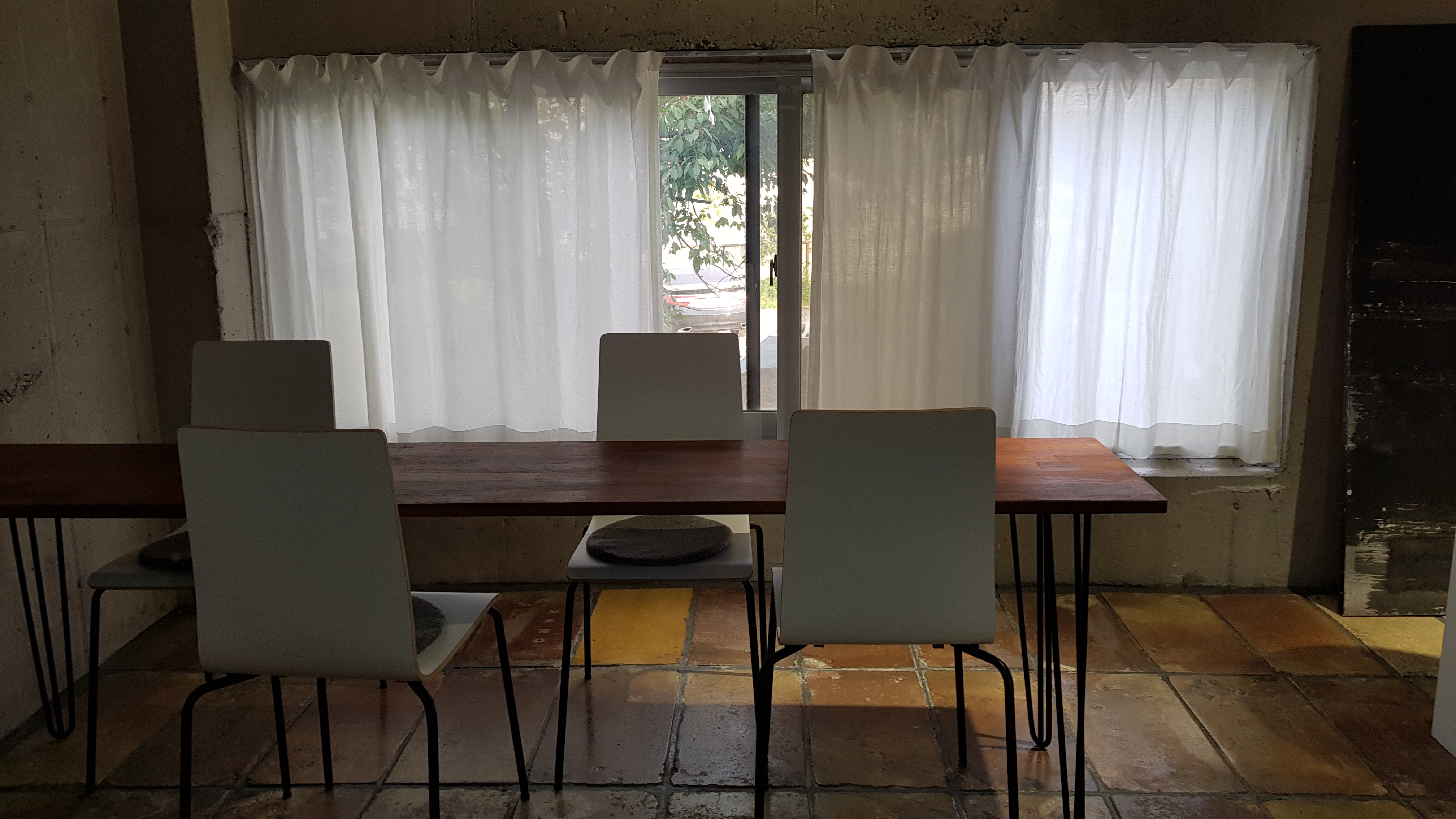 윈도우 시트 앞에 이렇게 기다란 우드테이블이 놓여있다. 큰 테이블 가운데 놓인 작은 꽃병이 앙증맞아 보인다.
