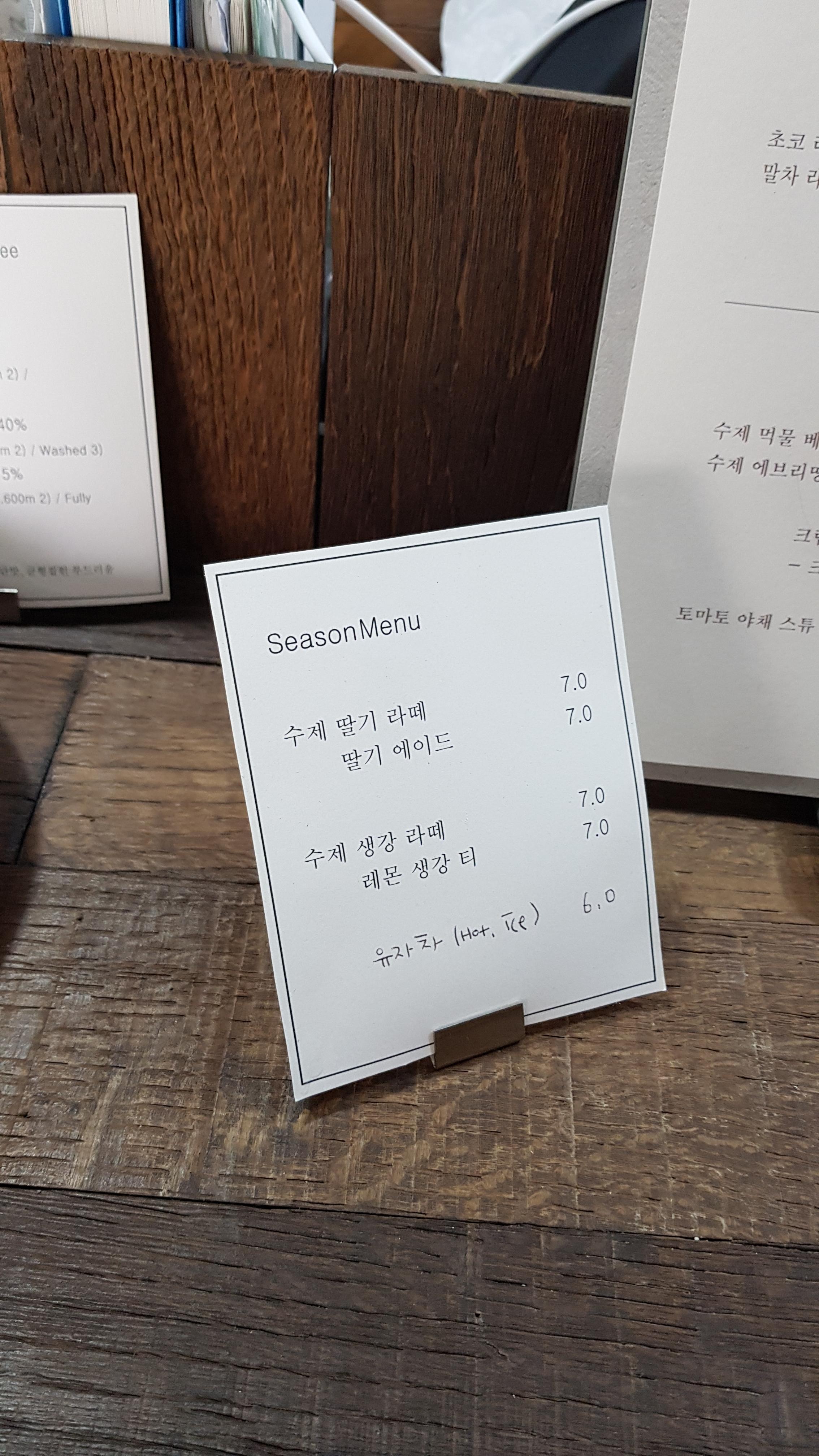 시즌메뉴: 딸기 라떼 / 딸기 에이드 / 생강 라떼 / 레몬 생각 티 / 유차자
