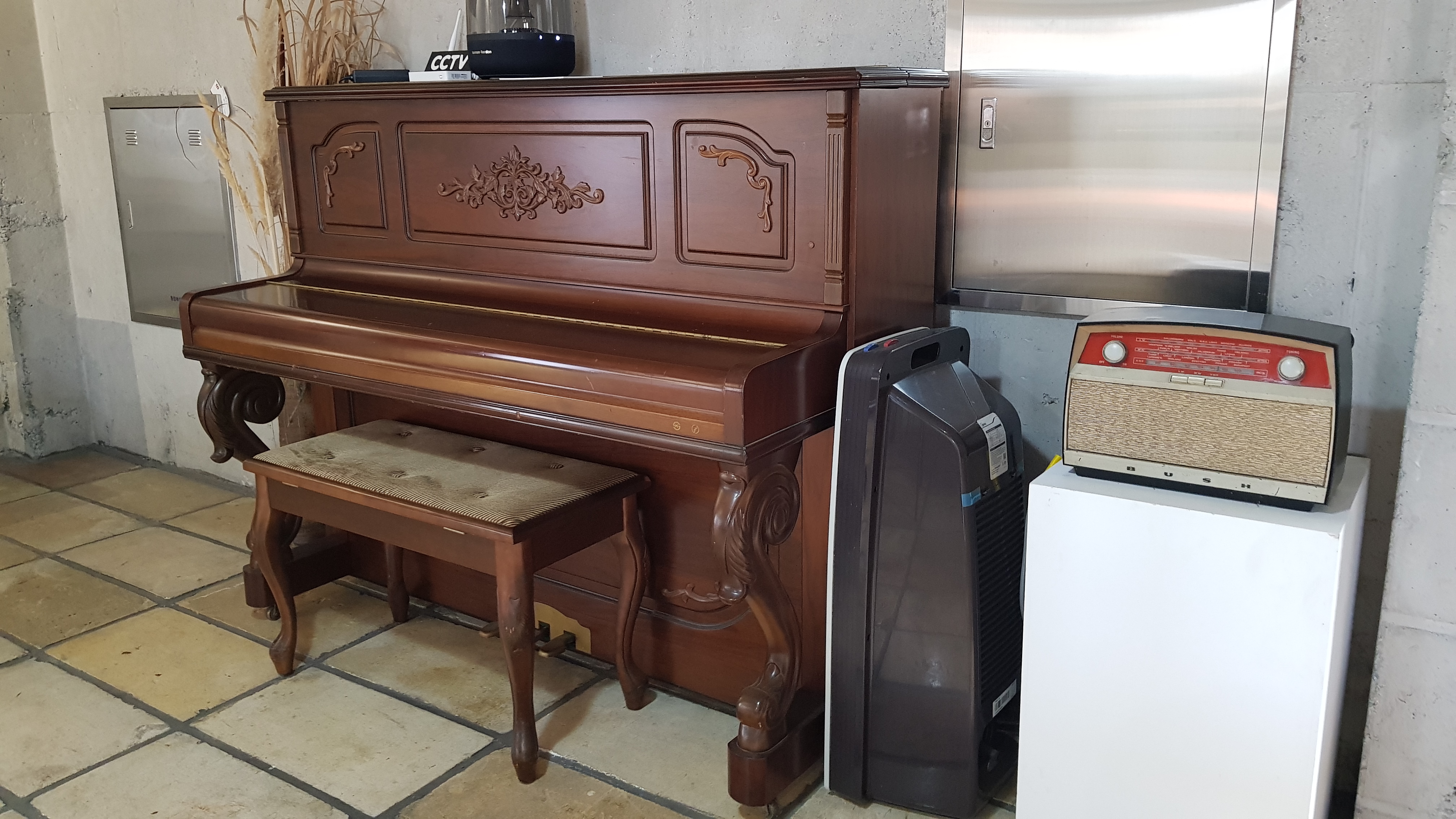 레트로 감성의 오래된 전축이 나무 테이블 밑에 놓여있다.