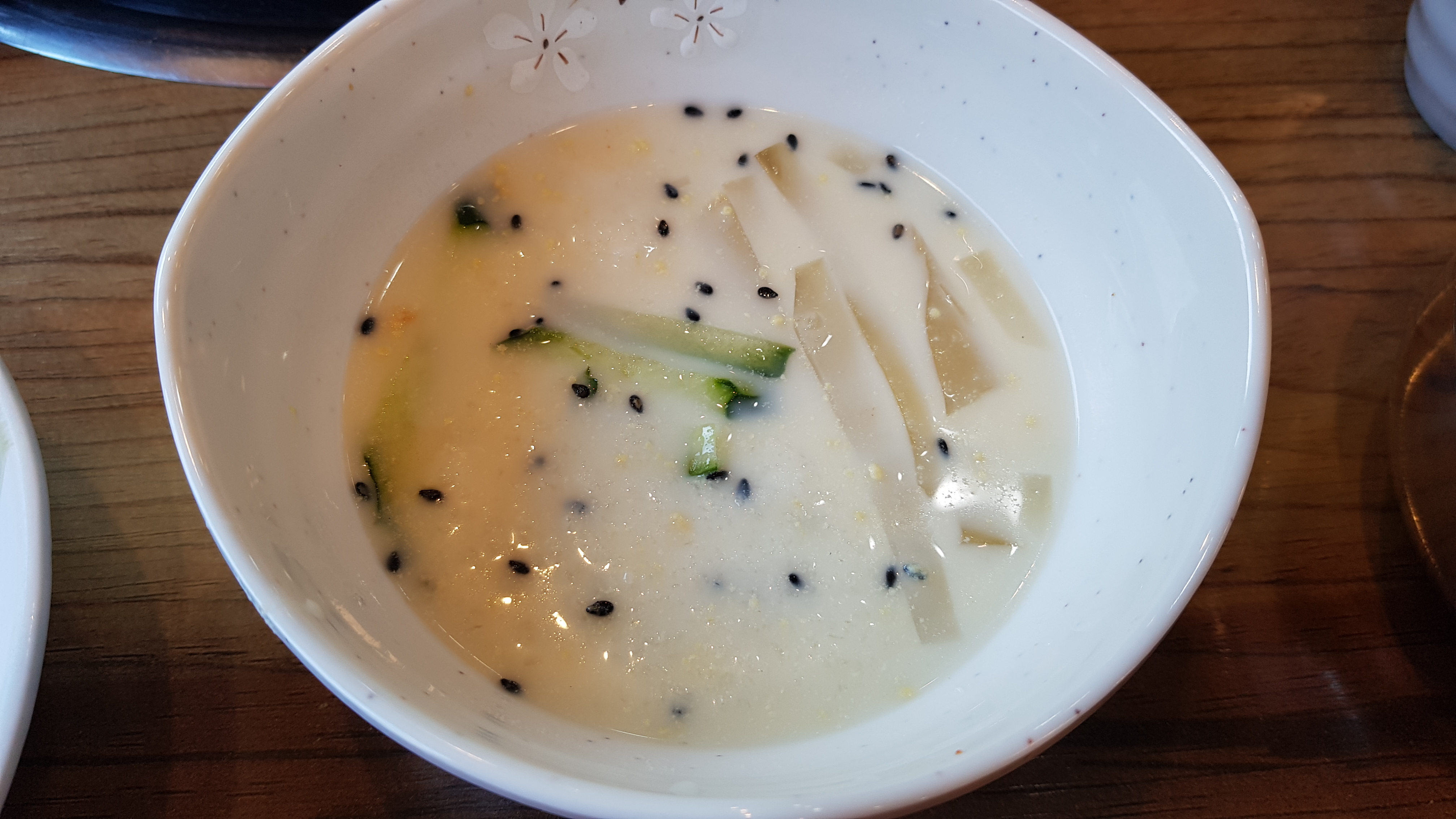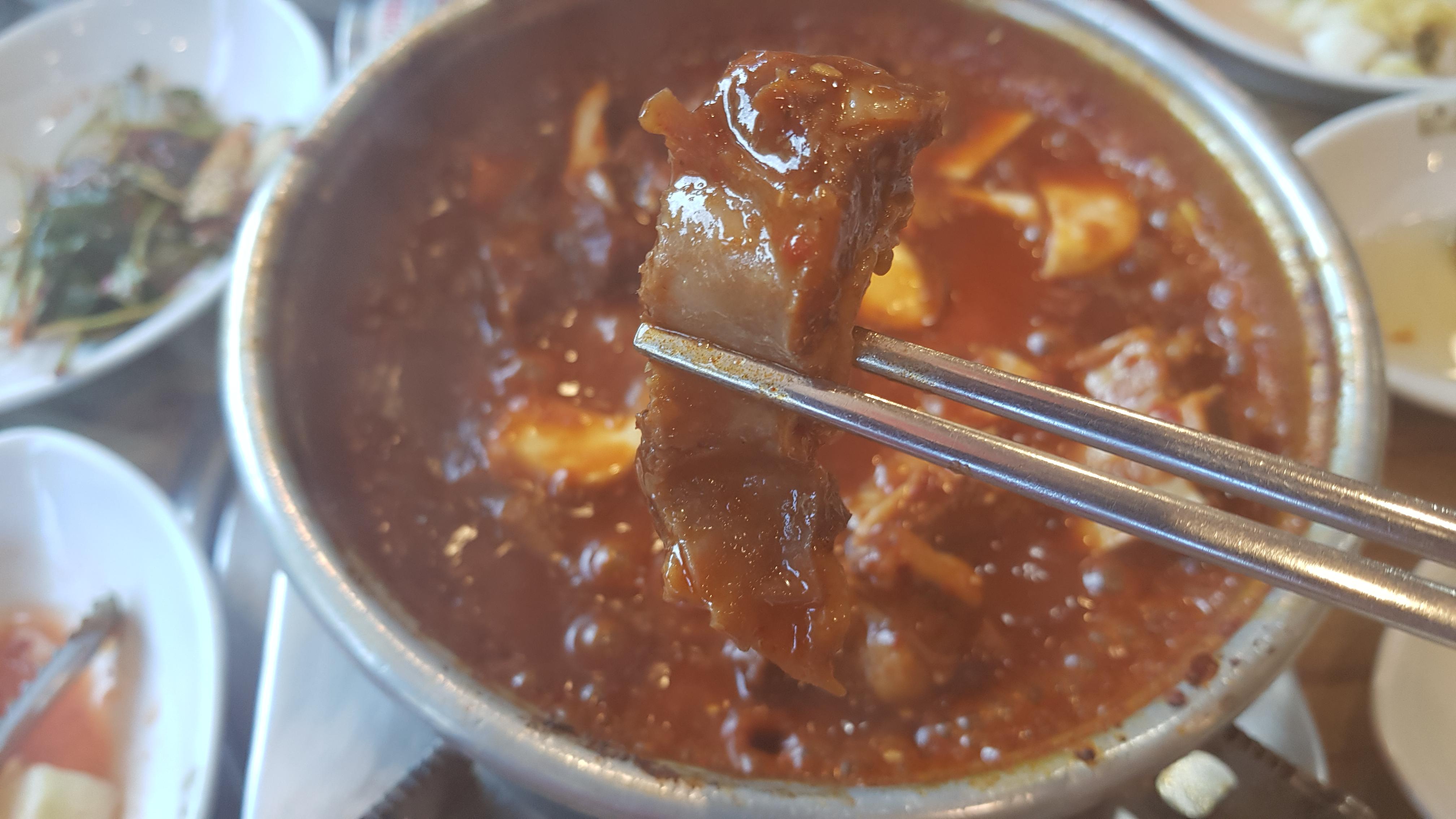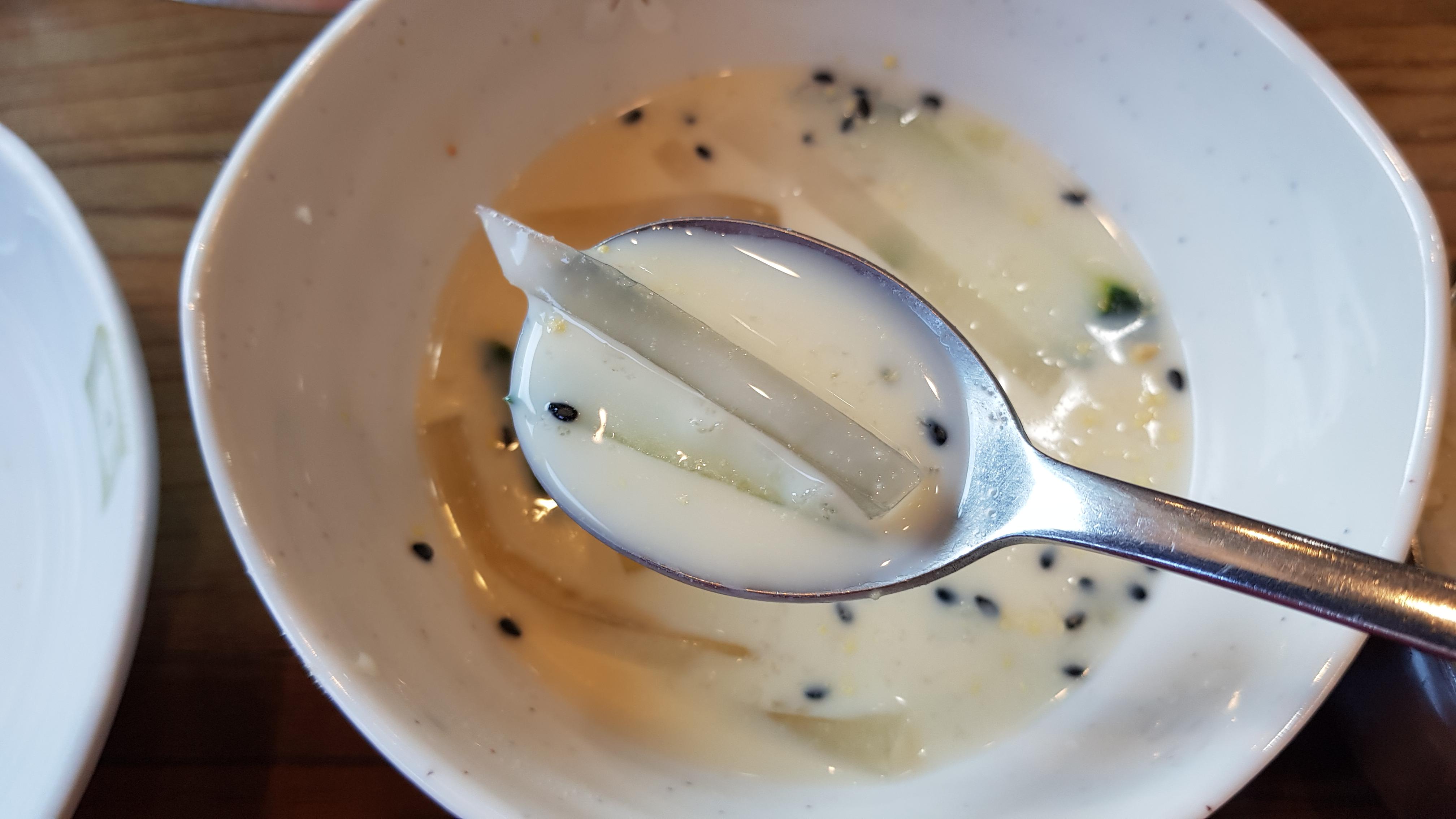 찜갈비를 먹기전 먼저 에피타이저로 몇수저 떠먹어 보았다. 이름은 모르겠지만 묽은 콩국물에 곤약이 들어있었는데 식전에 먹기 좋게 간이 되어있었고 곤약의 부드러움이 입안에서 살짝 감돌다 목으로 넘어가는 느낌이 괜찮았다.