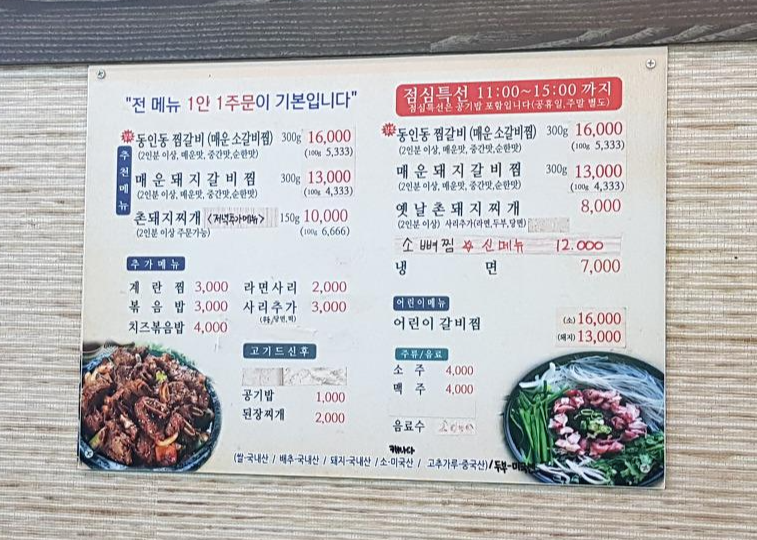 들어가면 메뉴판은 따로 주지 않고 홀 내부에 걸려있는 메뉴판을 보고 주문하면 된다. 동인동 찜갈비 중간맛으로 2인분을 주문했다. 우리가 주문한 시간은 3시 전이라 점심특선으로 주문이 가능했고 공기밥이 포함해서 나왔다.