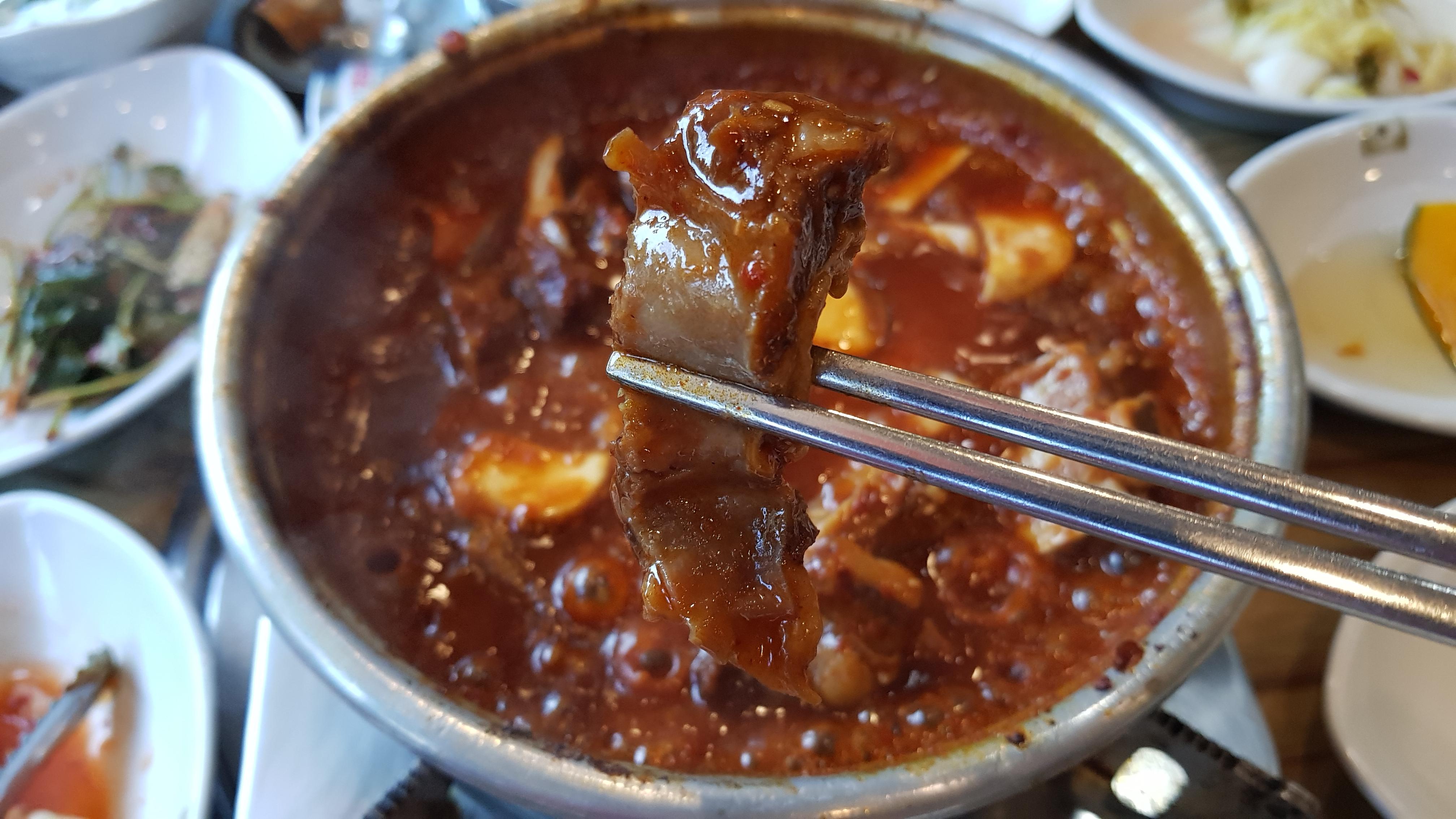 갈비가 푹 익혀져서 살이 쏙쏙 잘 발라진다. 사진상 양념이 많이 매워보이지만 중간맛으로 주문을 했으며 먹기에 딱 좋은 정도였다.
