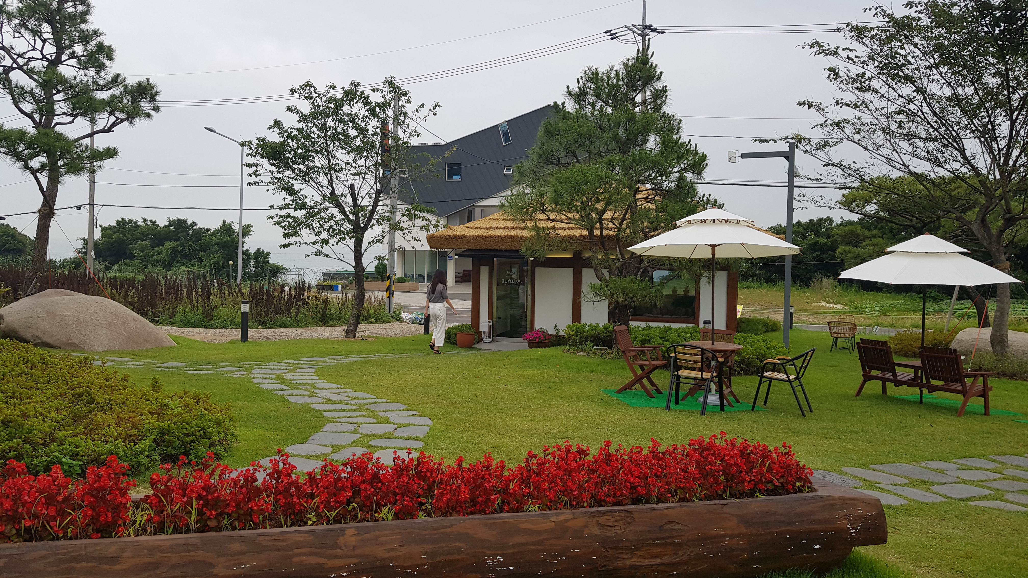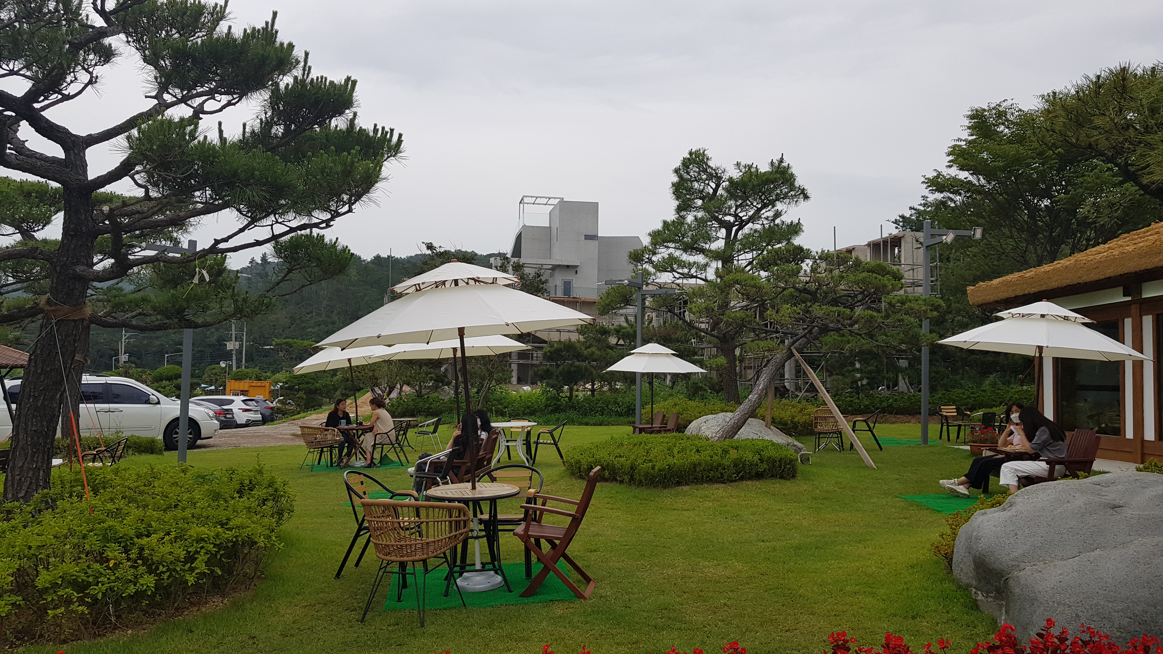 주차장에서 보이는 카페 건물로 걸어올라간다. 잔디가 깔려 있는 정원에 아외테이블마다 펼쳐져 있는 하얀파라솔이 눈에 띈다.