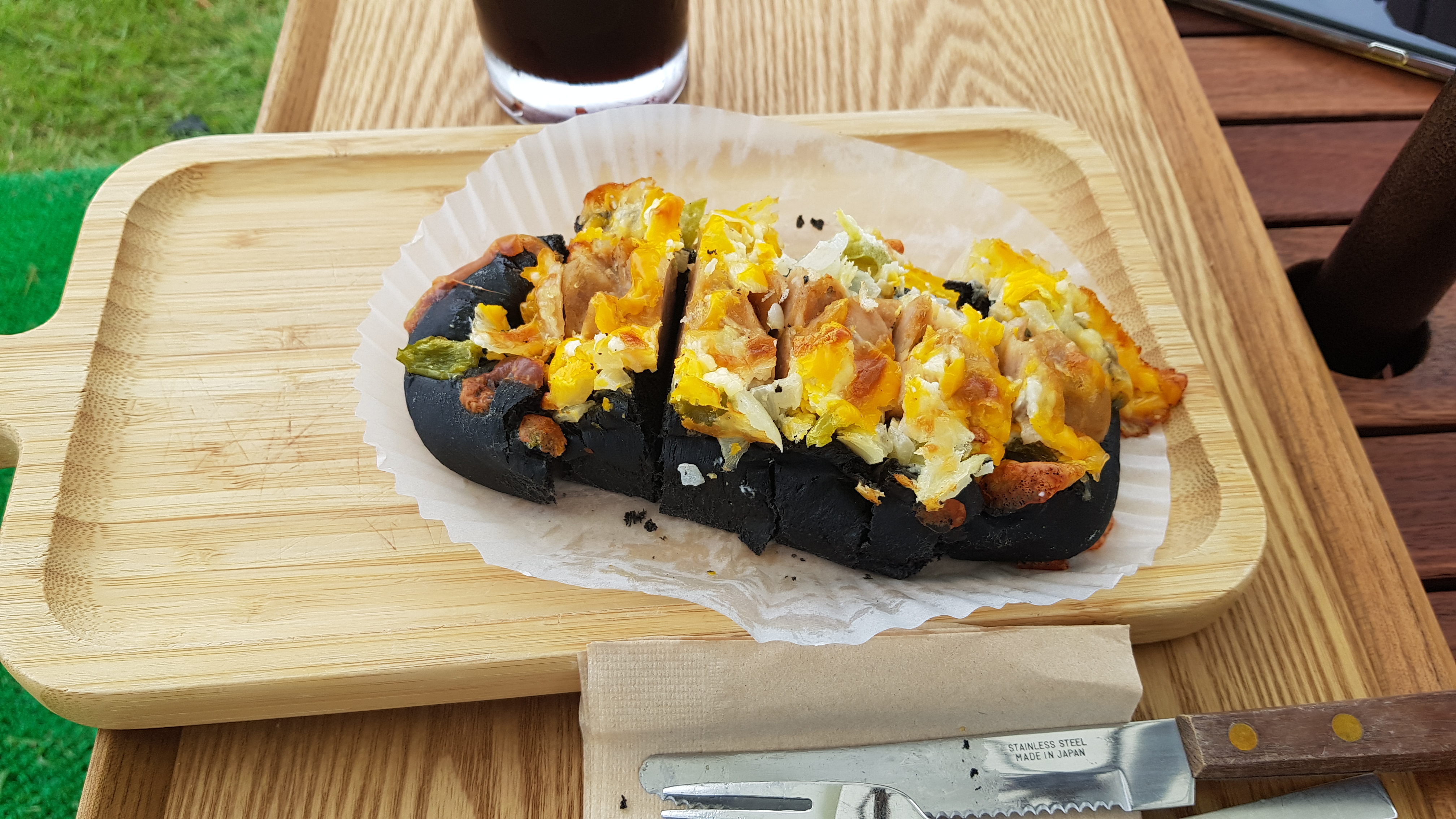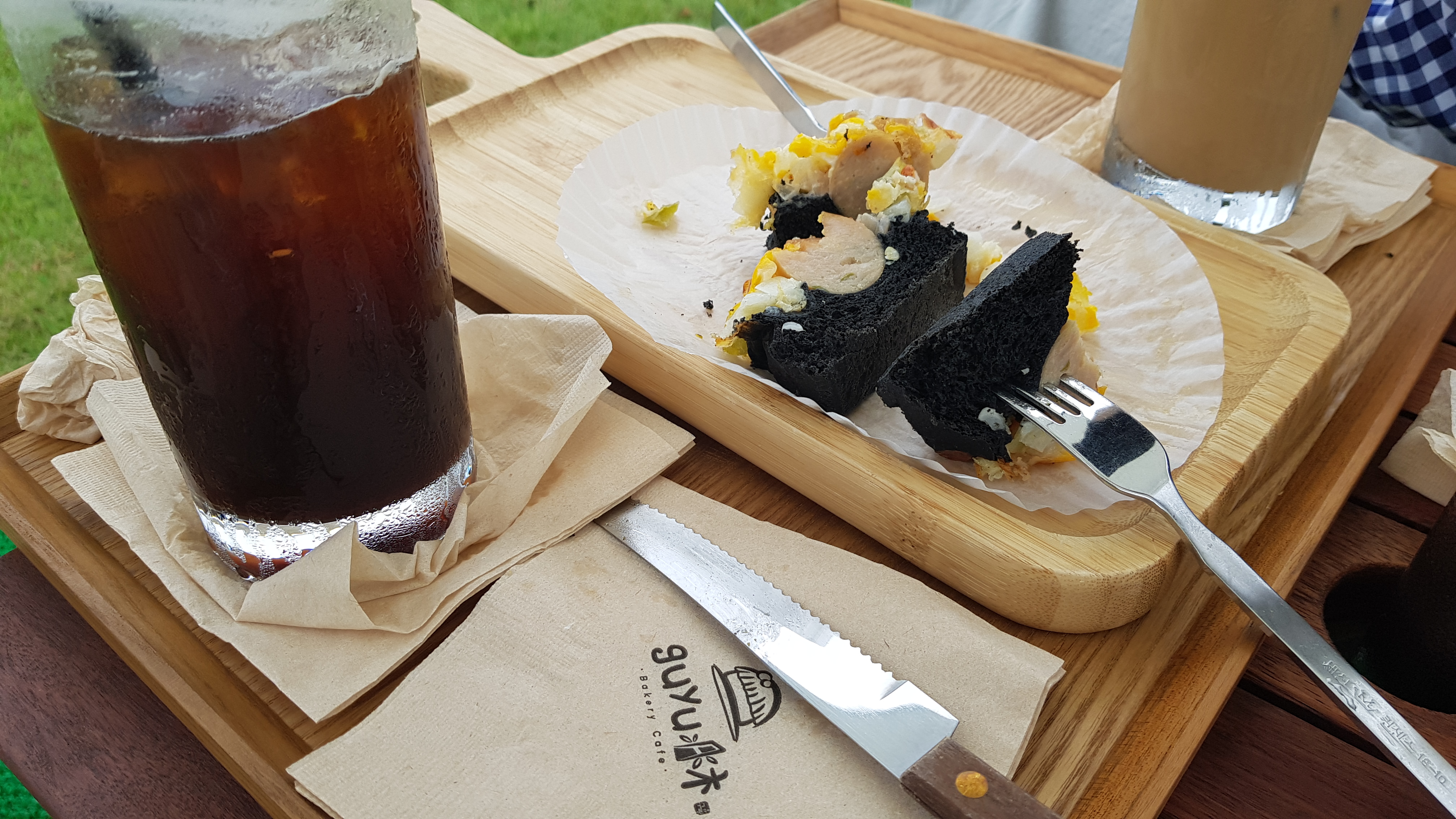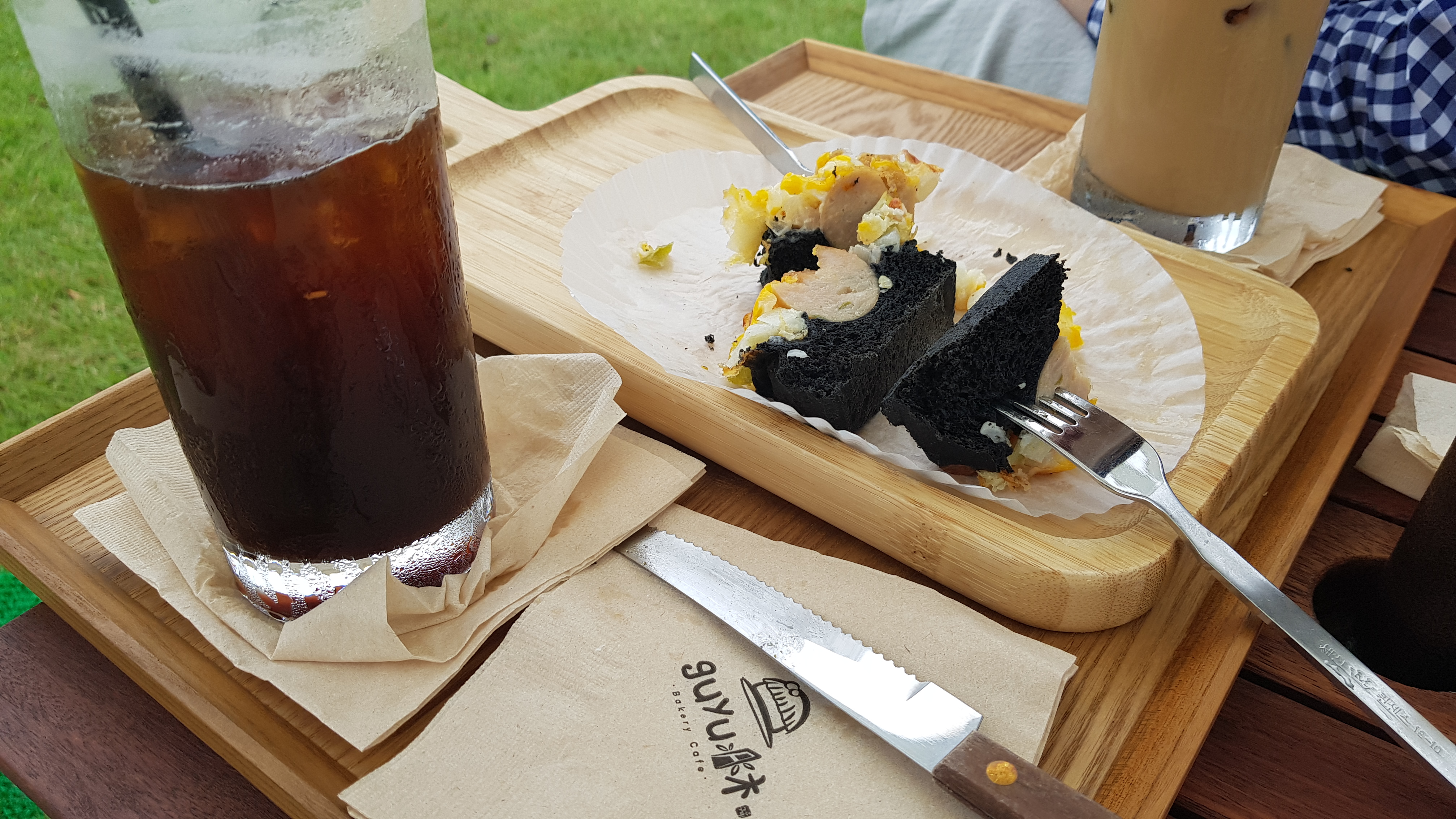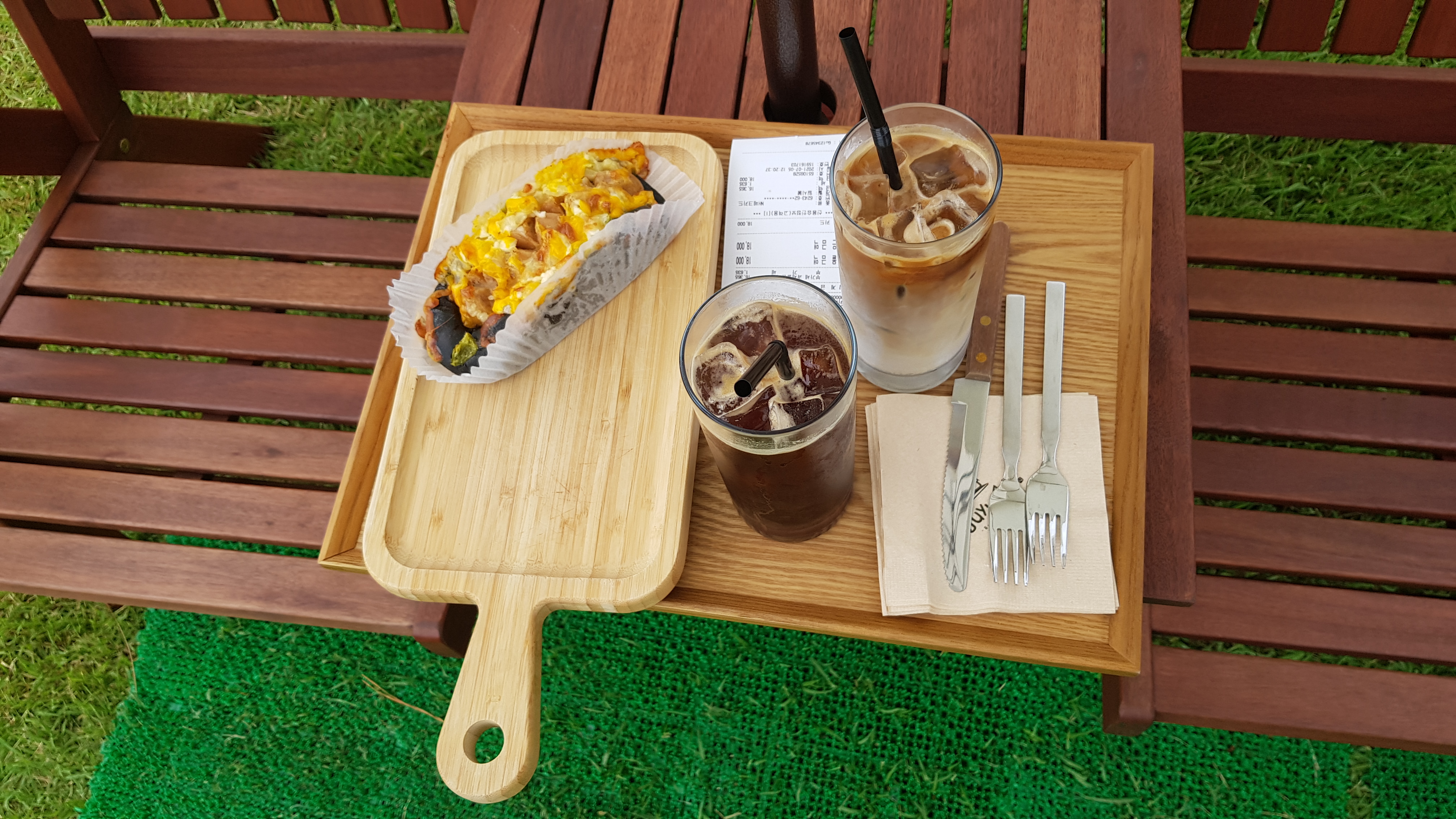시원한 커피와 매콤한 먹물빵을 탁트인 야외테이블서 즐길차례다.