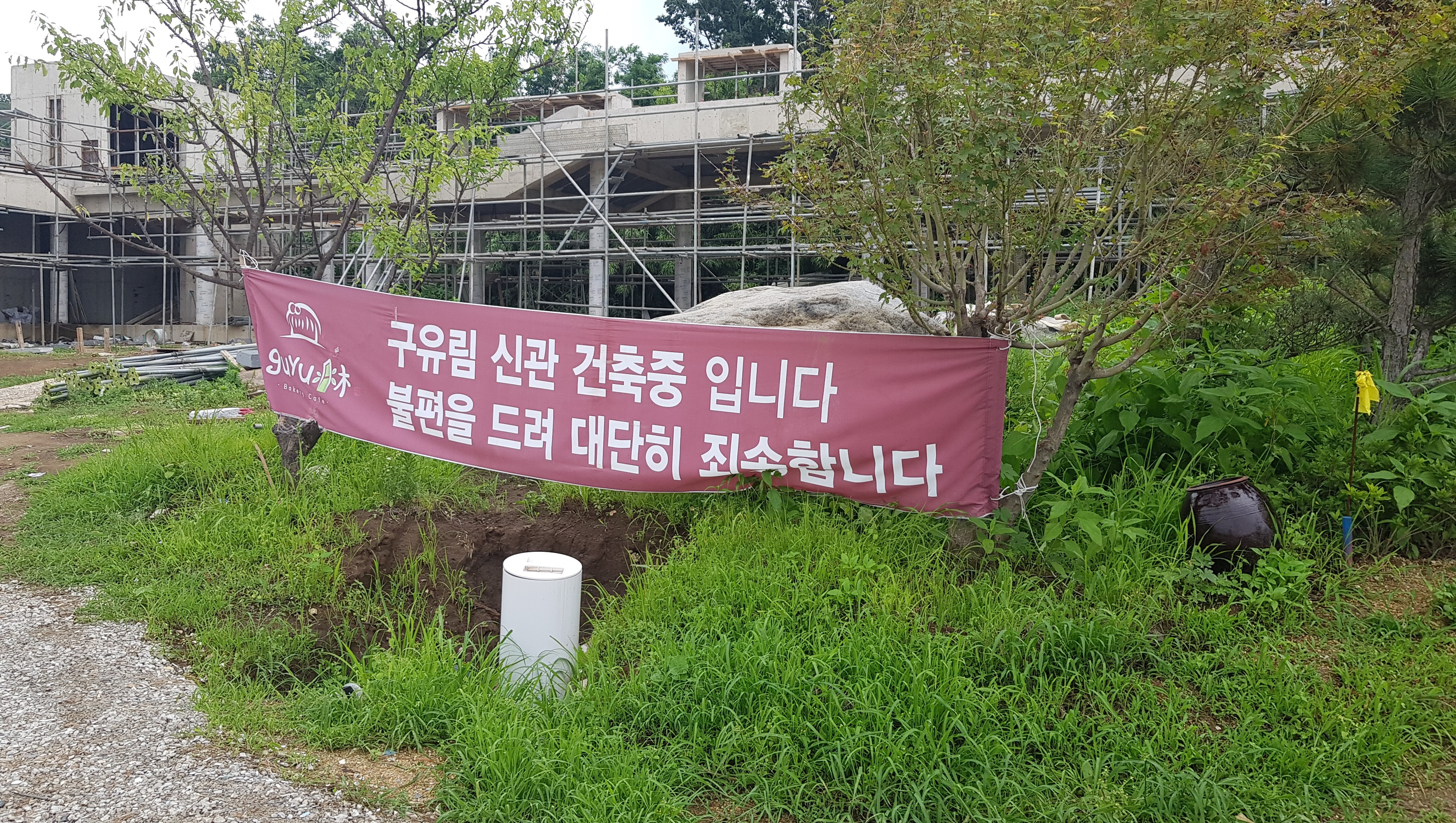 주차장 위쪽으로 공사중인 건물이 보이는데 구유림 신관 건축중이라는 플랜카드가 걸려있다.