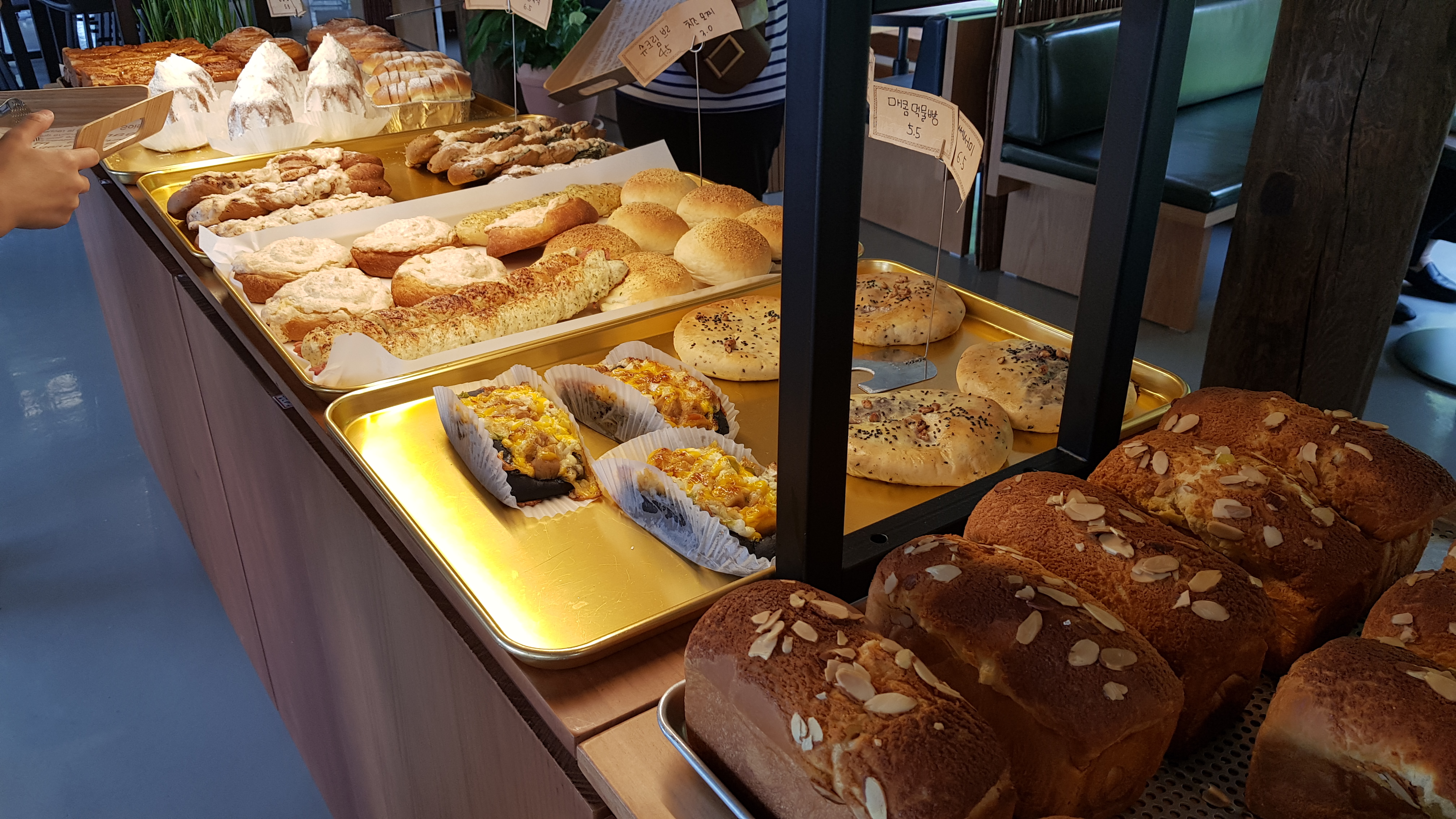 구유림 카페 문을 열고 들어가면 먼저 열체크와 QR 체크인을 하고나서 빵 트레이가 놓인 테이블이 보인다. 베이커리 카페 답게 카운터보다 베이커리가 놓여진 진열대가 먼저 있다.