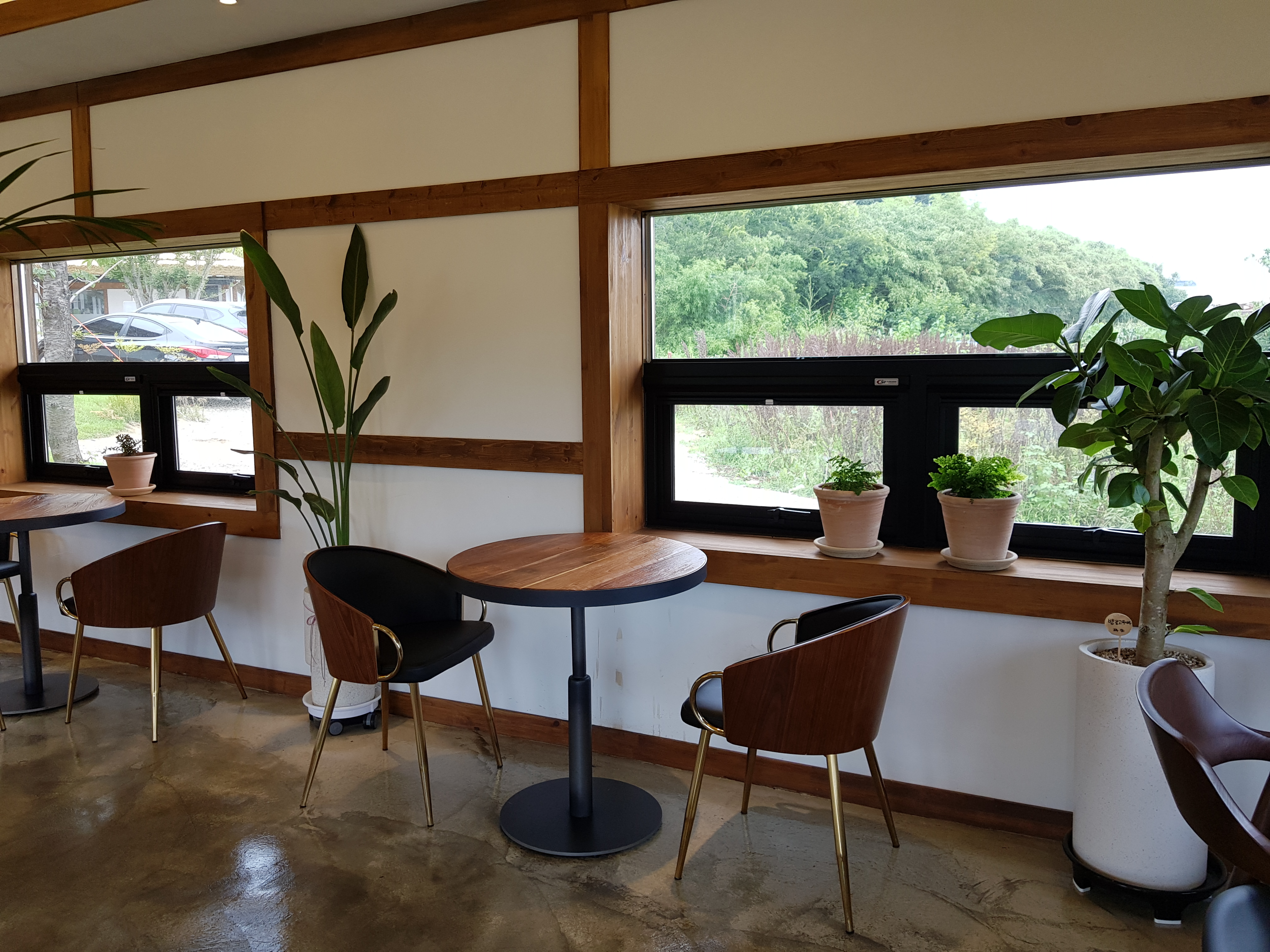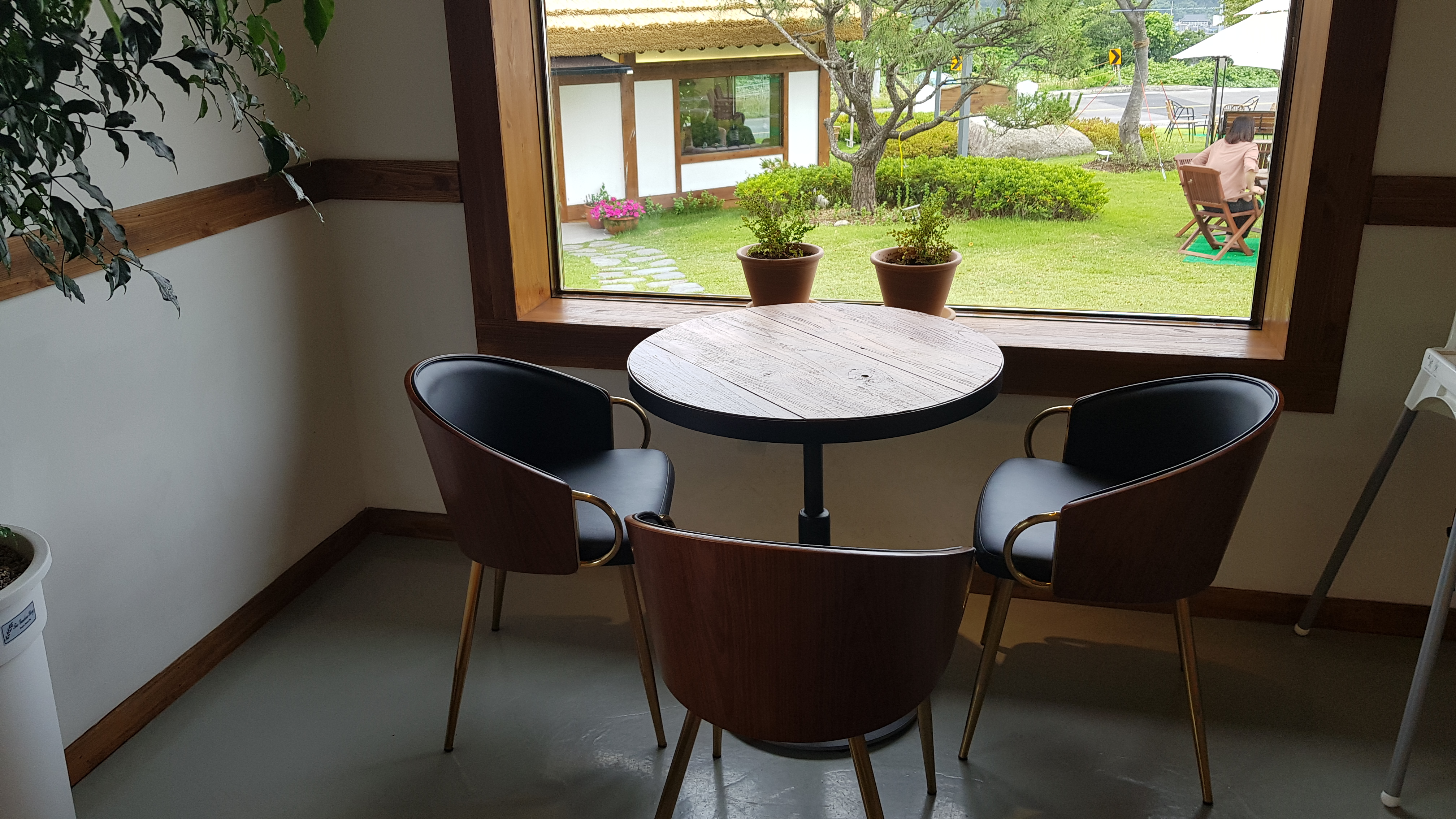 카페 실내 테이블에서 창문을 통해서 본 정원. 시원한 통창이 큰 액자처럼 보인다.