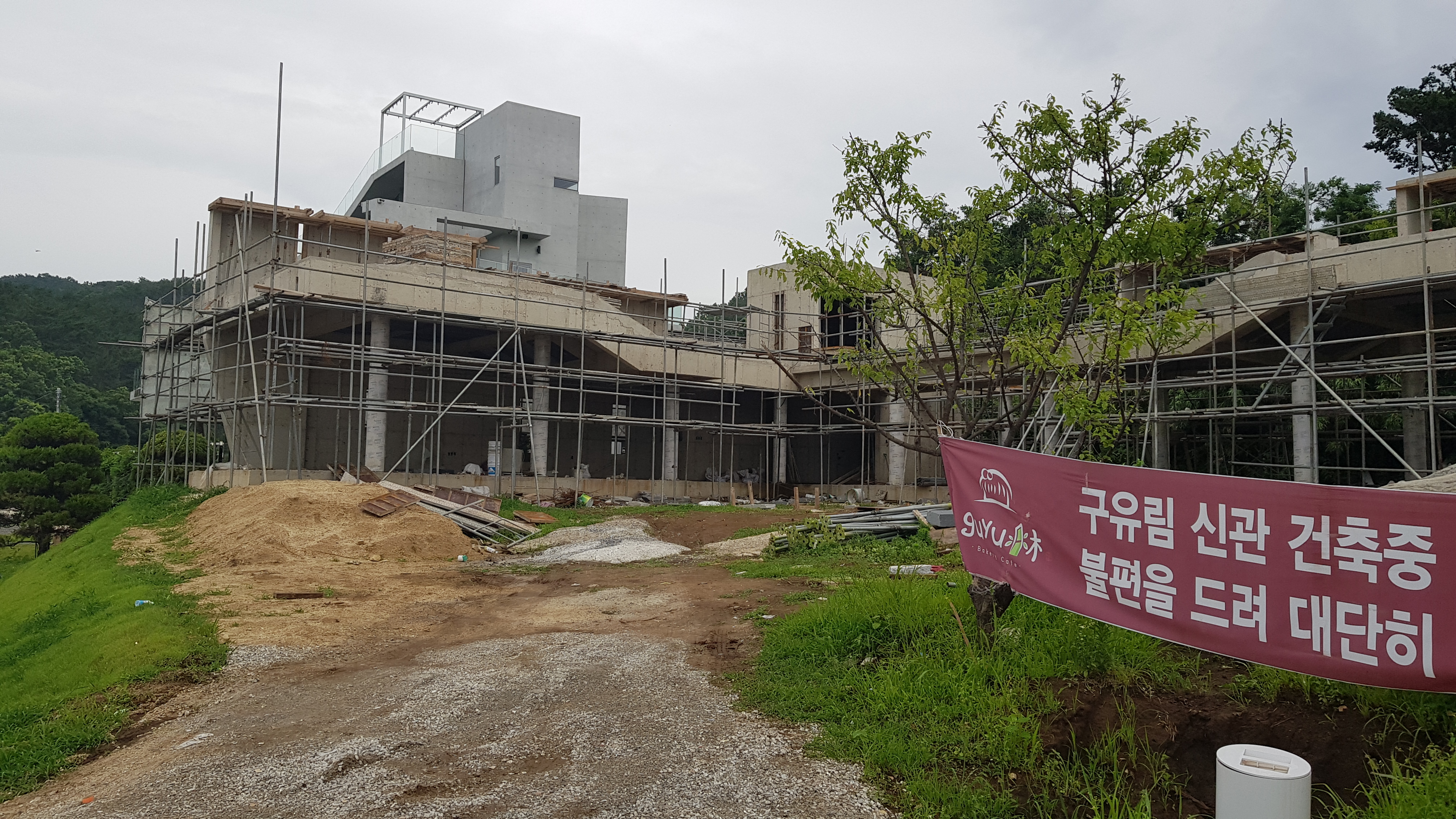 주차장 위쪽으로 공사중인 건물이 보이는데 구유림 신관 건축중이라는 플랜카드가 걸려있다.