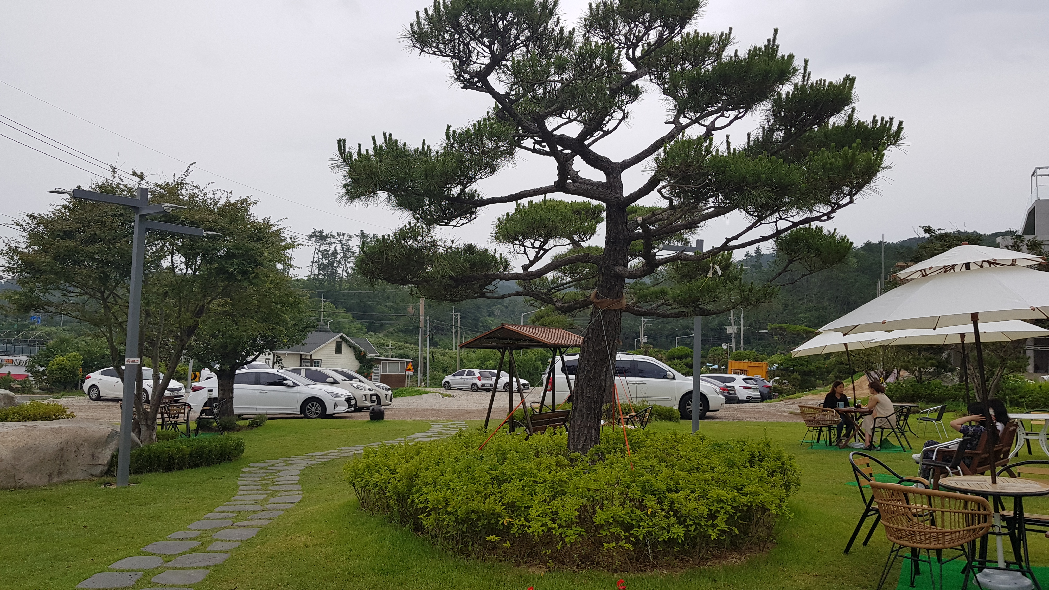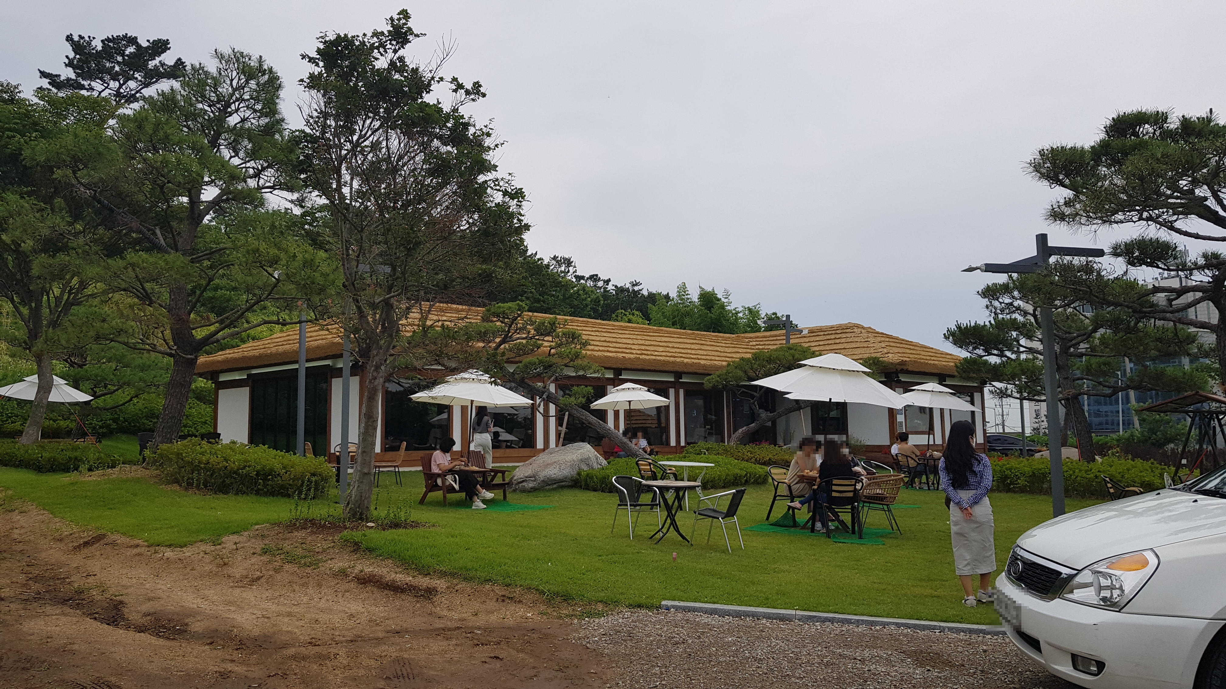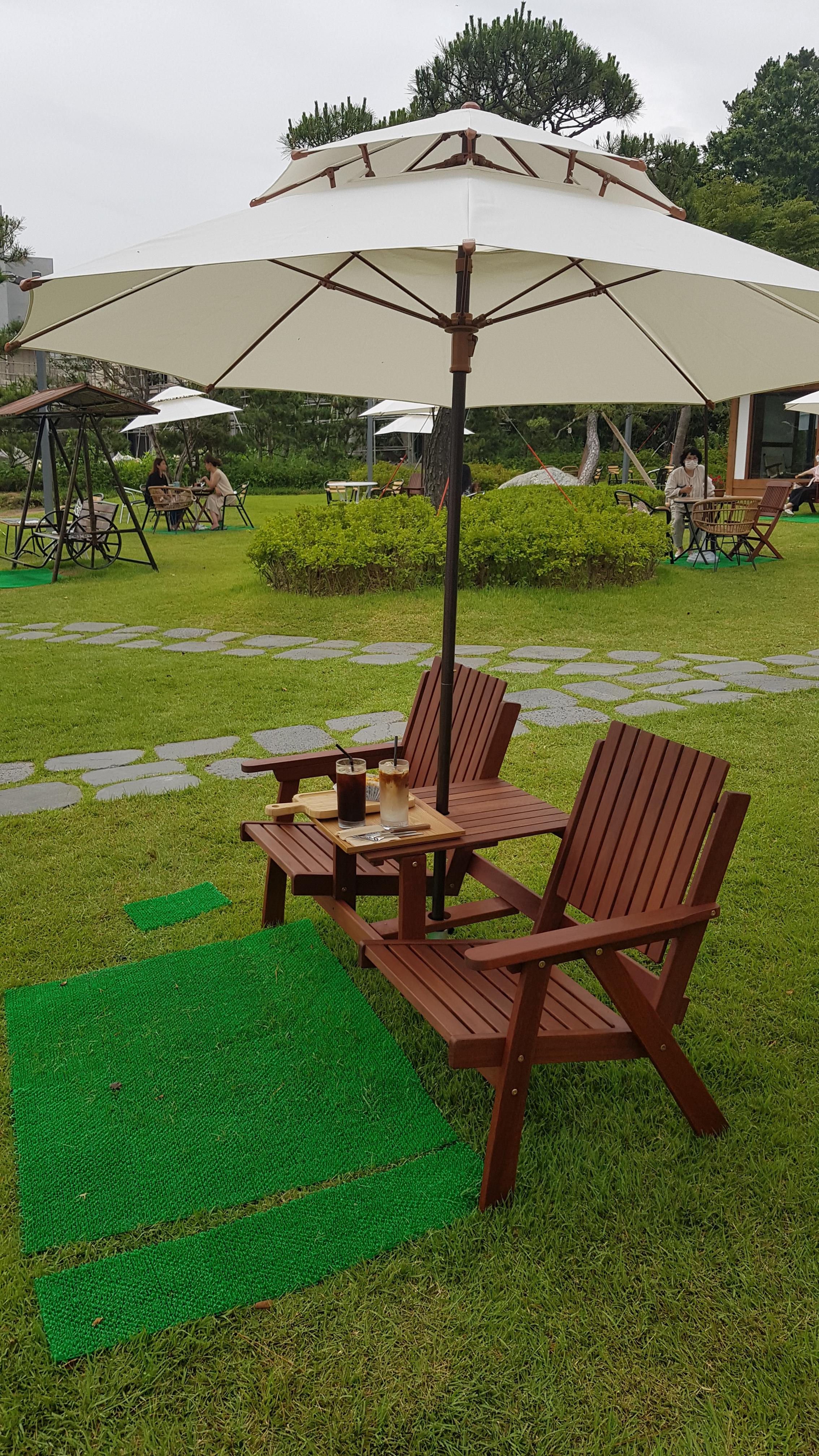 주차장에서 보이는 카페 건물로 걸어올라간다. 잔디가 깔려 있는 정원에 아외테이블마다 펼쳐져 있는 하얀파라솔이 눈에 띈다.