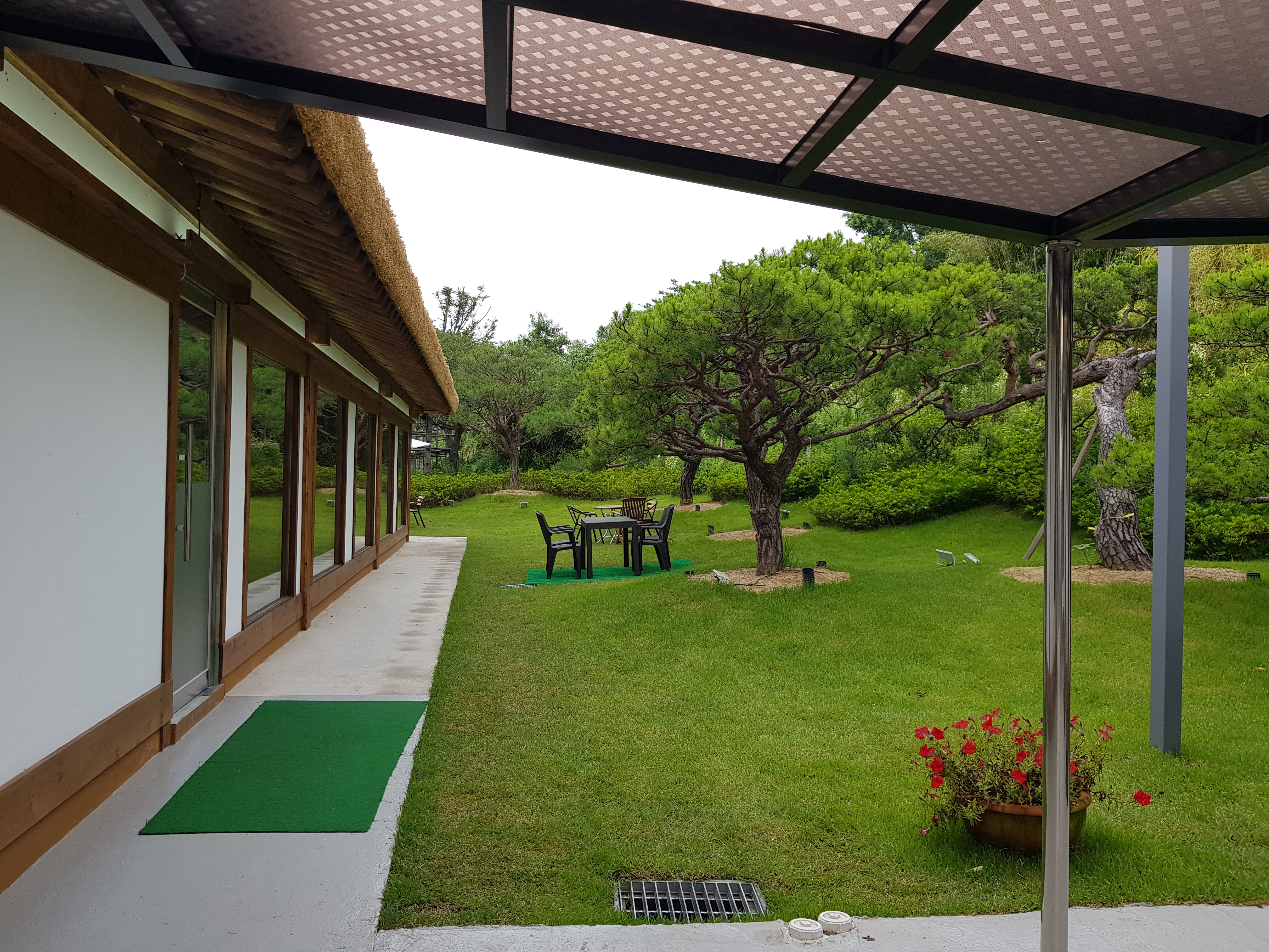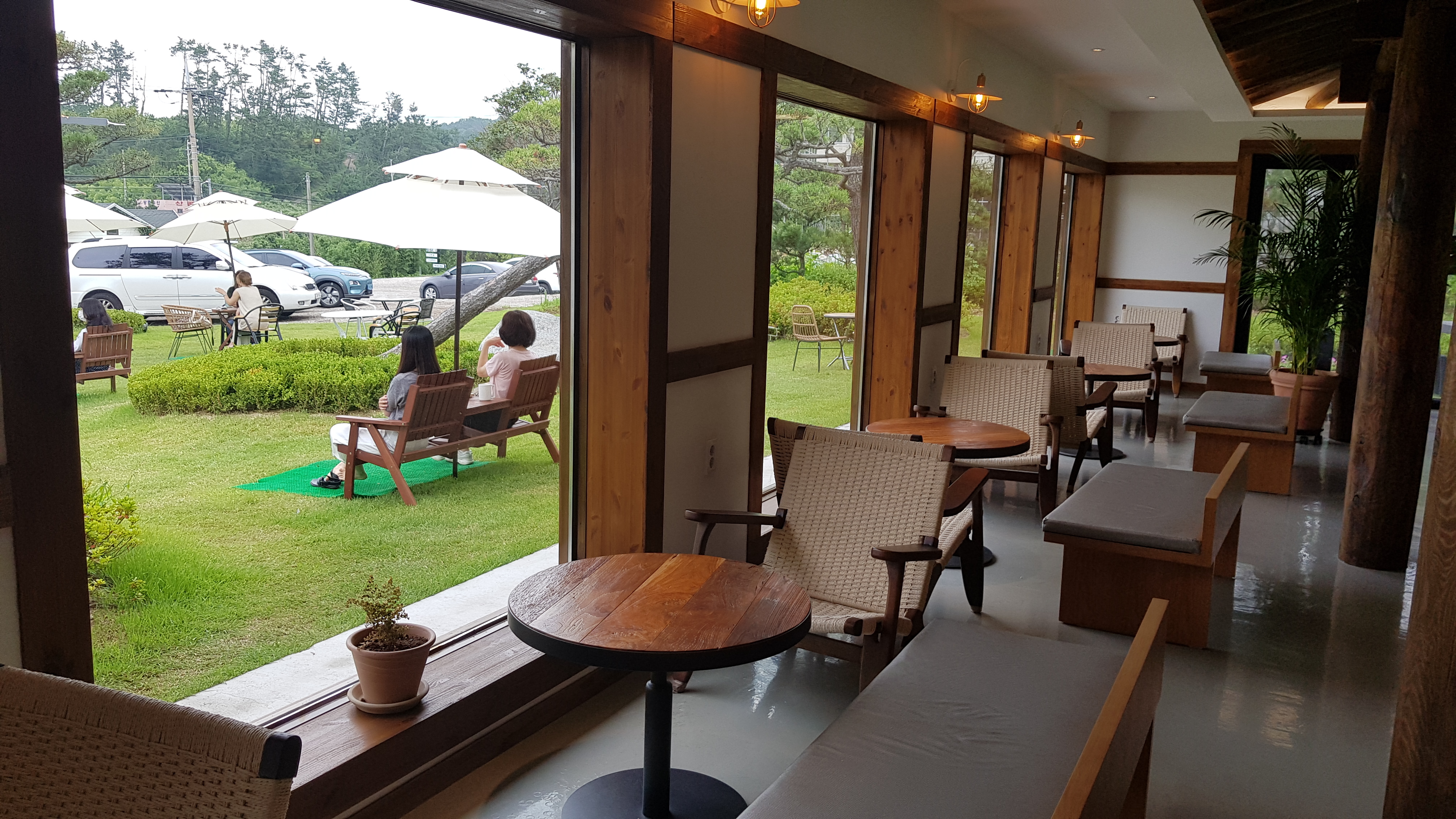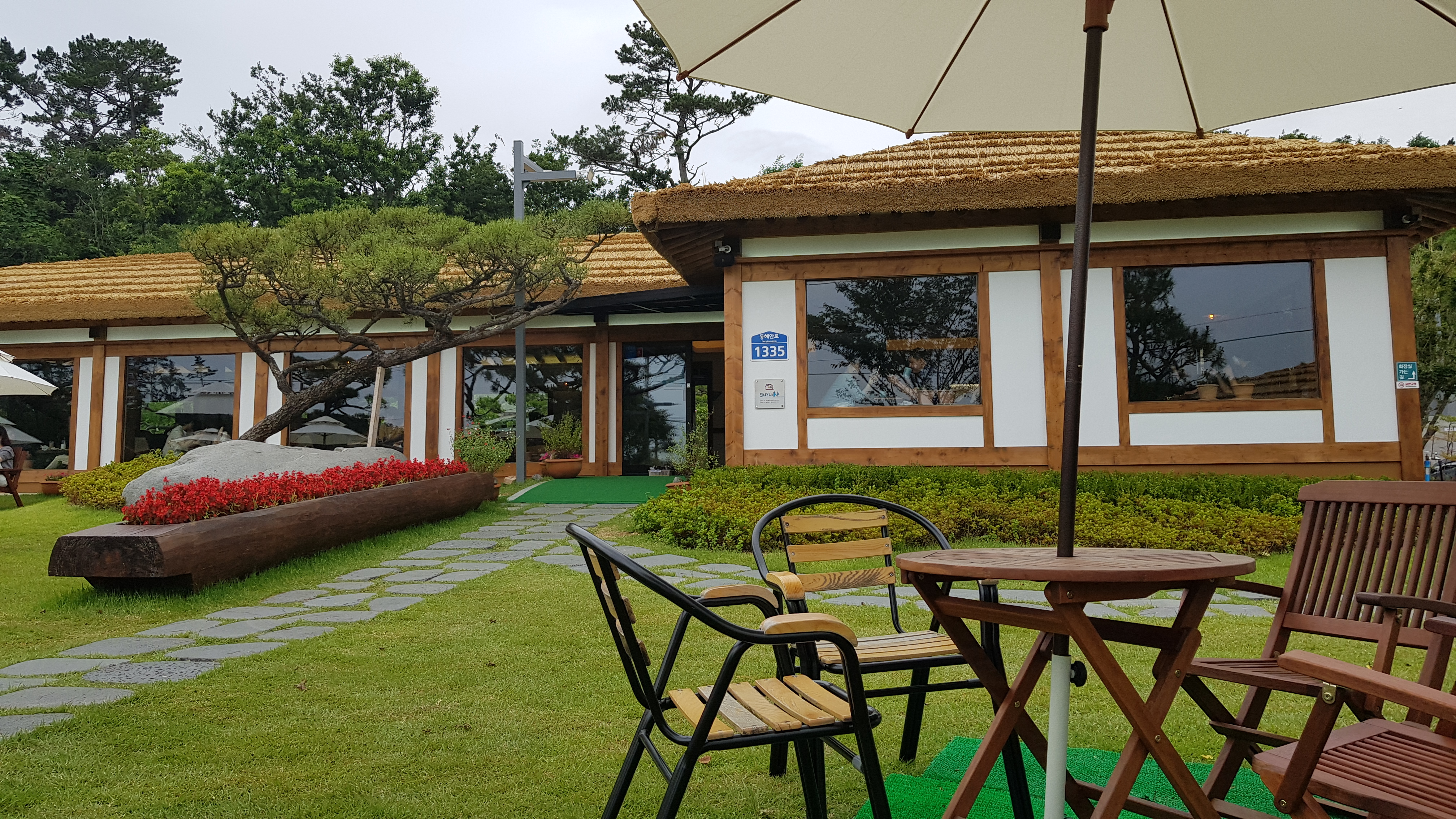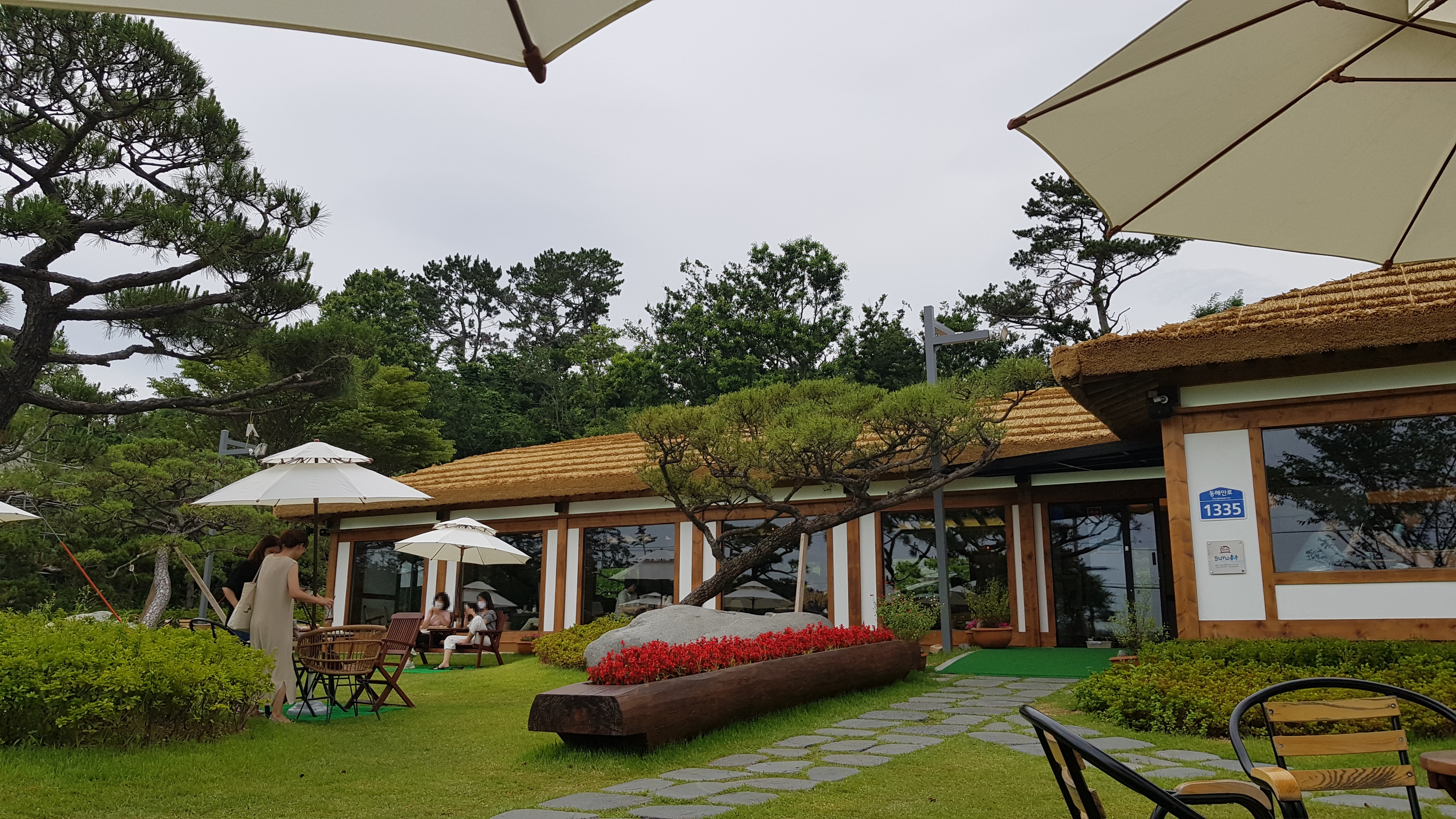주차장에서 보이는 카페 건물로 걸어올라간다. 잔디가 깔려 있는 정원에 아외테이블마다 펼쳐져 있는 하얀파라솔이 눈에 띈다.
