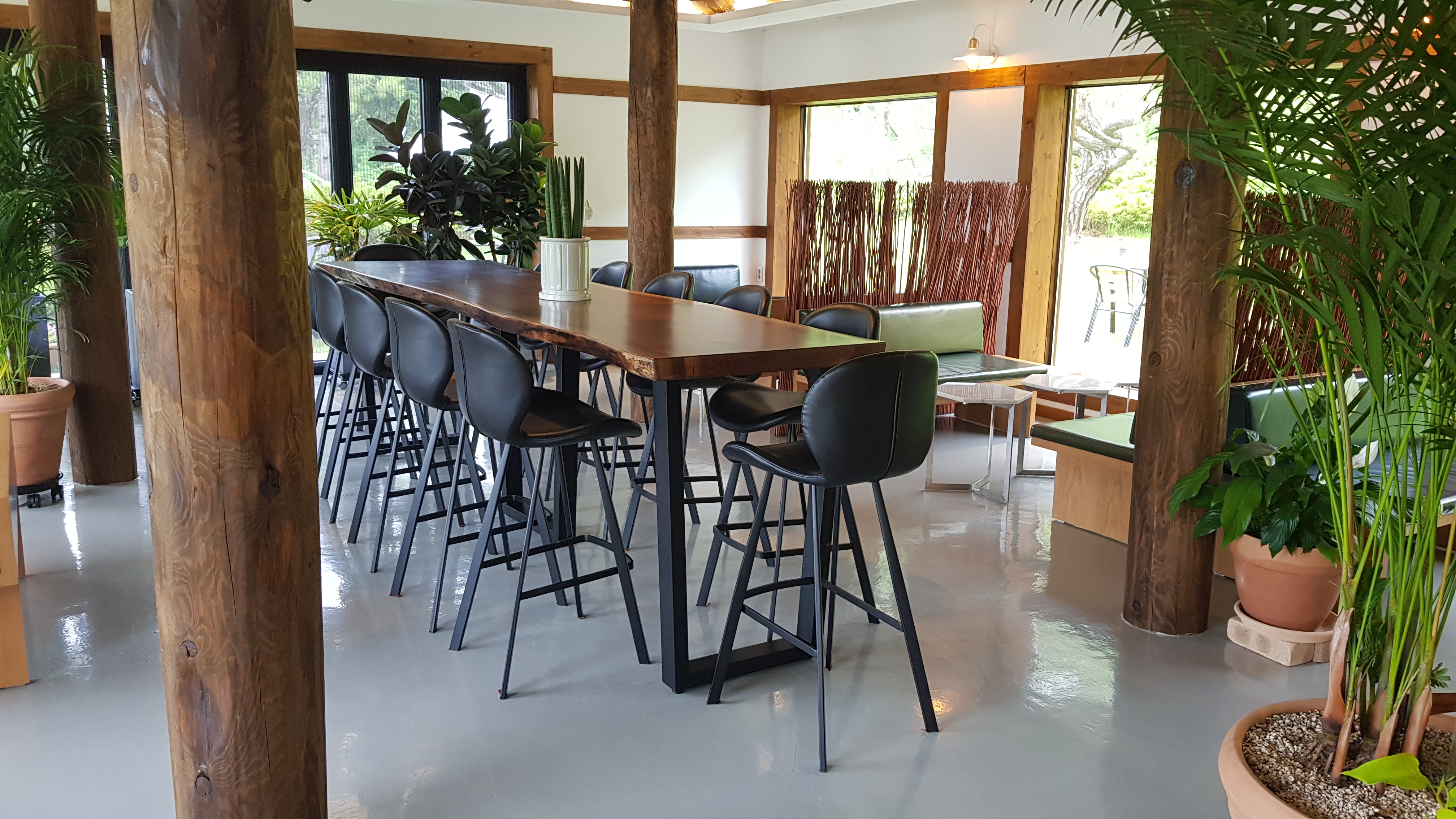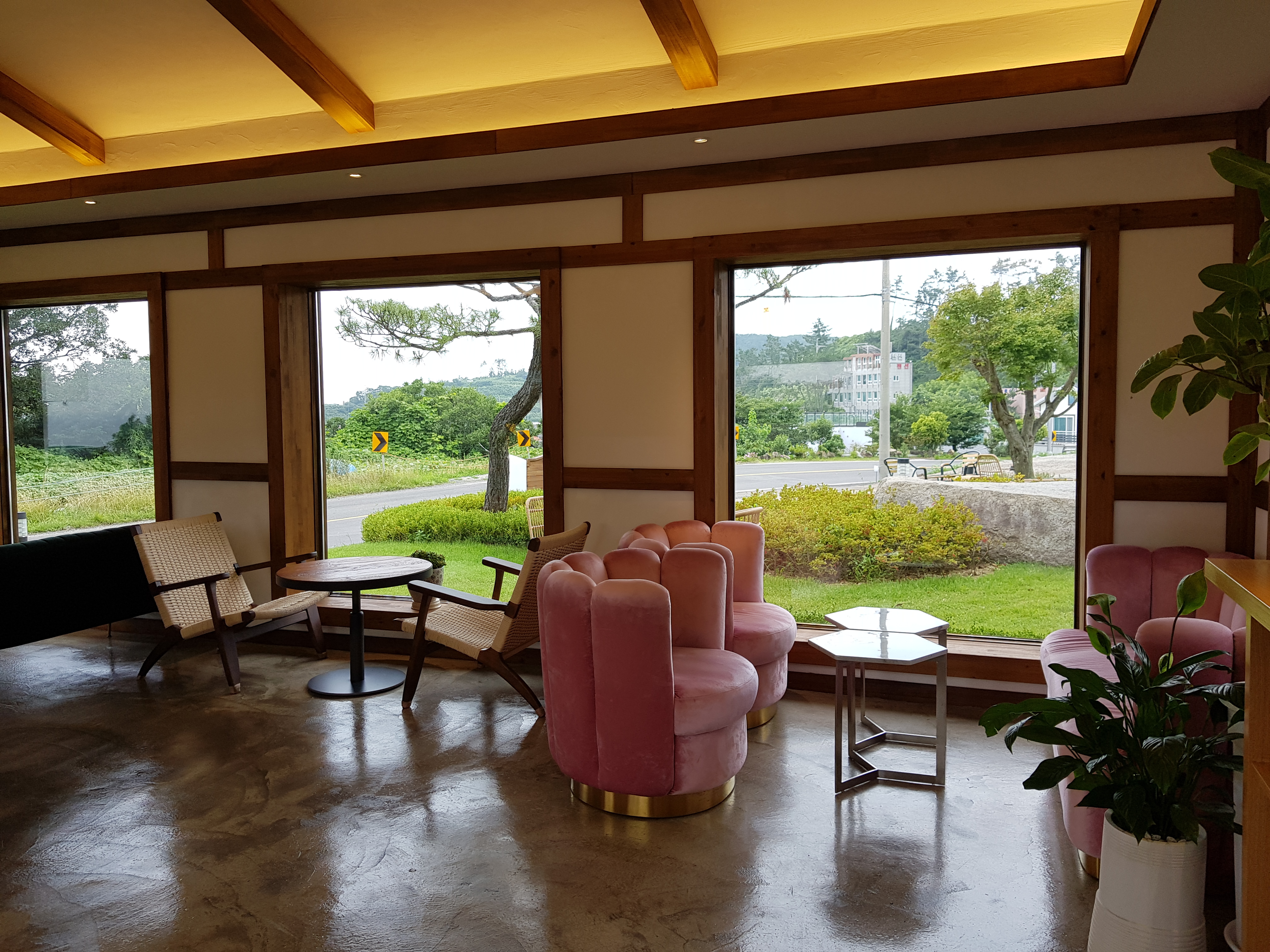 카페 실내 테이블에서 창문을 통해서 본 정원. 시원한 통창이 큰 액자처럼 보인다.