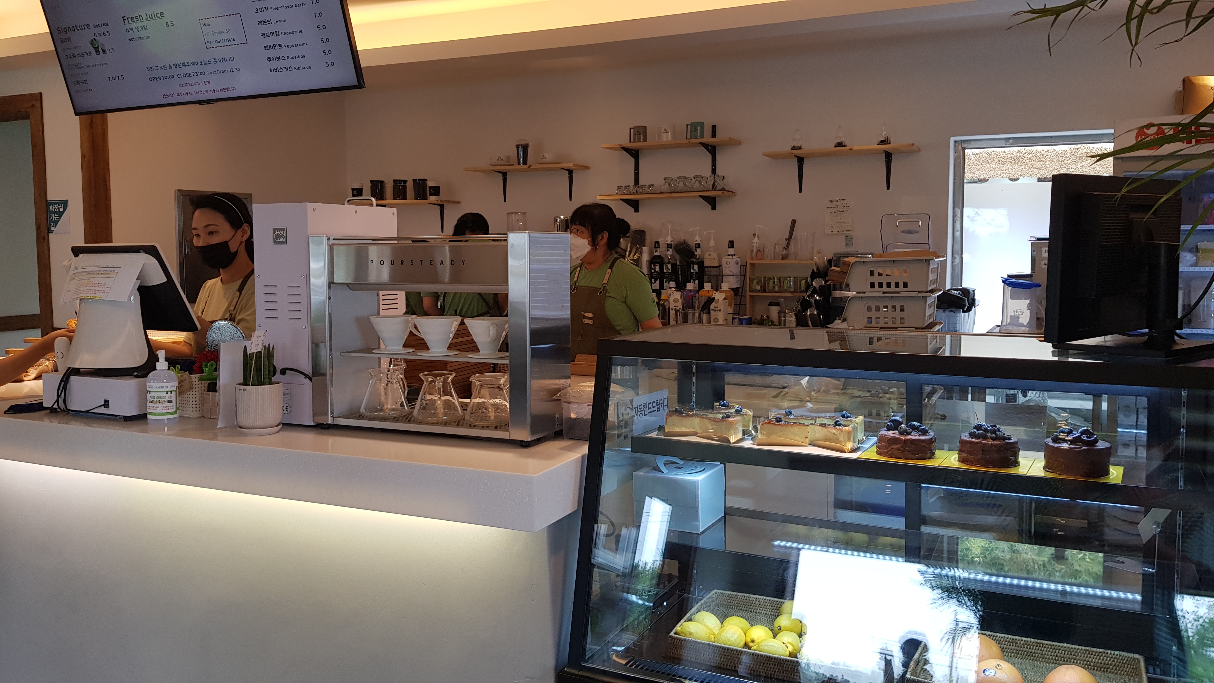 카운터에는 3명의 직원분이 분주히 주문도 받고 주문 받은 커피를 내리고 있다.